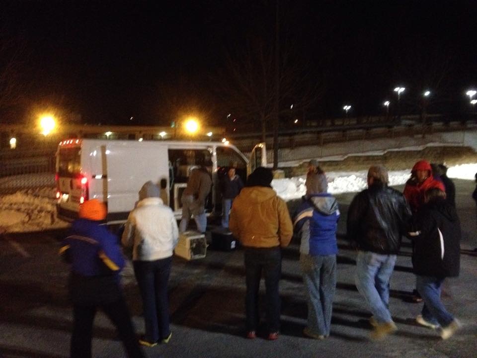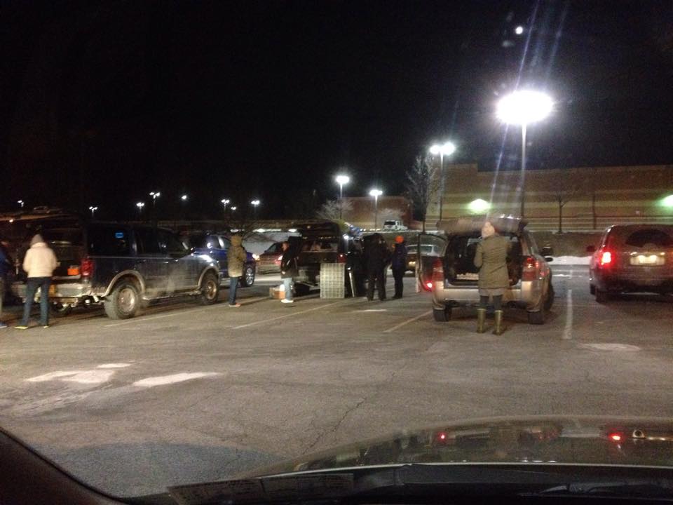 Finally, at 10 we took off for Pikesville. It was a balmy 5 degrees and I wondered what our little southern girl would make of that. Nick asked how we would find the OPH crowd, but when we pulled in the bowling alley parking lot it was immediately evident. There were a multitude of SUVs with motors running, next to a streetlamp where a small group of eskimos chatted, handing out dog crates, bags of bedding and food, even cookies, oblivious to the cold.