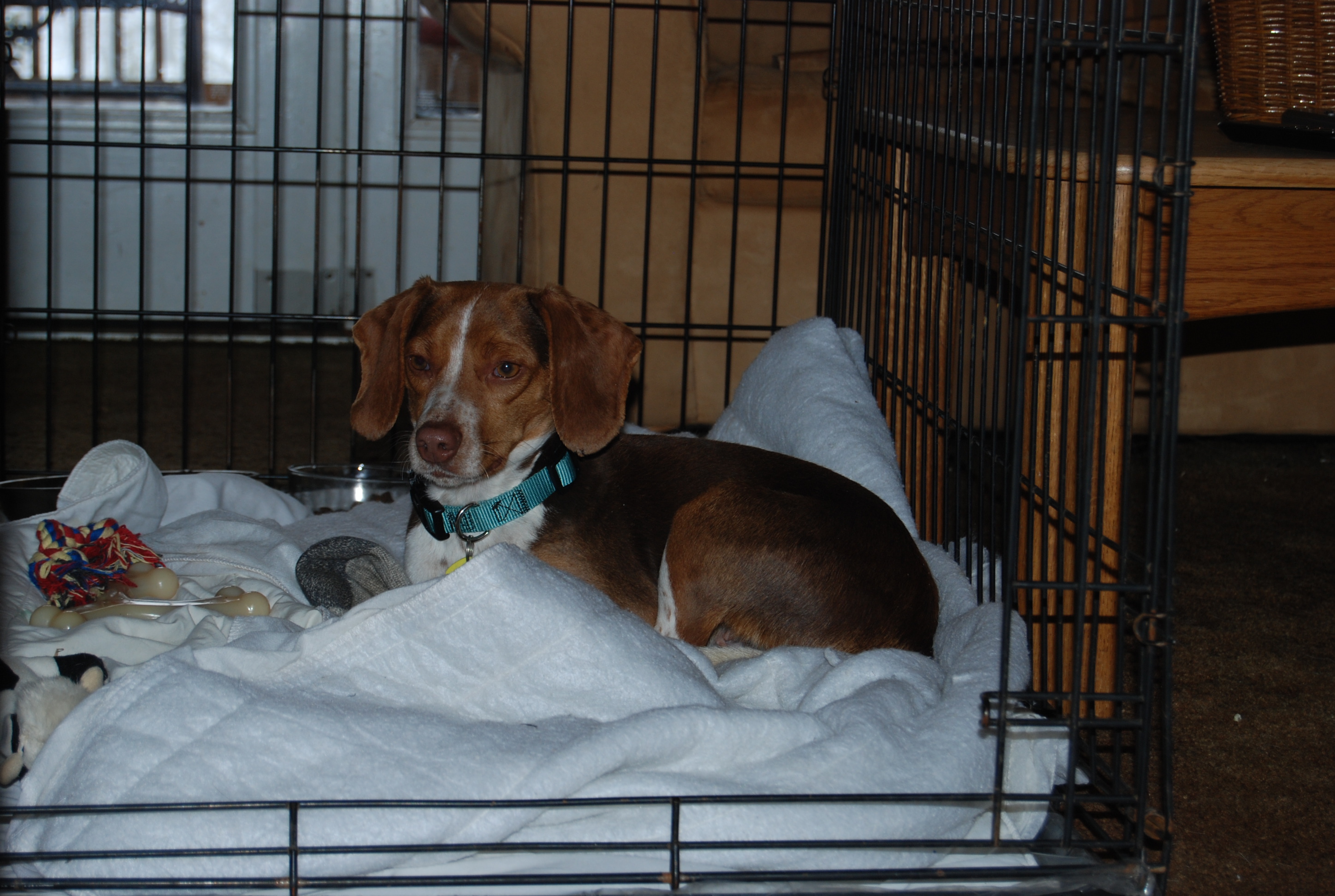 Thank goodness for the crate. It makes it possible for all of us to have a break. (If only it had been that easy when my kids were toddlers.) Galina is happy in her crate with its stash of collectibles – five of Ian’s dirty socks, one of Gracie’s toys, a cloth napkin from the kitchen, and the collection of toys meant for her. For a while she seemed to have an endless supply of plastic wrap but we finally figured out she was ripping the plastic cover off the base of the crate.