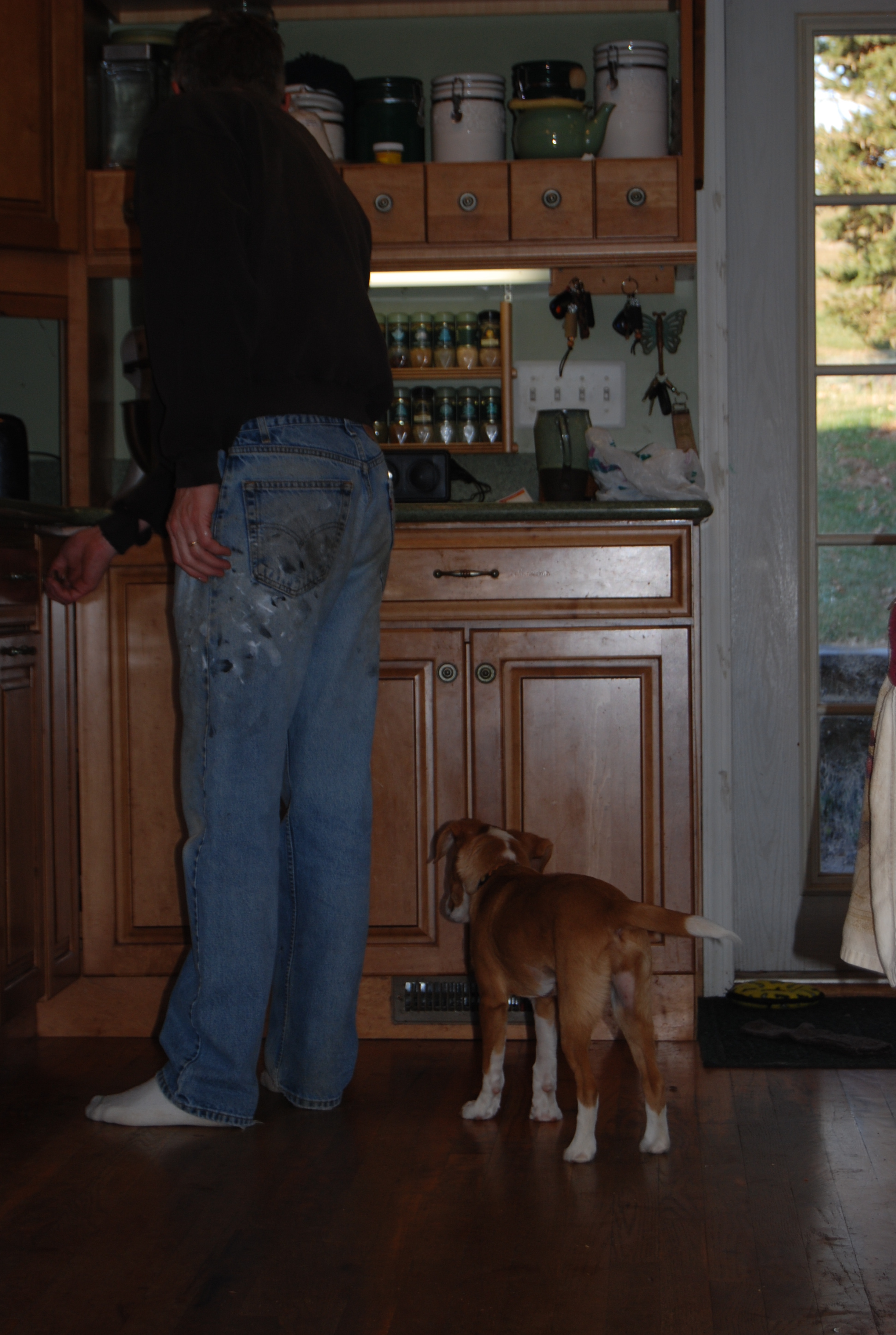 If she had to pick a favorite person in this household, for some reason, she has chosen my husband Nick. Which makes no sense to me at all since his was not the face that rescued her from the van of hell where she’d spent ten hours in a small crate with a dozen other much larger crates full of much larger dogs barking nonstop. He is also not the one who sat up with her at midnight in the strange little bathroom playing fetch with a tennis ball in an eight foot space for a good 20 minutes to dispel the pent up energy from the long ride. And he is not the one who feeds her three complicated meals a day or has already taught her to sit for treats. Plus, he’s the first person to grumble when she misses the puppy pad. Still, she lights up just a tiny bit more when he’s around and follows him with her feet or eyes if possible.