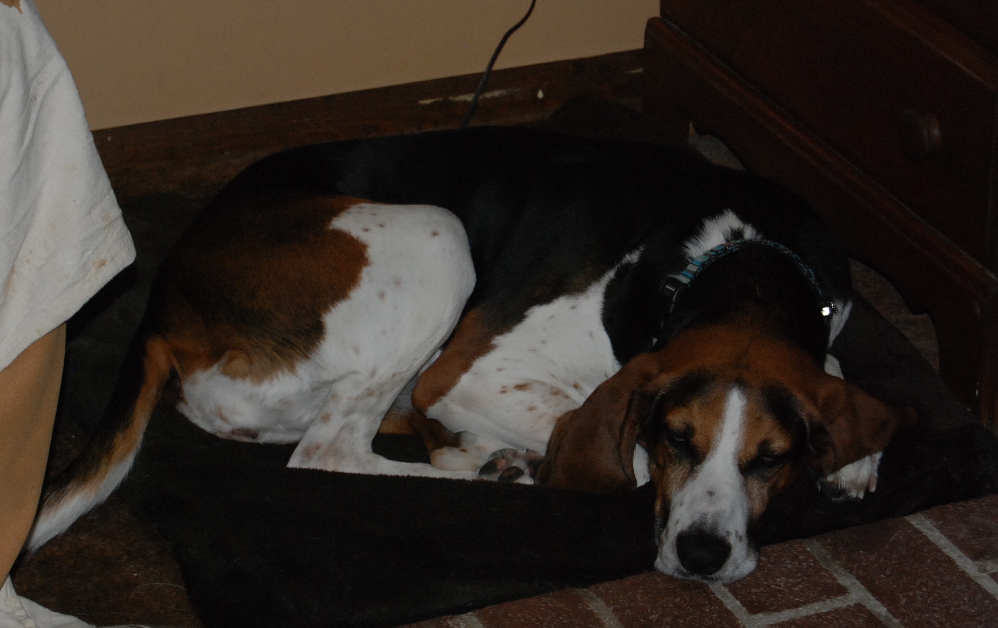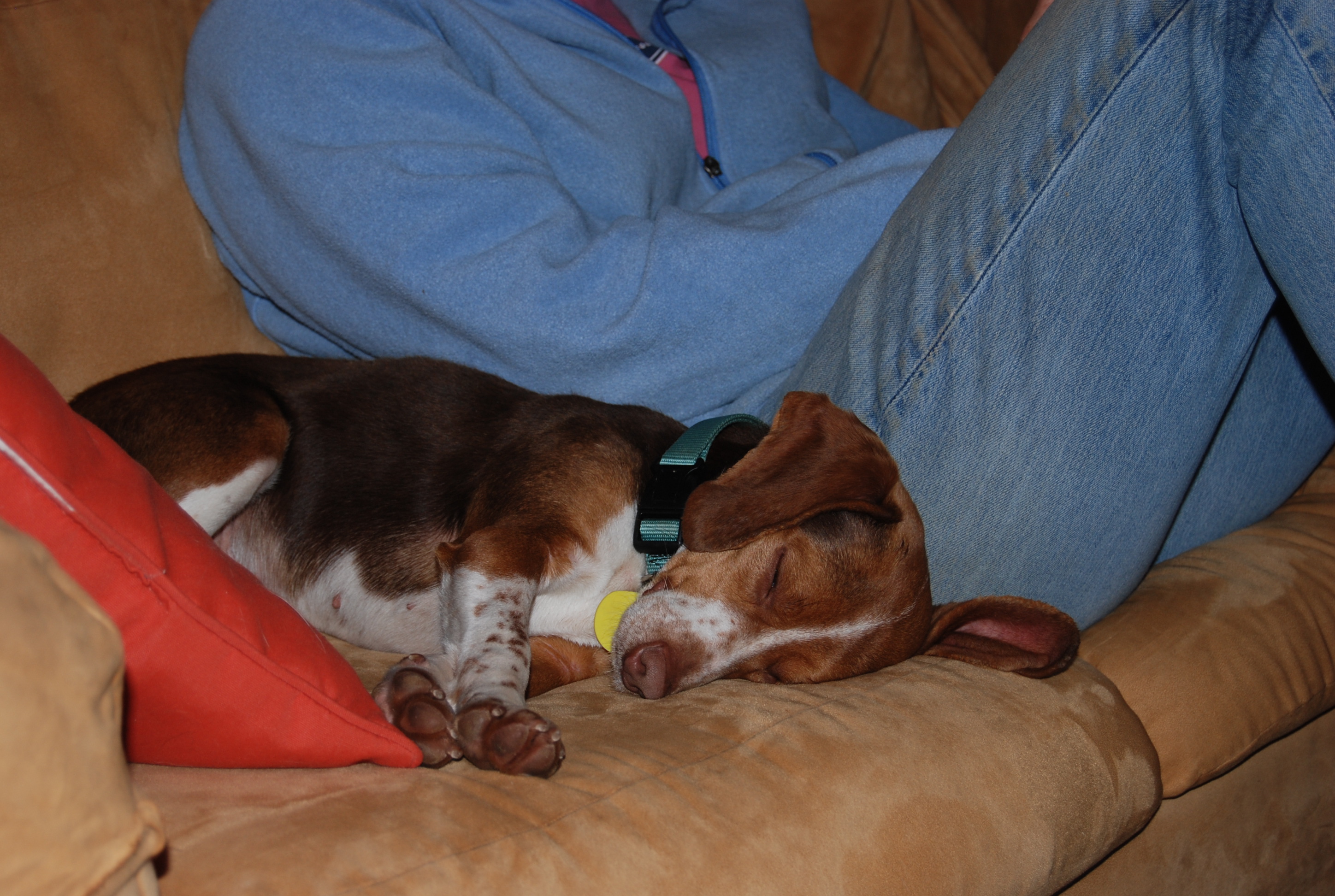 She tours the house periodically checking to see if anyone left a bedroom door ajar (she knows how to nudge a door open, so it better be latched!). Finding no comfier options, she’ll flop down on her bed or turn a few circles on the rug before settling down. I’m guessing this will be a lifelong training process.