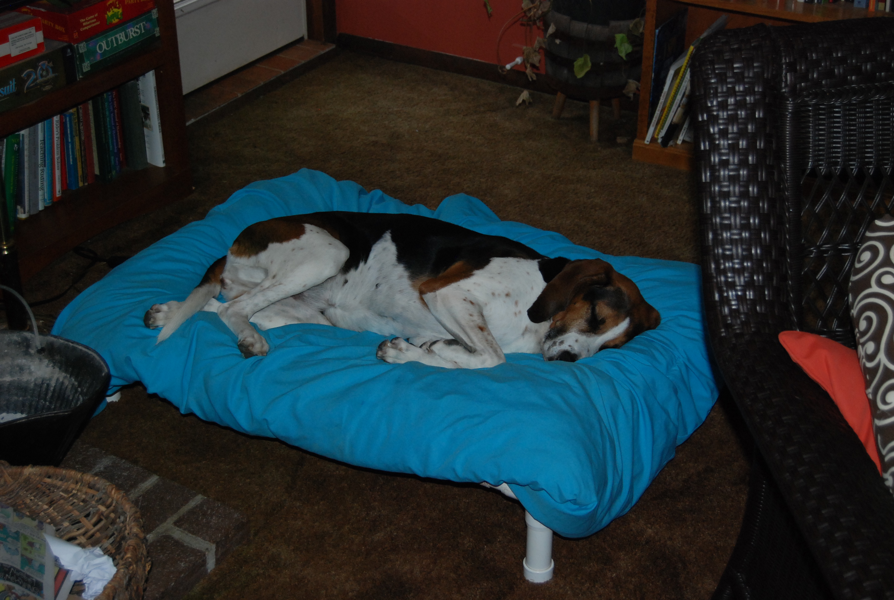 Training her to stay off the furniture is an ongoing task, but applying Brad’s rule has helped. My neighbor loaned me a really cool dog bed that actually hangs on a PVC pipe frame. That way Carla would be off the floor. I loaded it with blankets and a soft comforter to make it extra inviting. When we first installed it, she tested it out gingerly and spent the afternoon napping on it before going back to her Goldilocks ways.DSC_8420