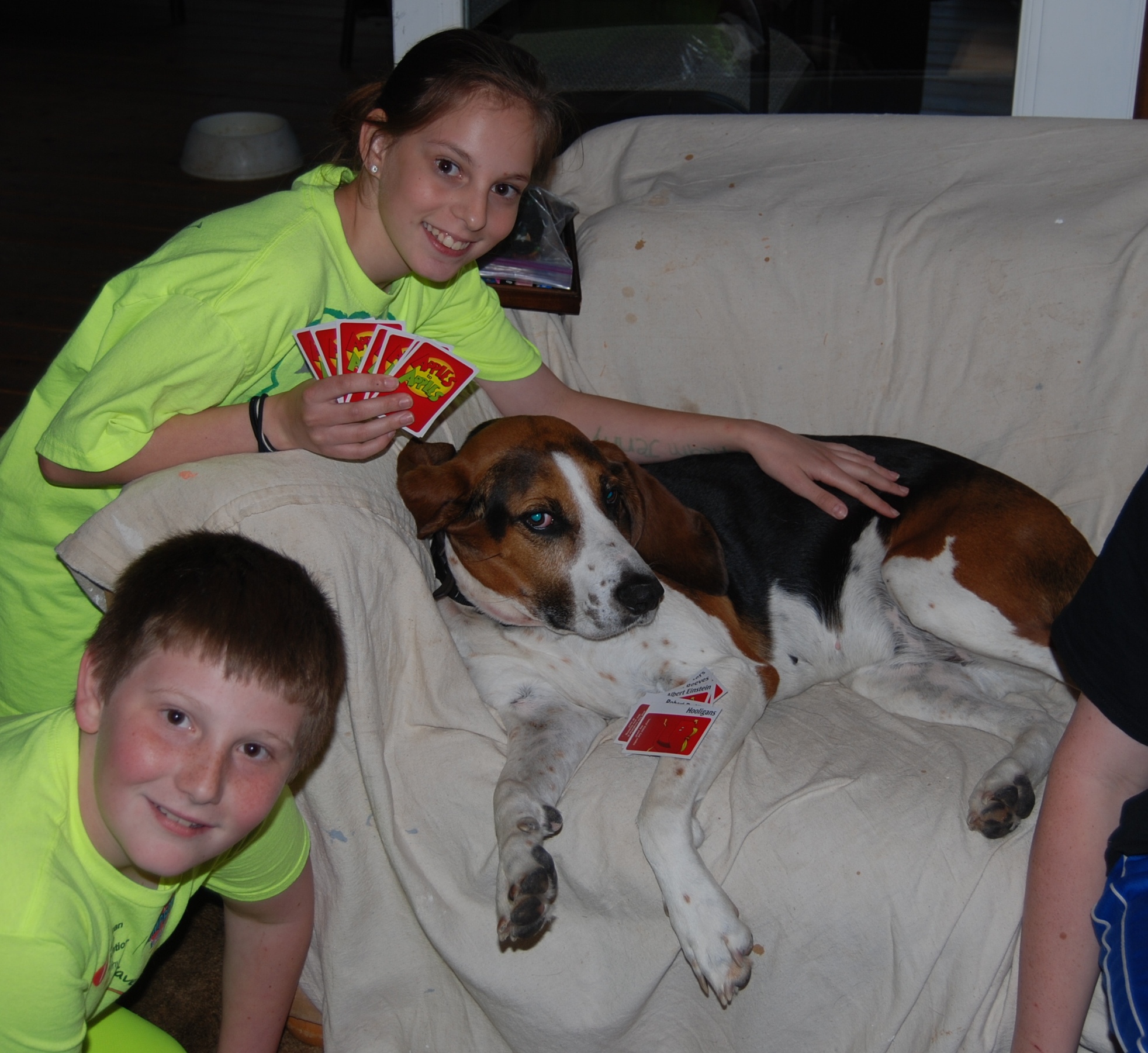 I spent the next 45 minutes trailing Hitch while trying to maintain control of Kylie. Of course, the moment we almost had him back in the house was when a van full of kids pulled in the driveway and off he went again. Happy ending, though. He did eventually follow me, Kylie, and Gracie into the house while our newly arrived guests hid in the kitchen. Everyone enjoyed playing with all the dogs, even Hitch, and it was a fun night.
