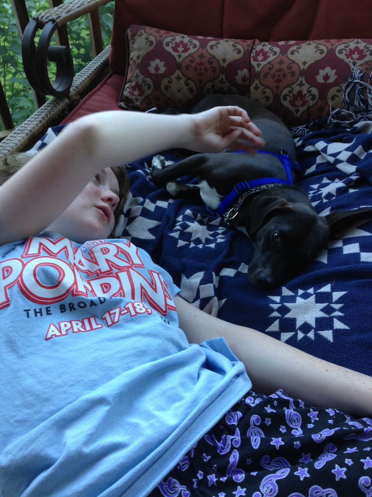 The first few hours went fine. I walked both dogs (or Kylie led the dog-person-dog train) around the yard. Carla was not impressed with either dog and spent the afternoon lounging on the porch, occasionally lifting her head to watch the antics of Kylie when she spotted a BUG! or a BIRD!! or a CAT! or a OMG-SQUIRREL!!!!