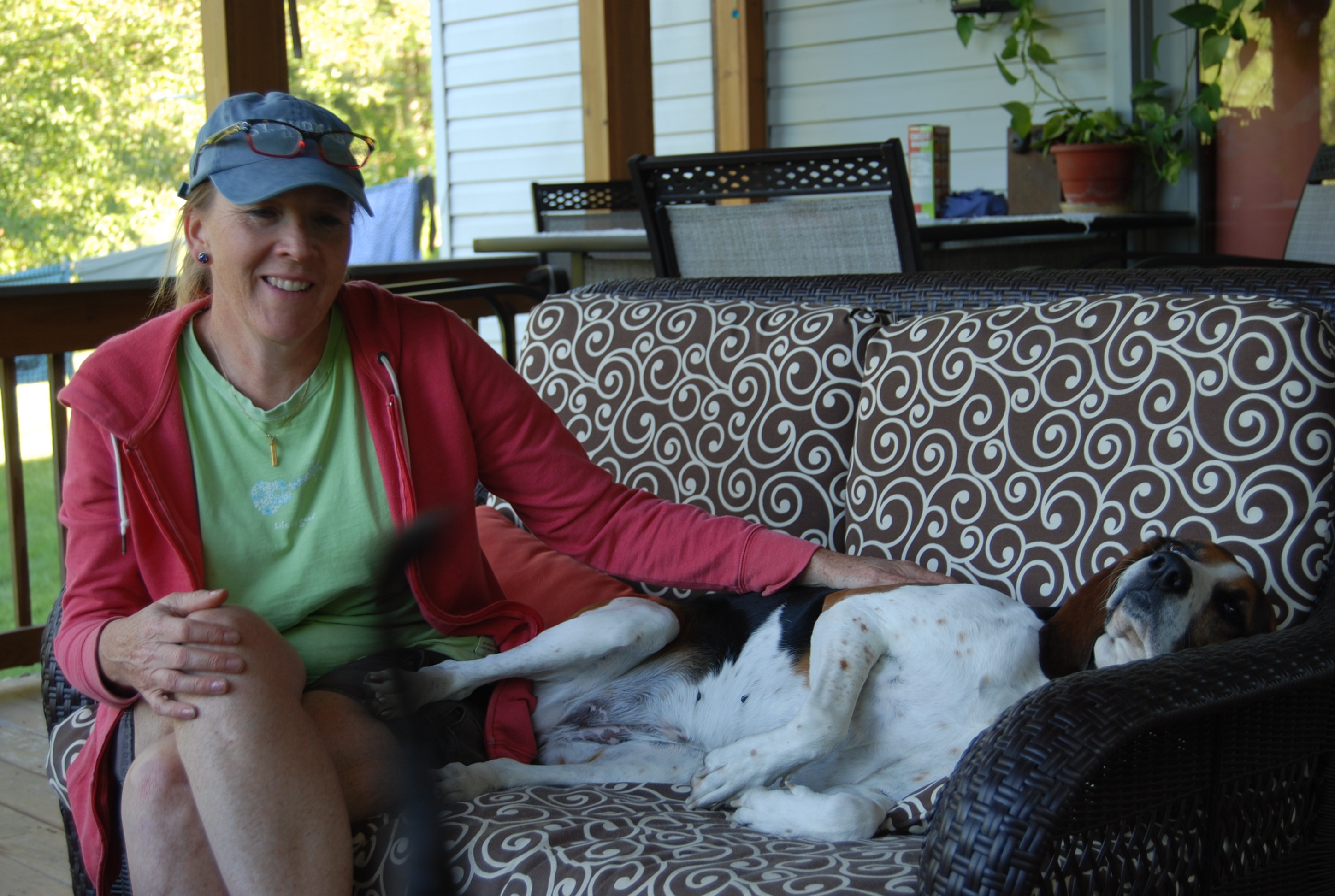 So she is fat, but she’s also happy. She barks a lot less. I’ve begun to realize that all that frantic barking in the first few weeks she was here must have been part of her grief and her transition. She still barks if the UPS guy comes up the driveway or the neighbor’s goats dawdle in the gap between the trees that is visible from our porch (where Carla likes to lounge away her days), but otherwise she saves her barks for important things like letting us know she needs to go out/in or as a gentle reminder that dinner is late.