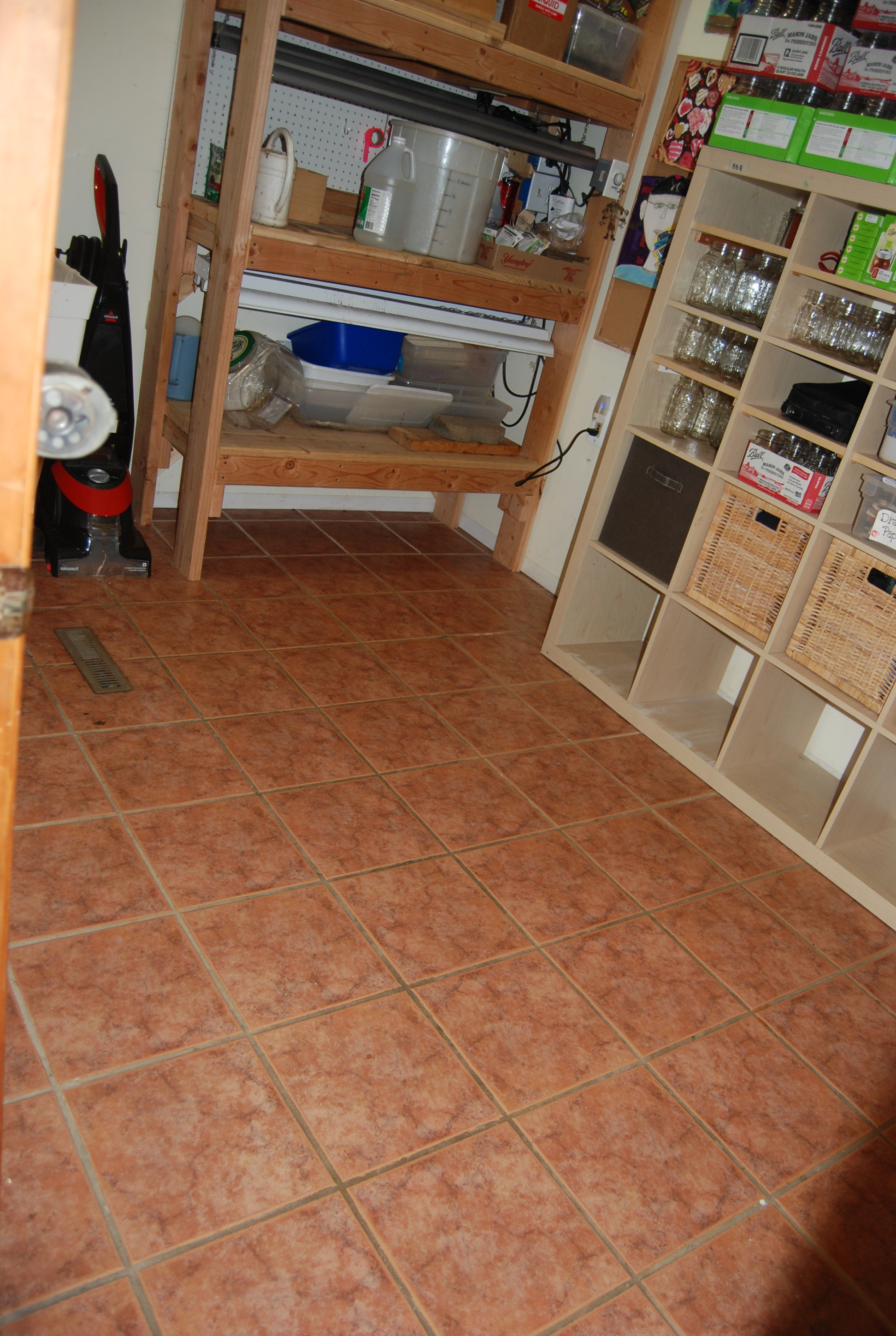 We scrubbed the floor with vinegar to kill any germs/smells/sticky residue left behind and then Nick bought a cheap piece of linoleum to cover our ceramic tile and protect the porous grout. We were even smarties and ran the linoleum up the walls a little so that puppy pee can’t sneak beneath it.