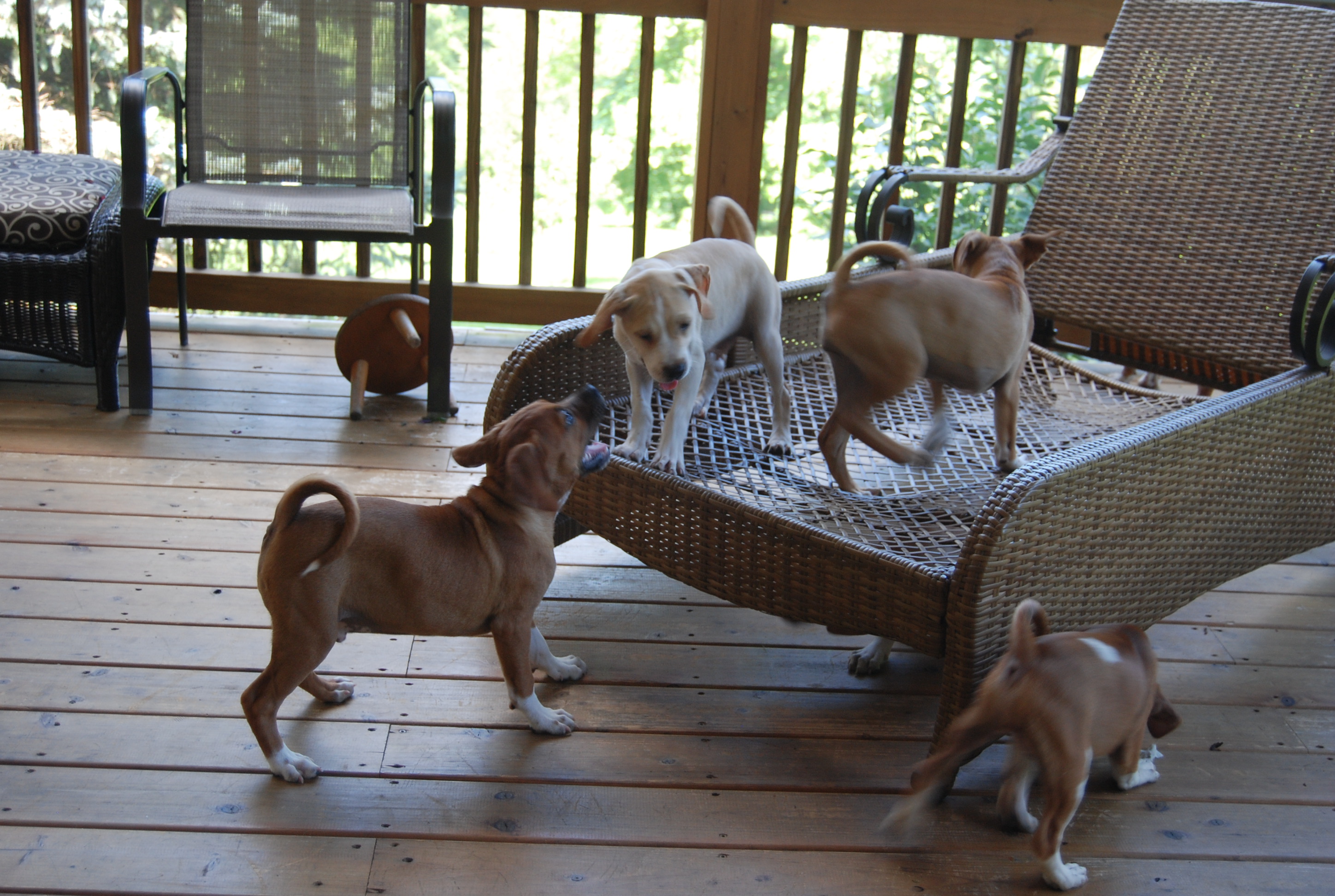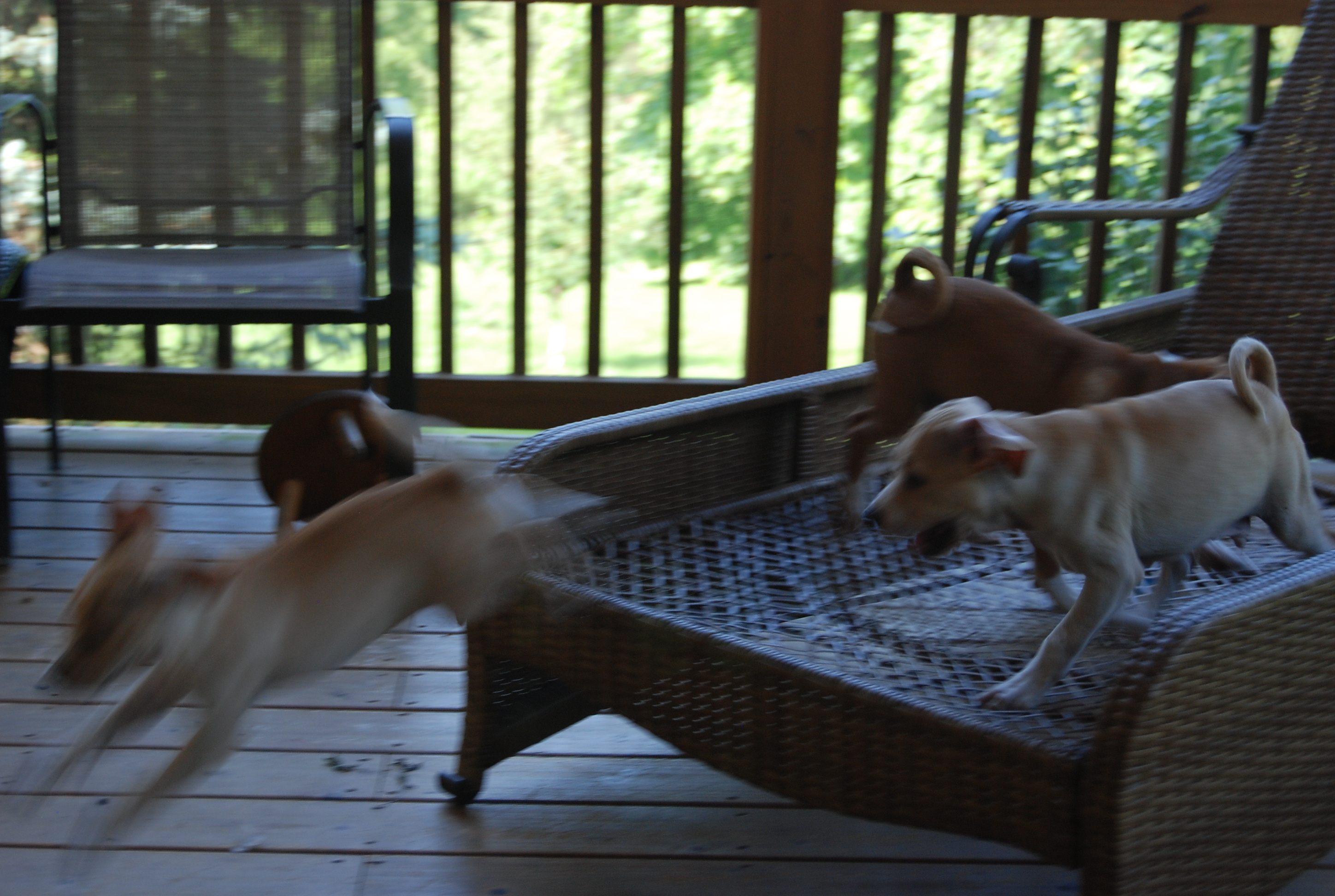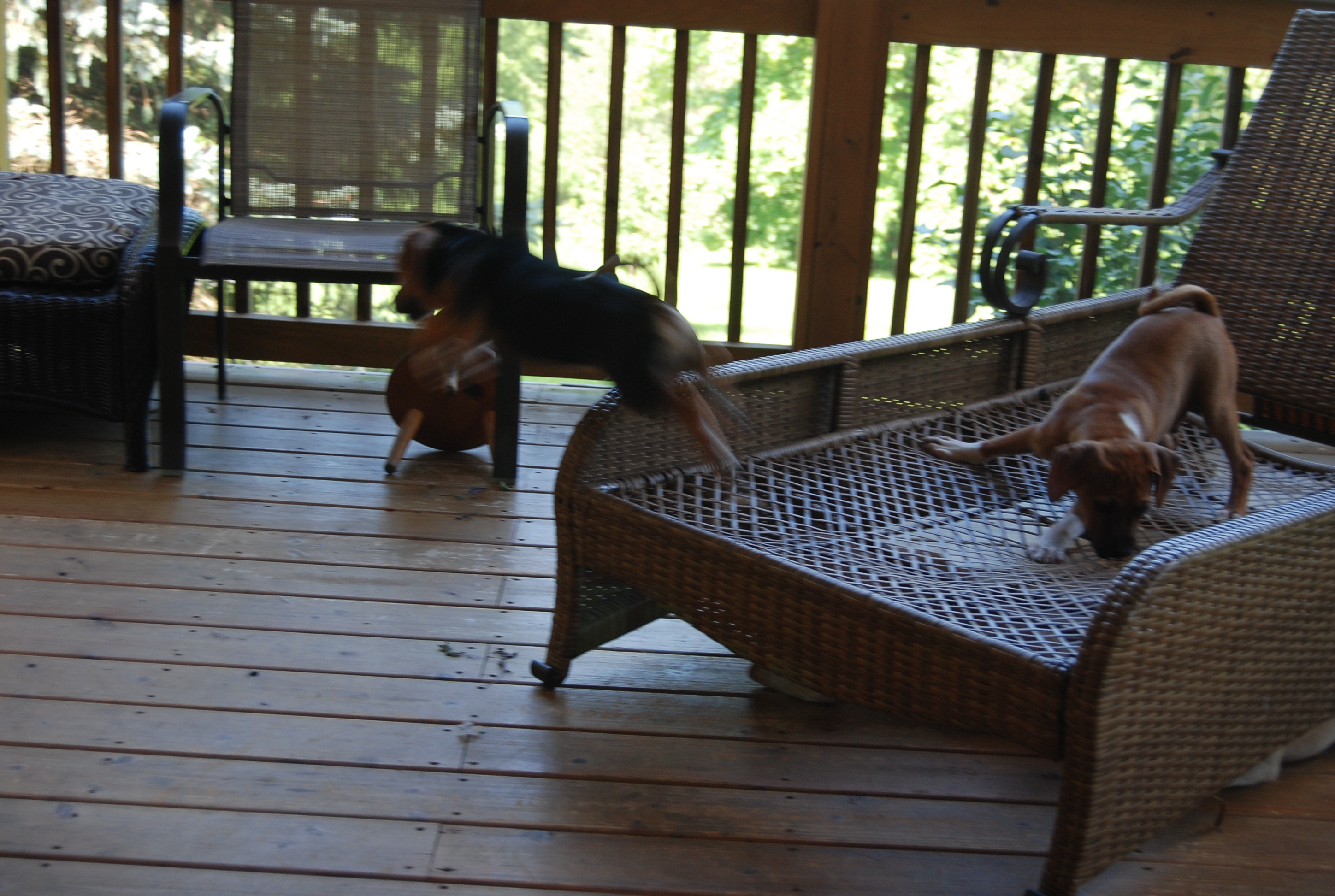 They love playing tag and launching themselves off the chaise lounge (whose pillows we had to remove so they wouldn’t be eaten – beware adopters!). It’s like the diving board at the pool in summer.