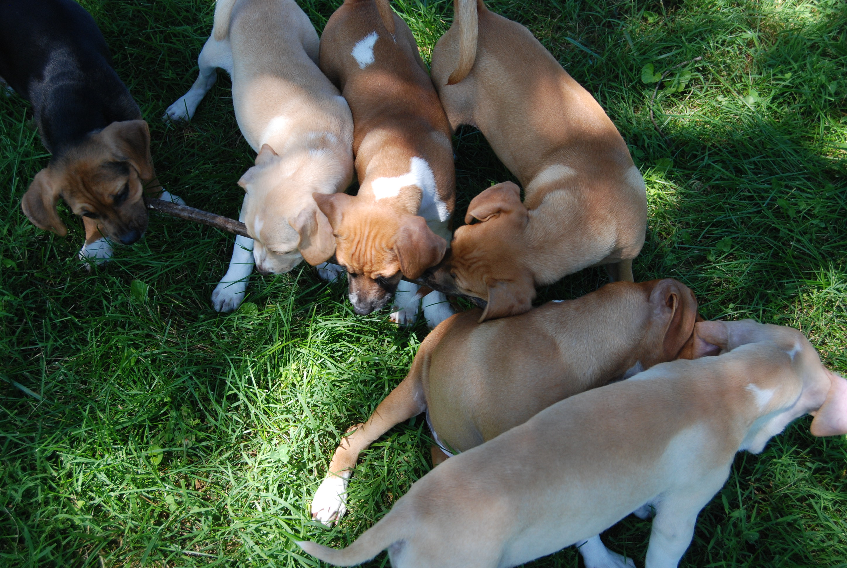 This weekend, we hooked up our puppy pen with our neighbors borrowed pen and created a little paddock in the grass. Wow, was that crazy fun. Marzle discovered digging! So now I have to be careful going out to close the chicken house in the dark so I don’t sprain an ankle. The birds provided endless entertainment and whenever a ruckus broke out in the chicken pen it silenced the puppy pen. They froze in awe – what is that amazing sound? And sticks – they all loved sticks – best free toy on earth.