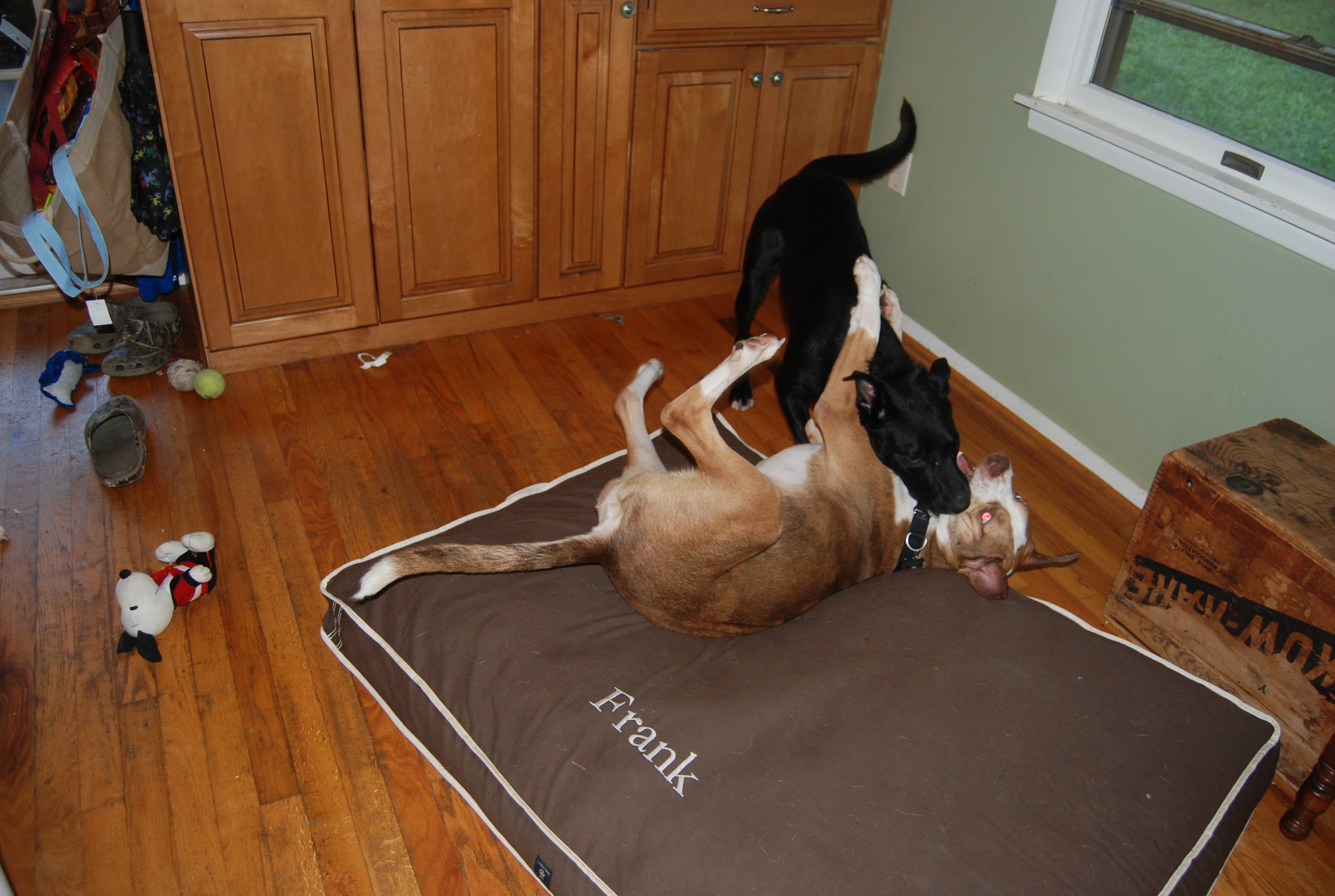 As soon as Frank was reunited with the other dogs, he relaxed. He spent a half hour wrestling on his humongous bed with Tennessee, his favorite playmate and his biggest advisory.