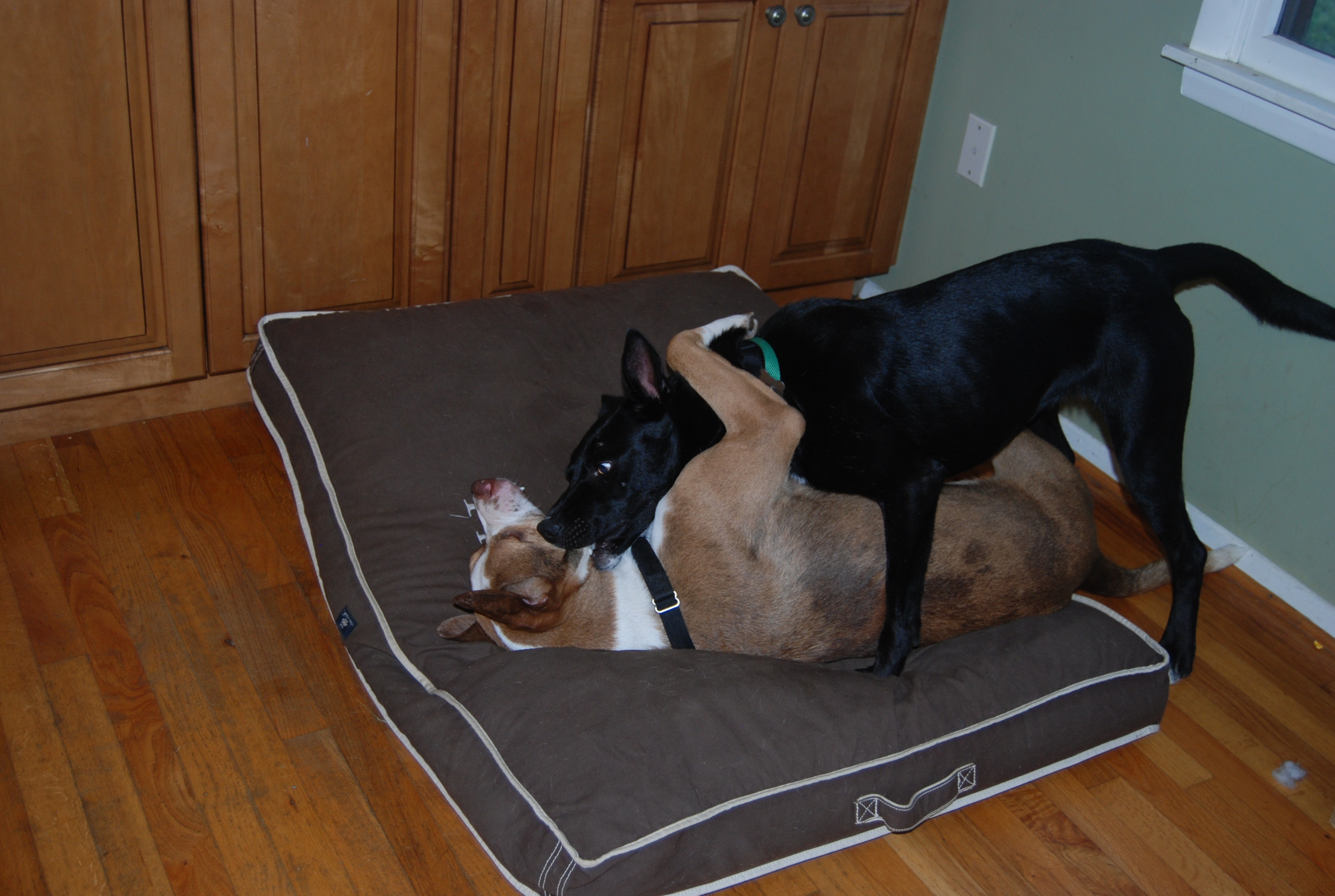 Tennessee has morphed into a different dog. I guess none of us realized how much of a calming influence Texas was on my little pack. Left to his own devices, gated in the kitchen, he’s managed to remove the entire top edge from my hard plastic laundry basket, destroy the zipper and strap (the two most important elements) of my daughter’s book bag, and gnaw the corner off one of her school owned textbooks.