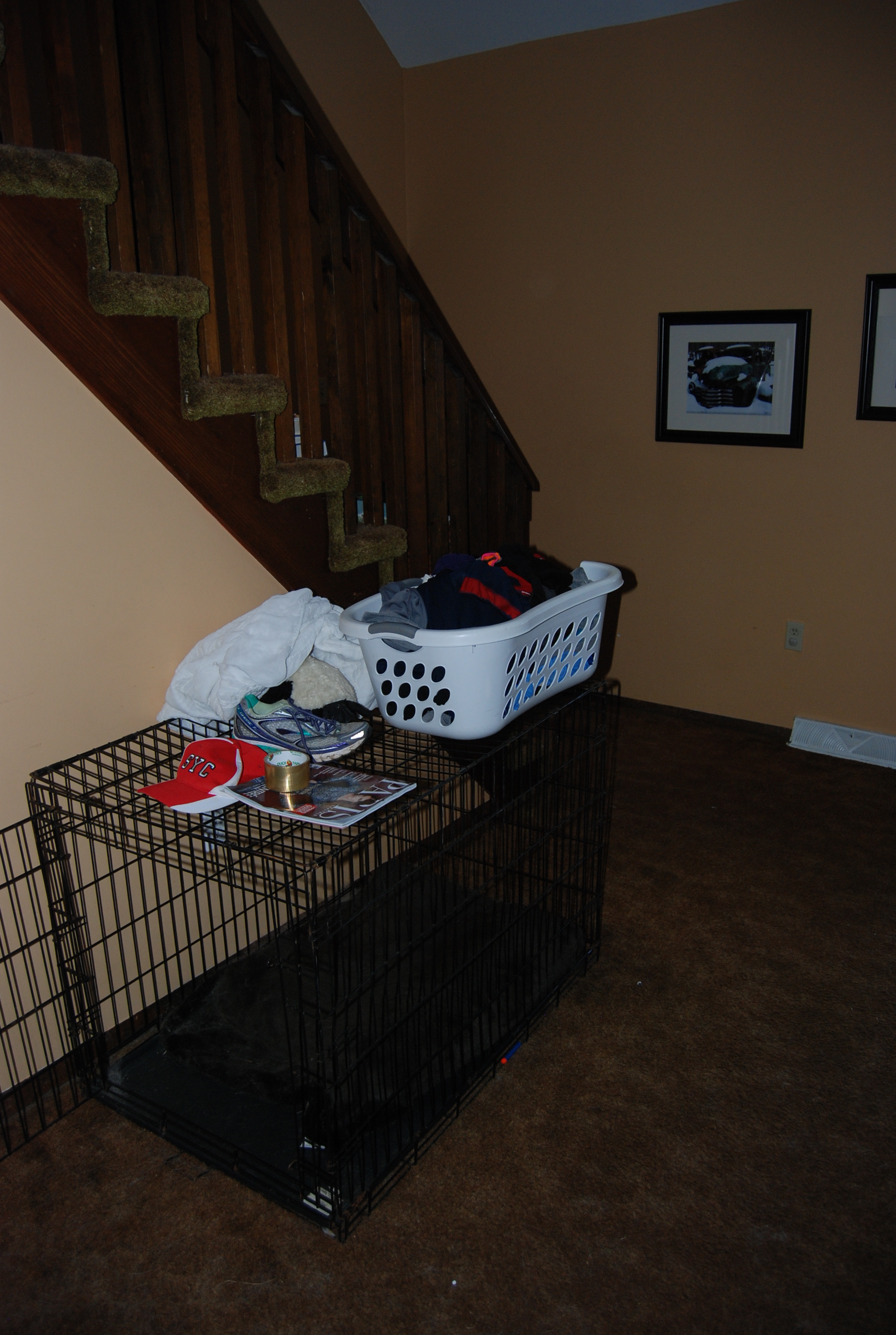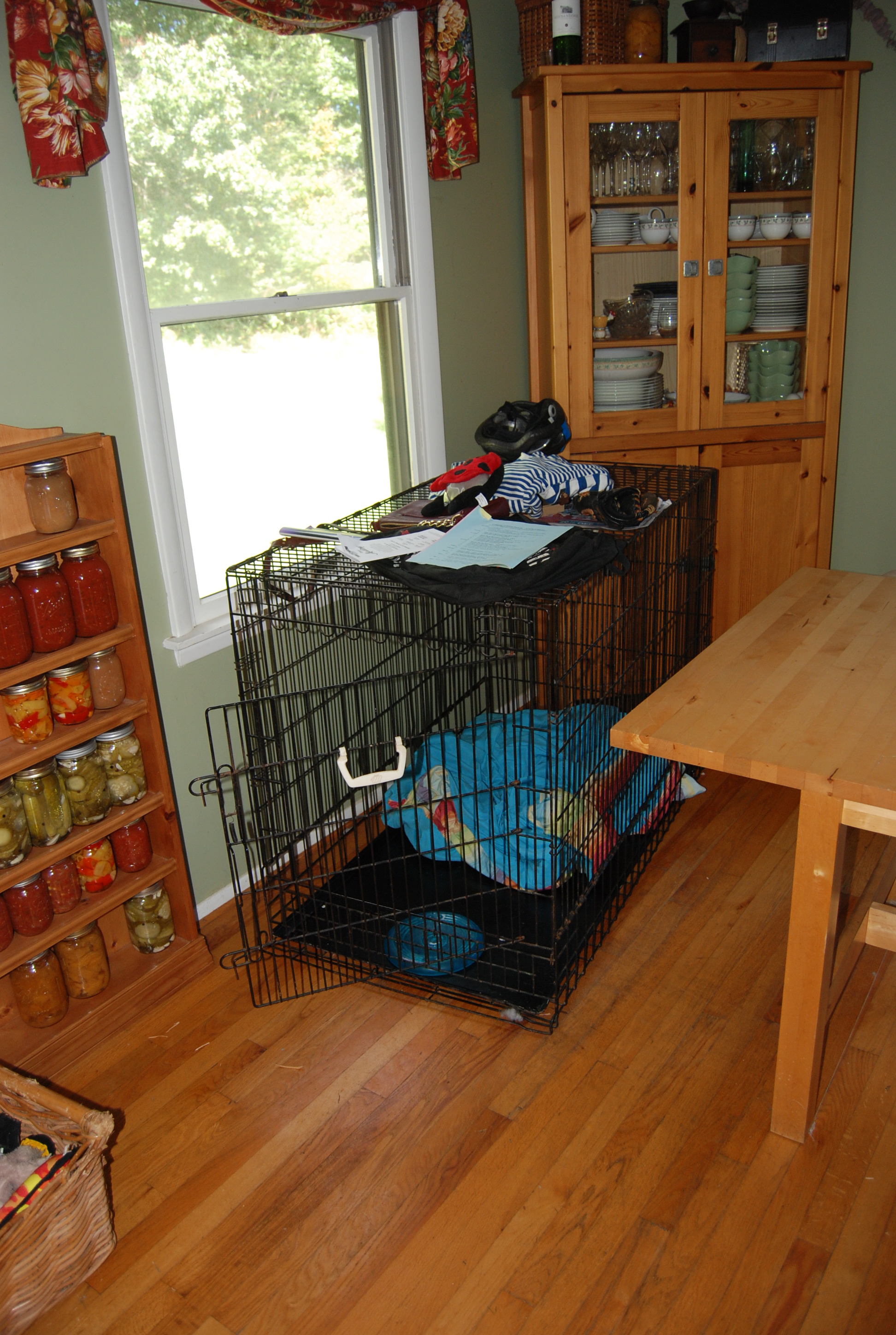 And in the living room, where once the antique mission table resided, there is now a large dog crate, tricked out with a fancy dog bed that matches the carpet. It is especially handy for holding all the crap you need to remember to take upstairs with you.