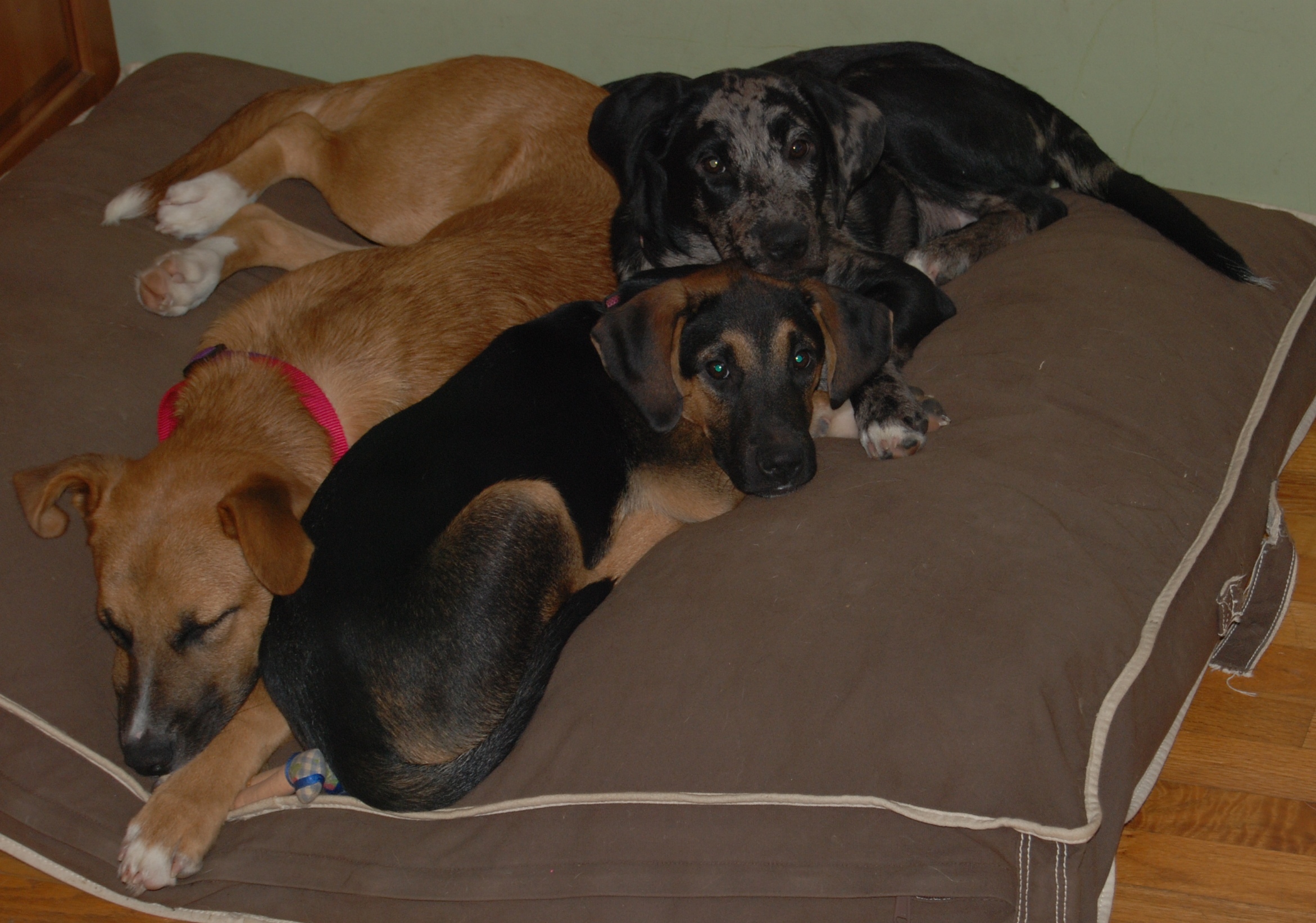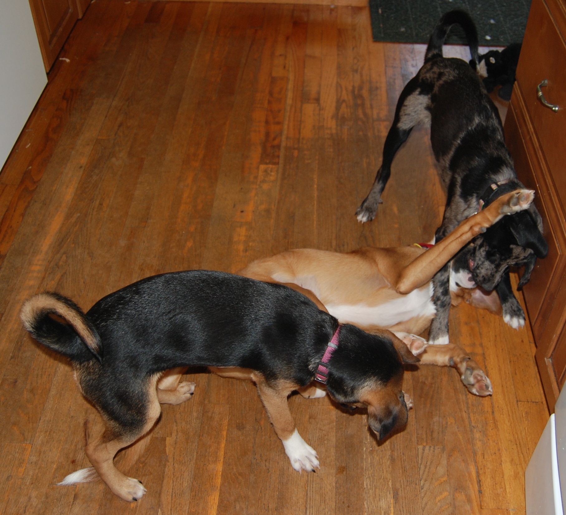 Soon enough, the pitiful cries of Charm pull me from my work. She can only take so much of Chism and her endless need to play. “It’s nap time!” I tell Chism, but she only smiles and steals the toy I’ve just placed in Charm’s mouth. Like a toddler, she only wants that particular toy because Charm had it. She quickly loses interest and drops it, moving on to a through-the-crate battle with Rollie. Charm quietly picks up the toy and retires to the Frank bed. But moments later, Chism bored with the Rollie battle, launches herself on top of Charm, stealing the toy again and prancing across the kitchen, only to drop it and tackle Charm when she follows. She gets a good hold of Charm’s ear and….. Charm cries. I separate them and hand Charm a new toy. Chism steals it and round and round we go. Endless fun.
