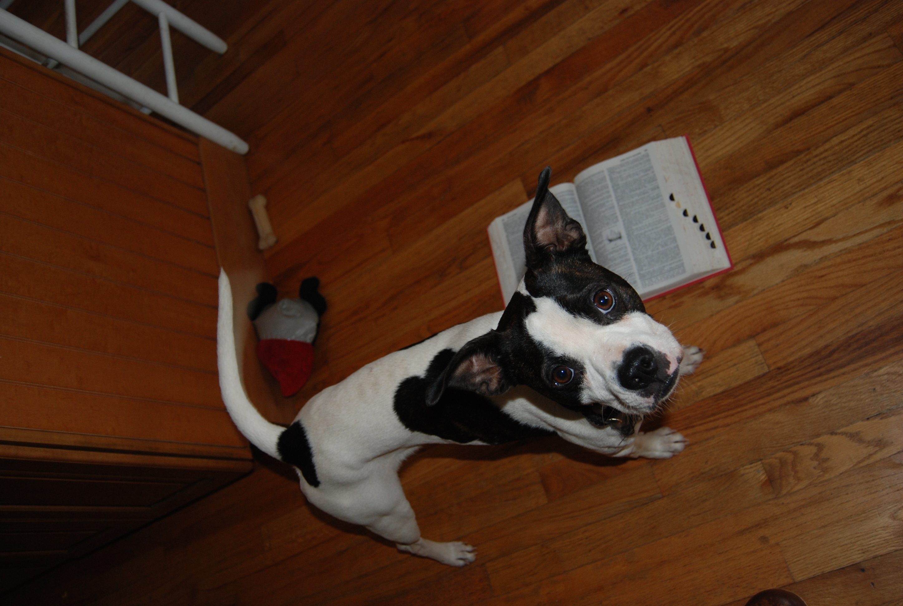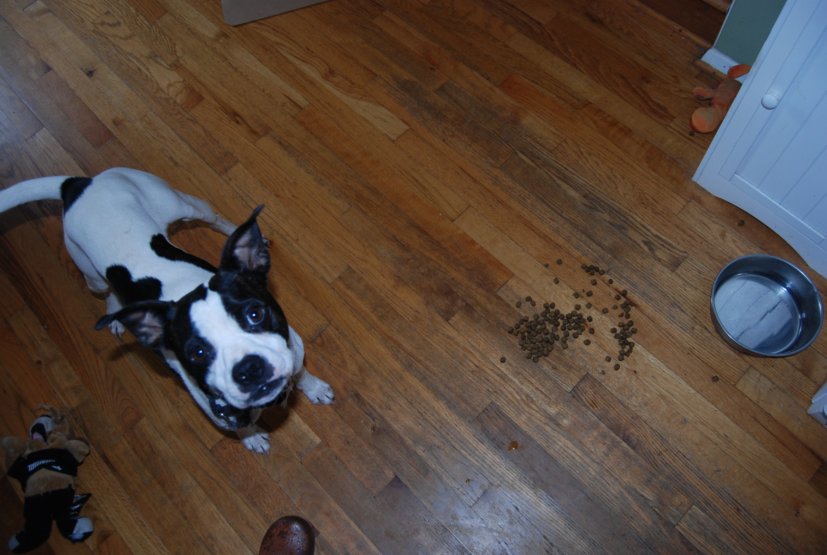 John Coffey isn’t a big dog; he could use a few more sandwiches. When Livia told me that he’d gained nine pounds in his three weeks with them, I was astounded. He’s so skinny. I can’t imagine what he looked like previously. She said he was a ‘skeletore’ and I believe it. We’re trying to pile on the pounds, but he prefers to eat his food scattered across the floor so I’m not sure how much he’s taking in. When I put a bowl of food down, he promptly dumps it. Not sure if this makes dinner more interactive for him, or he is complaining about the service.