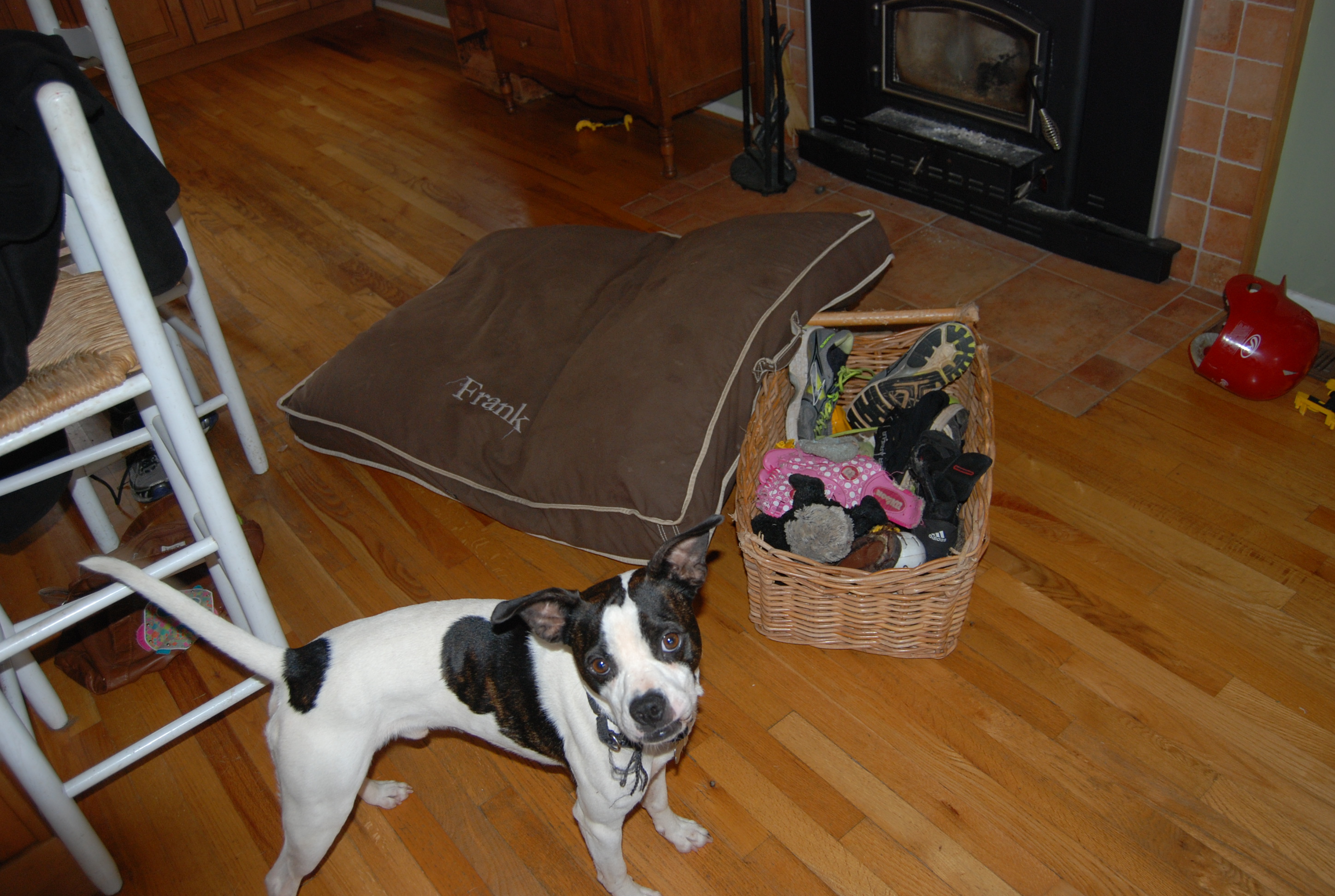 We’re looking forward to hanging out with John Coffey. He’s quite the entertaining character. Left alone for twenty minutes in the kitchen this morning, he rearranged the furniture. He moved the Frank bed to the middle of the room, ostensibly so he could lie on it and still see around the corner to where I was in the living room. He pulled a dictionary (a big dictionary, think unabridged, hardback) down off the kitchen table and I found it, unmutilated, but open to the J’s! Maybe he was looking up who he was named after. He dragged the toy basket to the center of the room, right next to the Frank bed which made it easier for him to sort through the plethora and take out all the yellow dewalt plastic tool casings and make a separate pile of them by the door. (Nick brought these home for Frank and Tennessee – great free chew toys.)