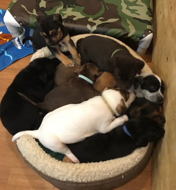 basket of rescue puppies