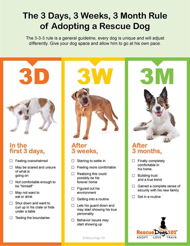 Early on, I sent this graphic to Mia’s adopters. The 3-3-3 rule is well-known in rescue, but I think it’s important to stress it for anyone adopting a dog, especially a rescue or shelter dog.