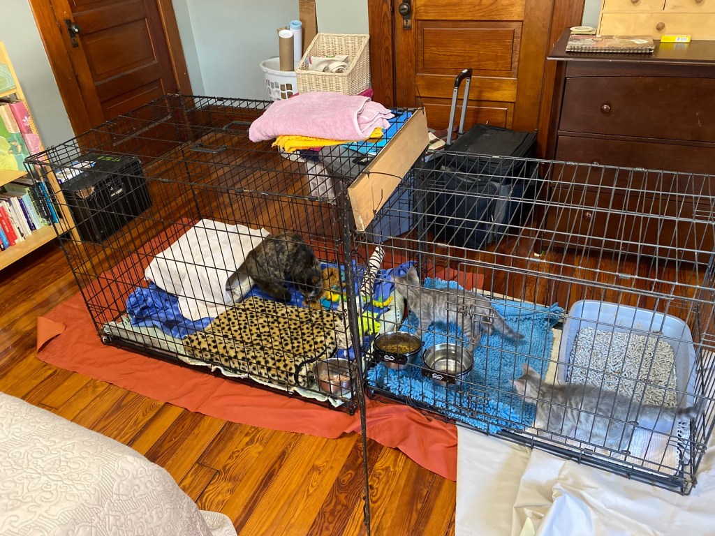 Making progress. Two out of three will now come in the room (but take a very wide berth around the cat crates)