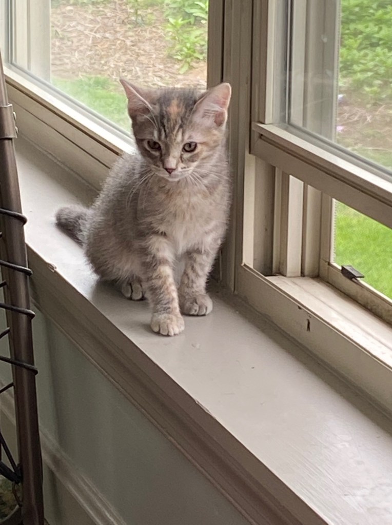 The cat came darting back across the street to me, again nearly being hit by passing cars. Now, I’m not really a cat person and my experience with them is limited to the three cats we had in PA, plus numerous barn cats (who NEVER run towards a human). It seemed like odd behavior for a cat to run toward me and this one seemed panicked and terrified. I scooped her up and she leaned against me hard. I looked around, but there was only a bank, a Catholic Church, and a funeral home nearby. I didn’t know what else to do but carry her home, so I did.