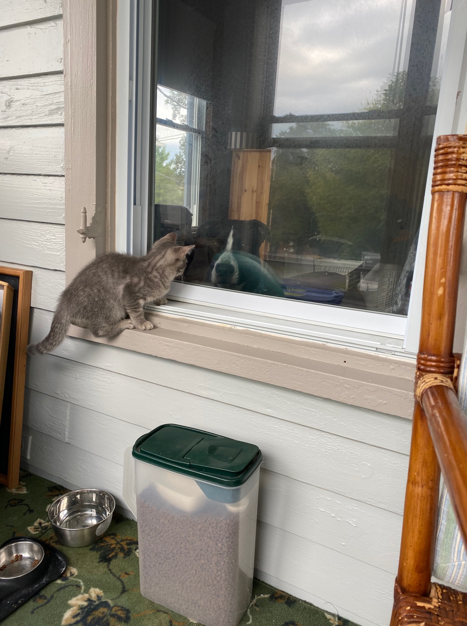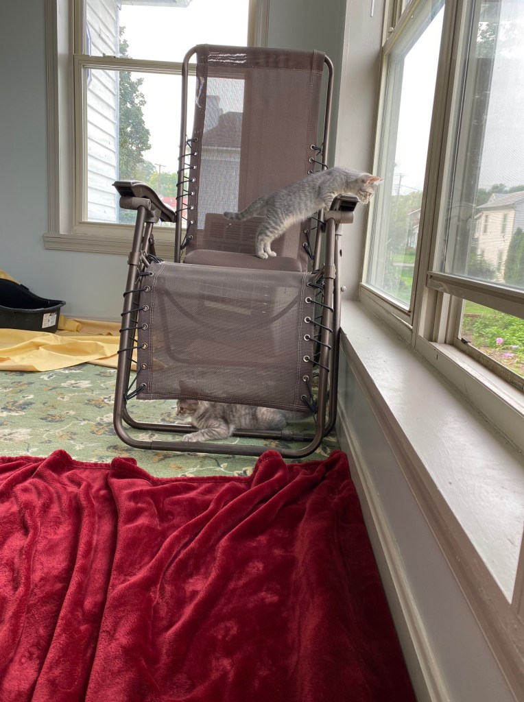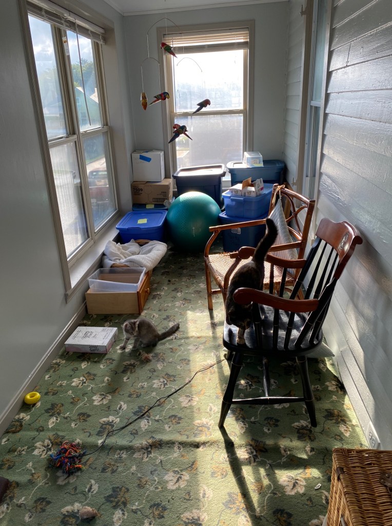 But now it is a cat heaven. They love hiding between the bins and lounging on the window sills looking out the crack that the windows will open (at least on the three windows that have screens). It’s given them room to run and romp and Otis can still watch them through our bedroom window that looks out onto the porch.