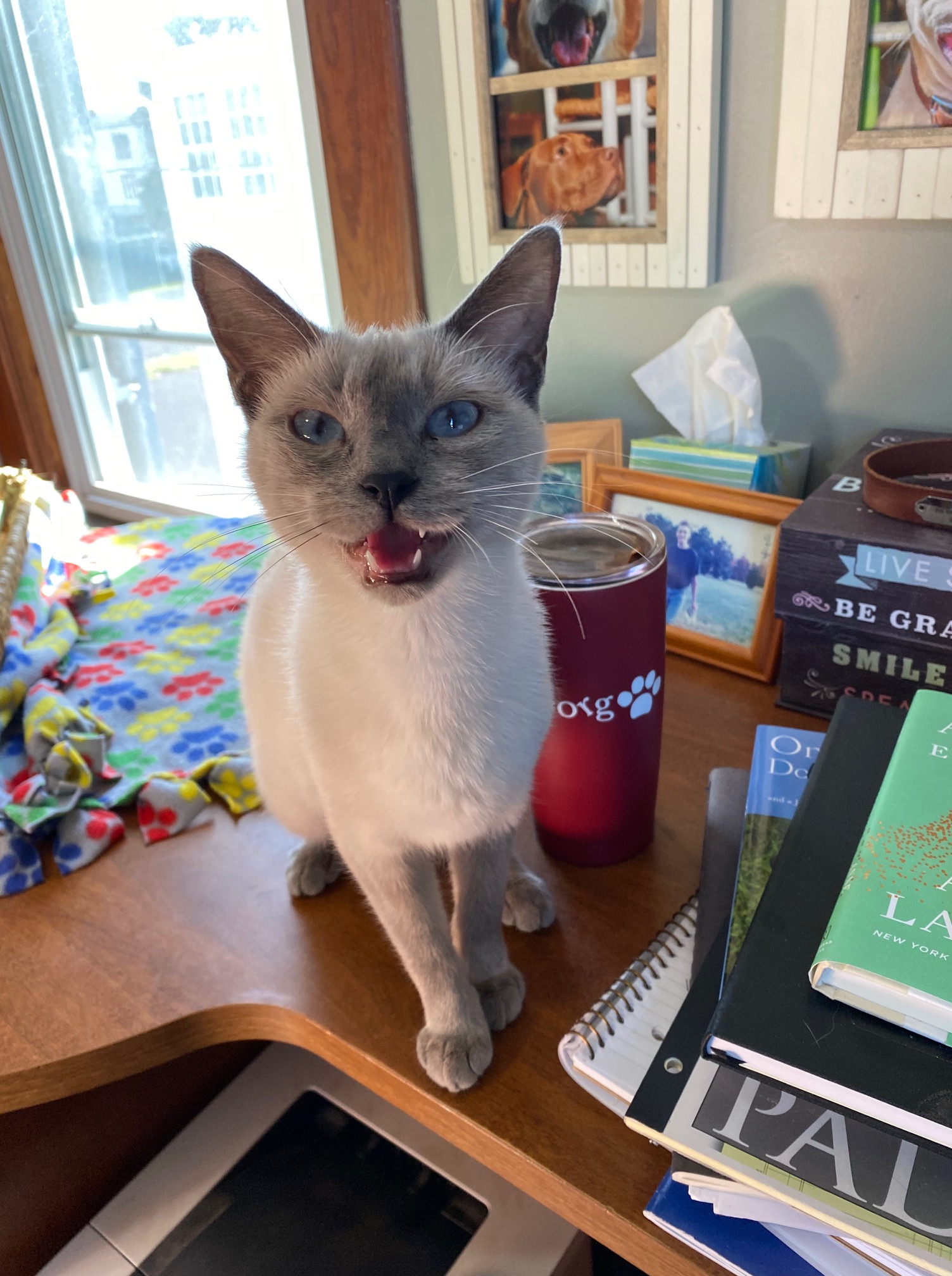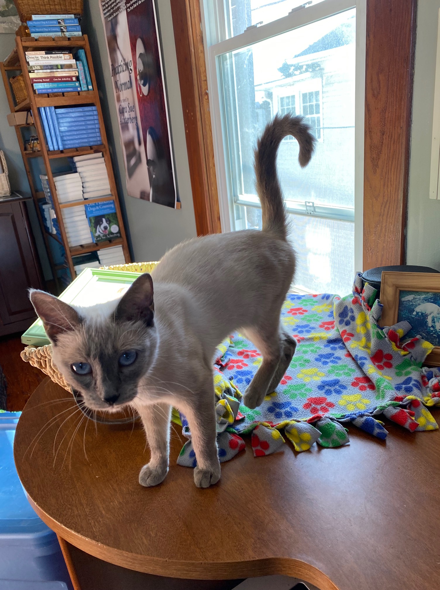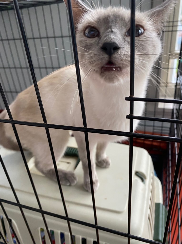 She is a Siamese-ish looking cat with beautiful blue eyes and she definitely loves people. I figured she belonged to someone and that someone must be looking for her. I checked in with the rescue that we are fostering for and Robin directed me to call the shelter and report her in case anyone was searching for her. I did that and then drove her (I was now calling her Blue) to the shelter to be checked for a micro chip. Surely a cat as beautiful and friendly as this was microchipped. But, no, no chip. The shelter said she was probably about a year or so (going by the little bit of tartar on her teeth). They thanked me profusely for agreeing to hold on to her until we found her owners.