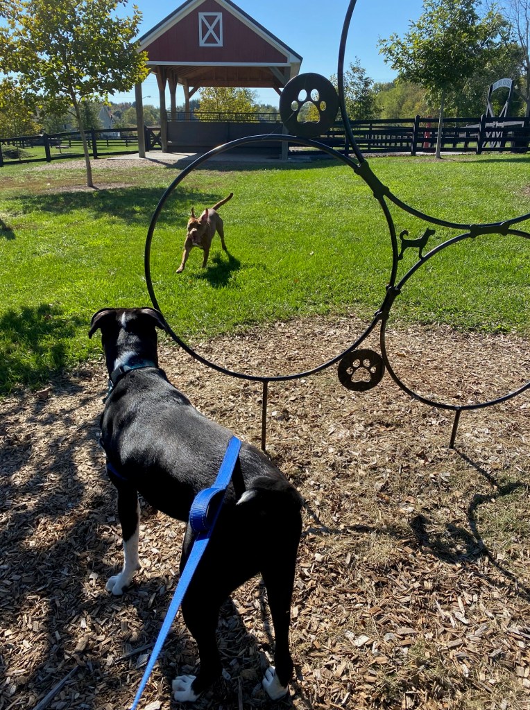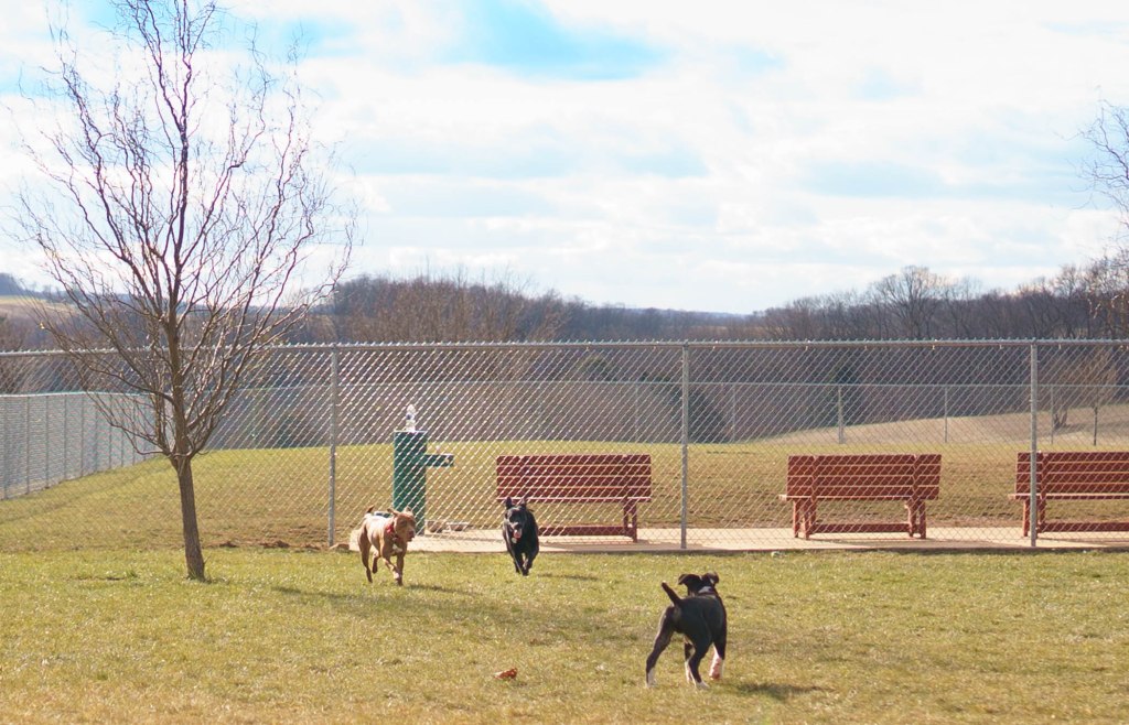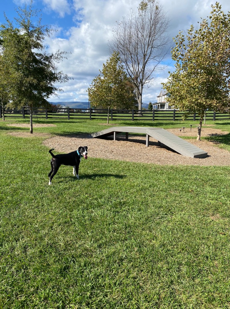 Yeah, it’s a pretty nice place. There was a dog park in our town in PA, but it was mostly muddy and there were rarely other dogs there, plus no equipment. This is much better, I just wish my dogs were a little more well-adjusted. Ah, well, we’ll get there eventually I hope.