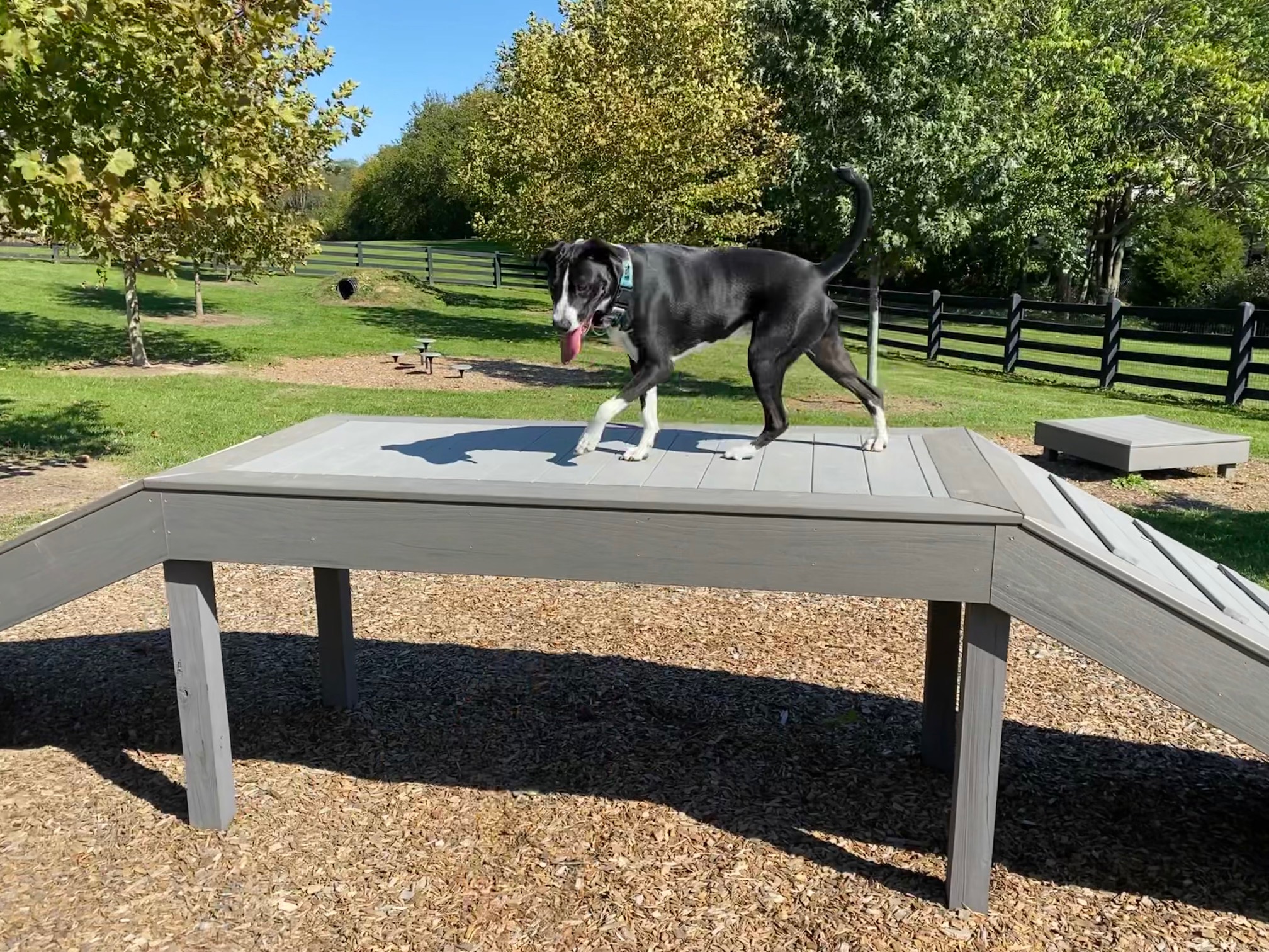 There is a small trail of round stools at varying heights, so I set about teaching Otis (Fanny was busy devouring a tennis ball) to put his paws on the stools. I imagine they are meant for dogs to sit on, but he would be hard-pressed to balance his big gangly self on the stools.