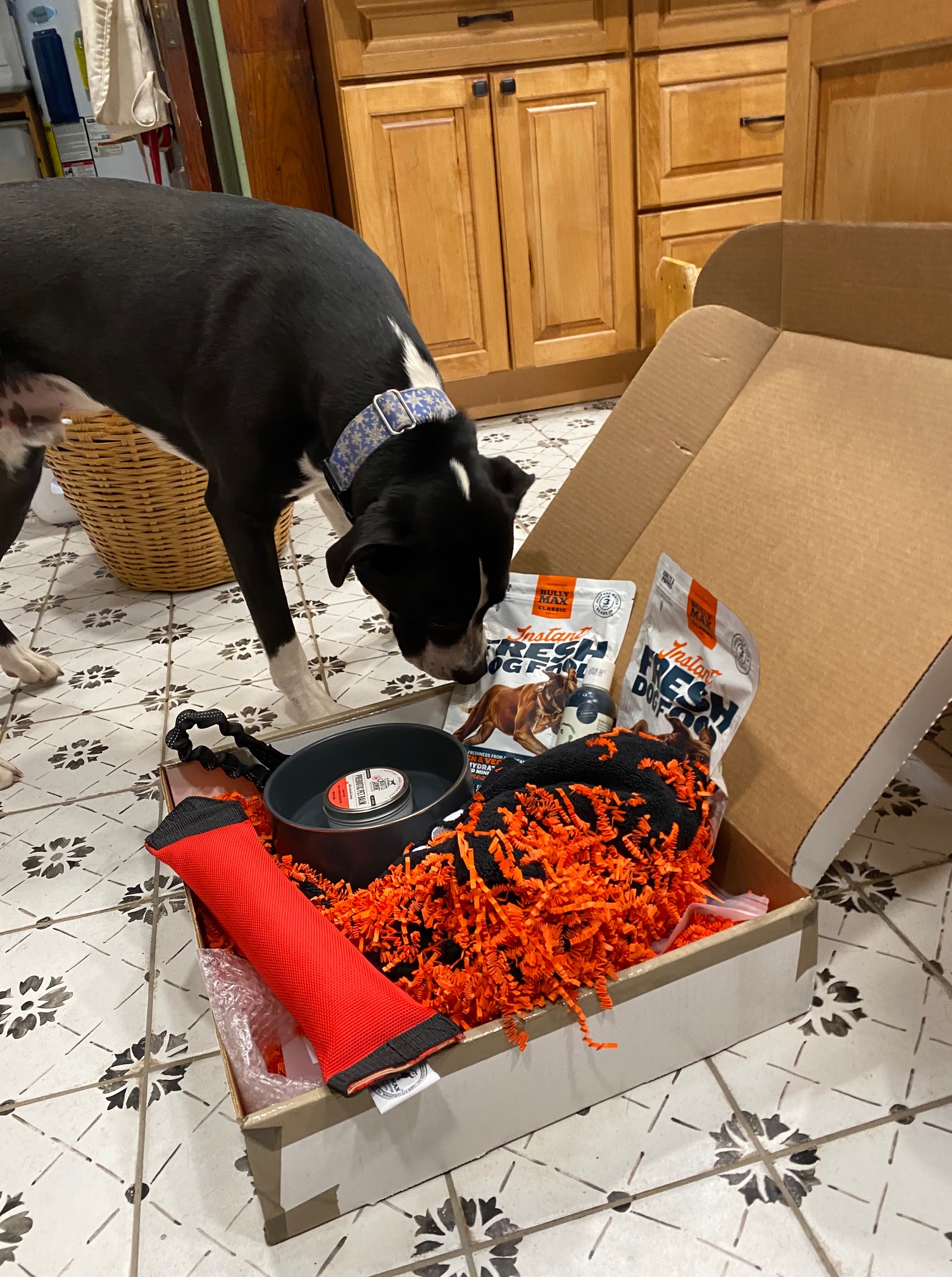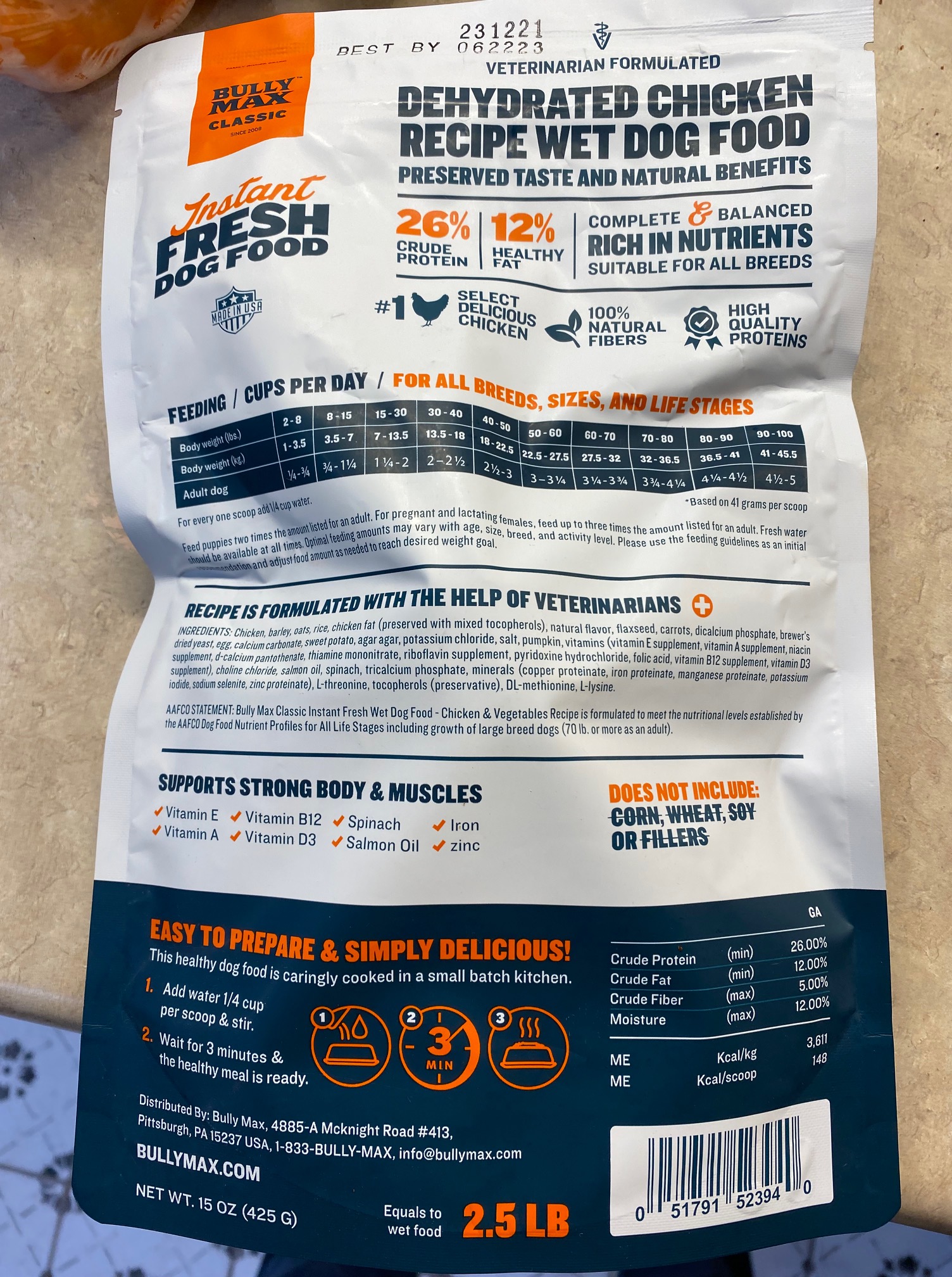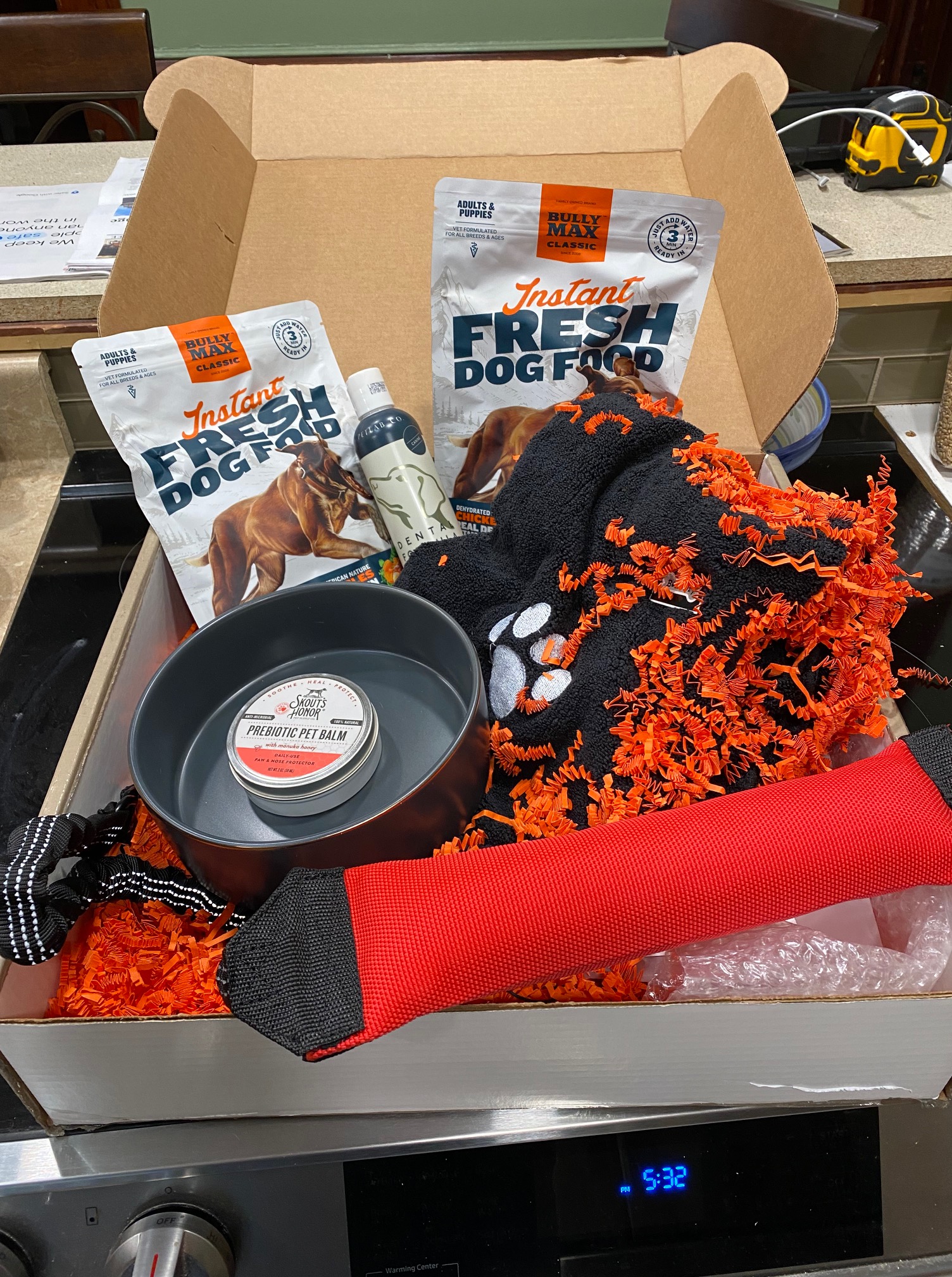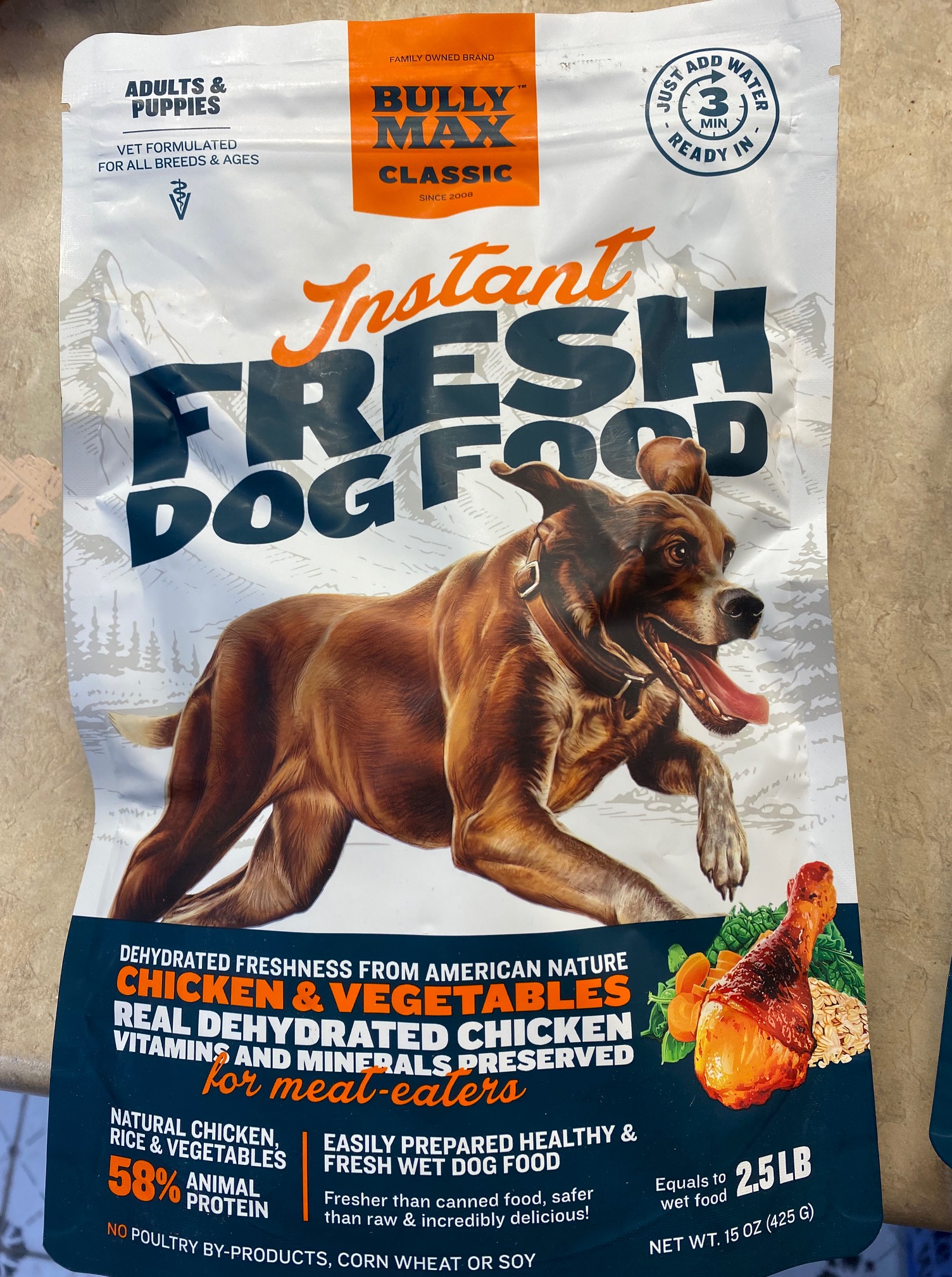 A representative from Bully Max asked if we would try a new all-natural food they are launching. It’s called Instant Fresh and is a dehydrated, fresh, powder formula made of human grade ingredients. You add water, wait and serve. They sent me two bags, plus some other goodies to try.