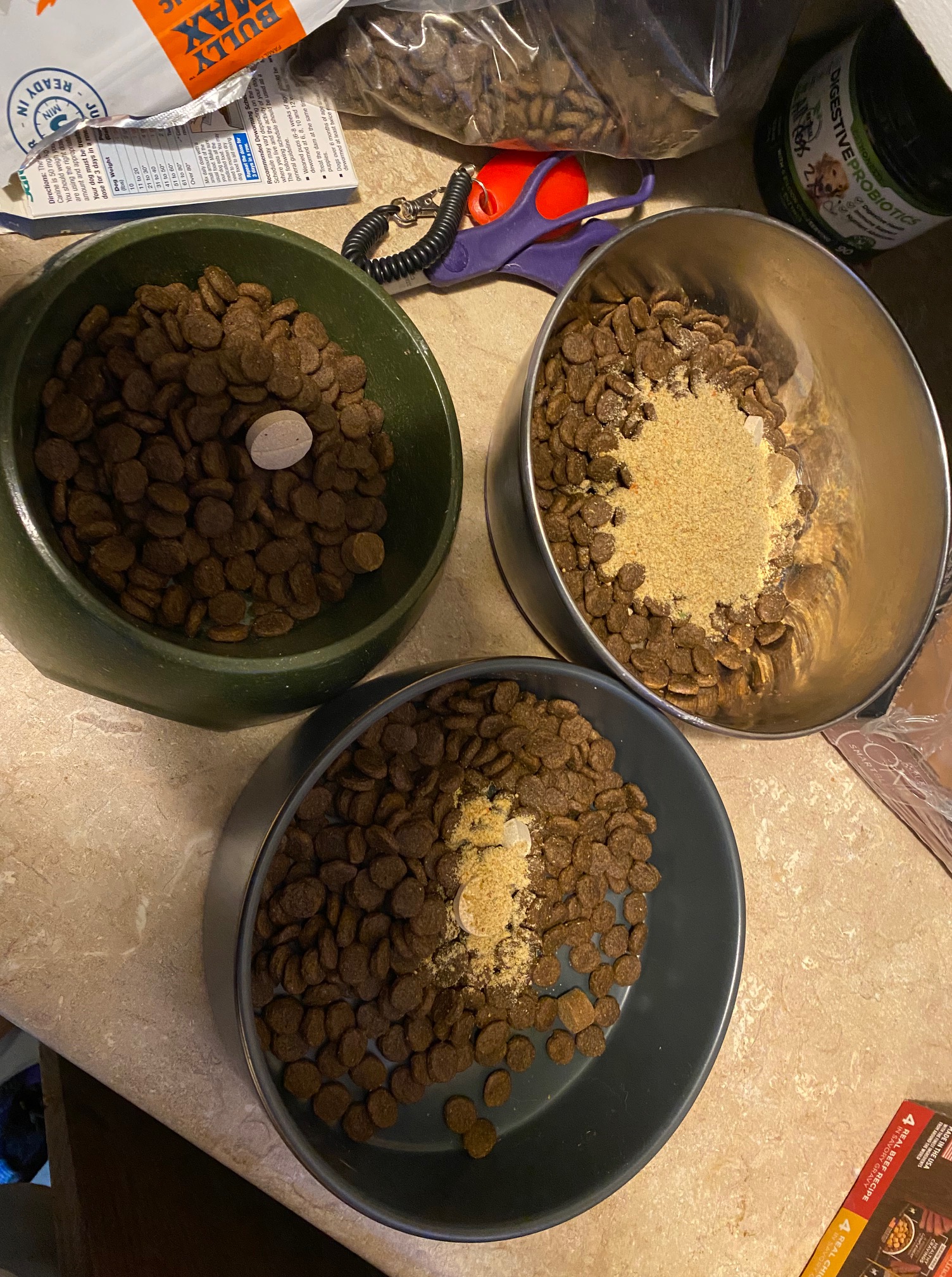 I used it as a food topper for Fanny’s regular meal and a small bit on Gracie’s (she’s picky too so I wanted to see what she thought). I didn’t put it on Otis’ because he’ll scarf up week-old Alpo as happily as anything else (not that I feed him Alpo!). You can feed Instant Fresh like you would wet food, but as I already knew it was out of our price range, I didn’t want to go overboard. Gracie and Fanny LOVED it, gobbling it up happily. I’m always trying new ‘toppers’ or additives to get Fanny to eat and many work for a few days and then she’s back to her indifference, but she loved every last ounce of both bags of Bully Max Instant Fresh, and it showed on how good she looked.