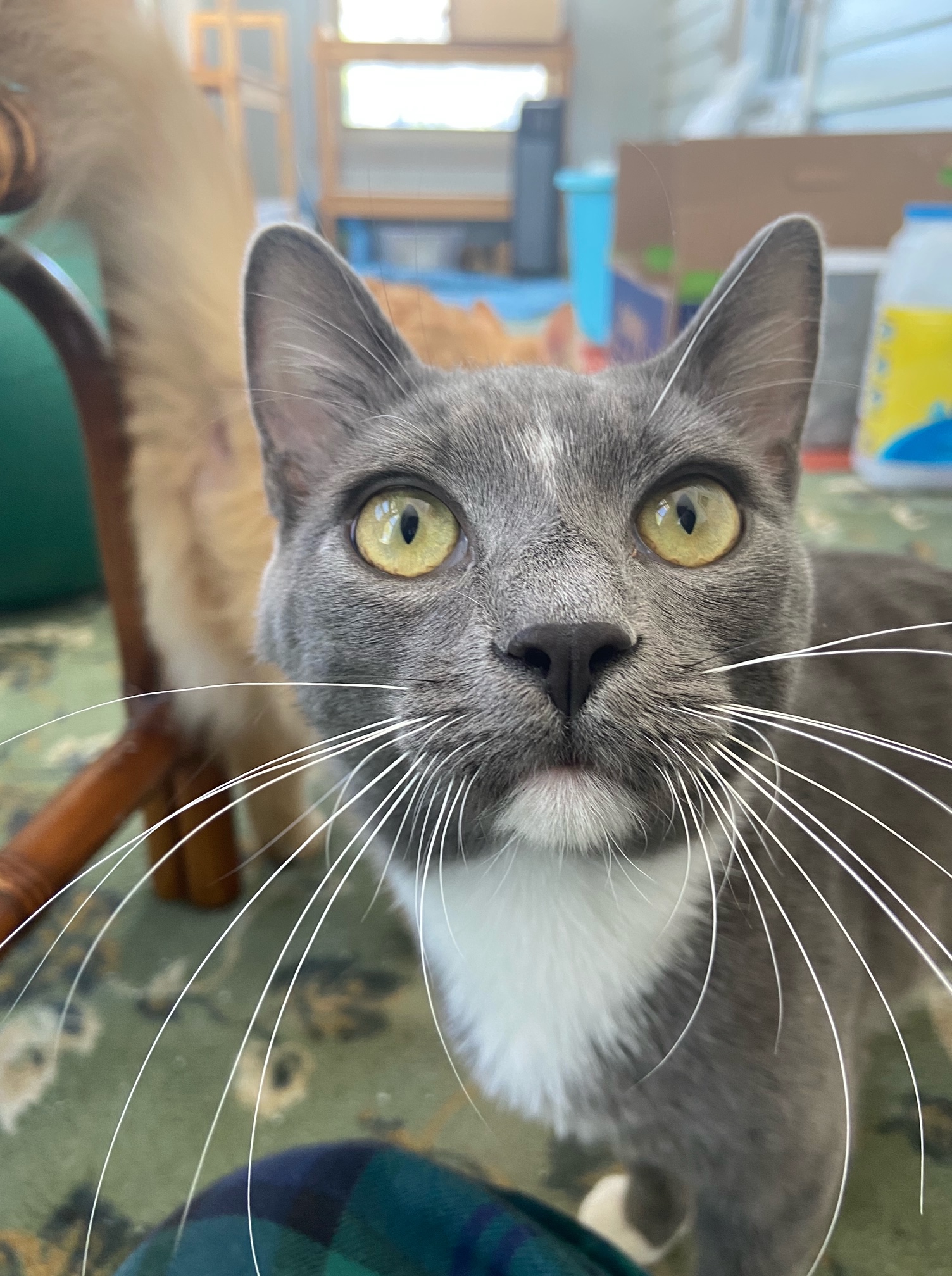 Simon is sleek and stunning. He prefers to curl up in tight spots rather than lounge in the open like his brother. He is aggressively friendly, his purr precedes him and he simply cannot get enough of me.