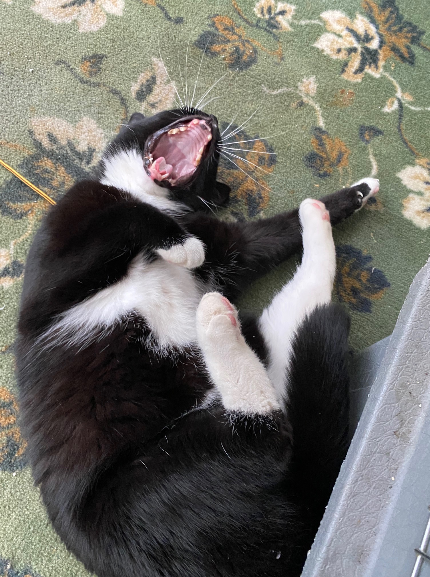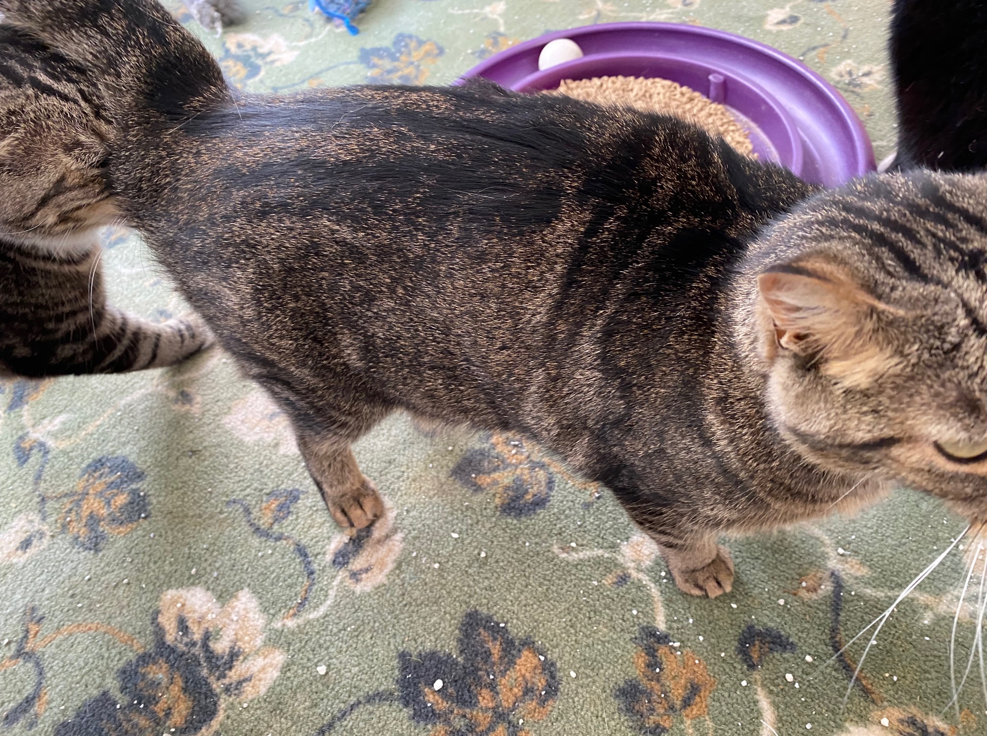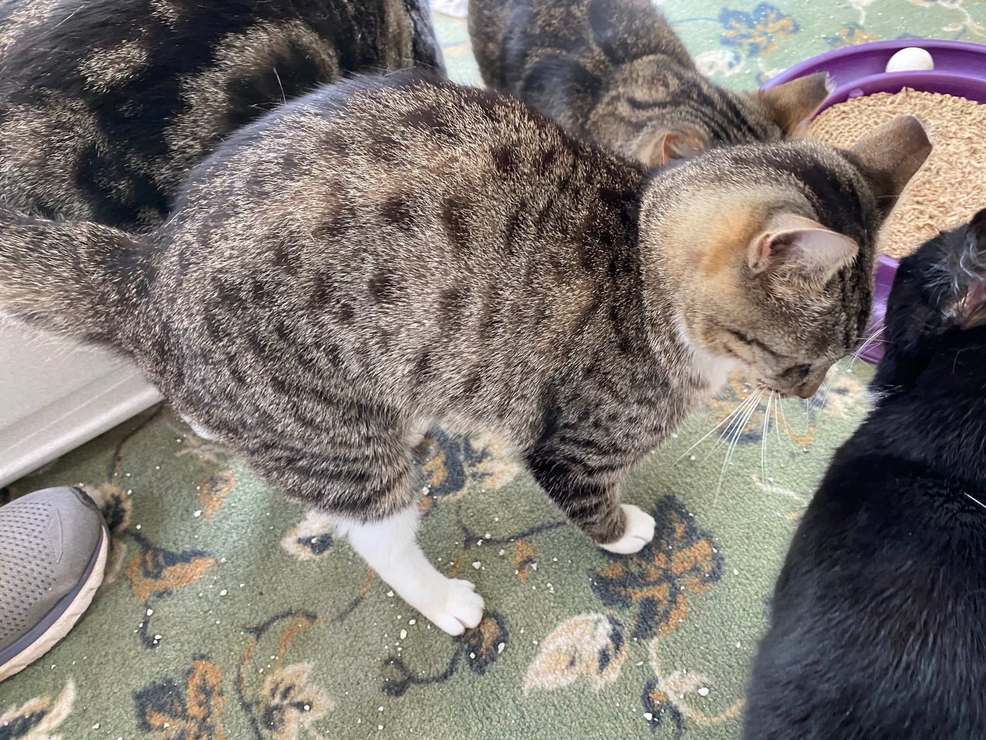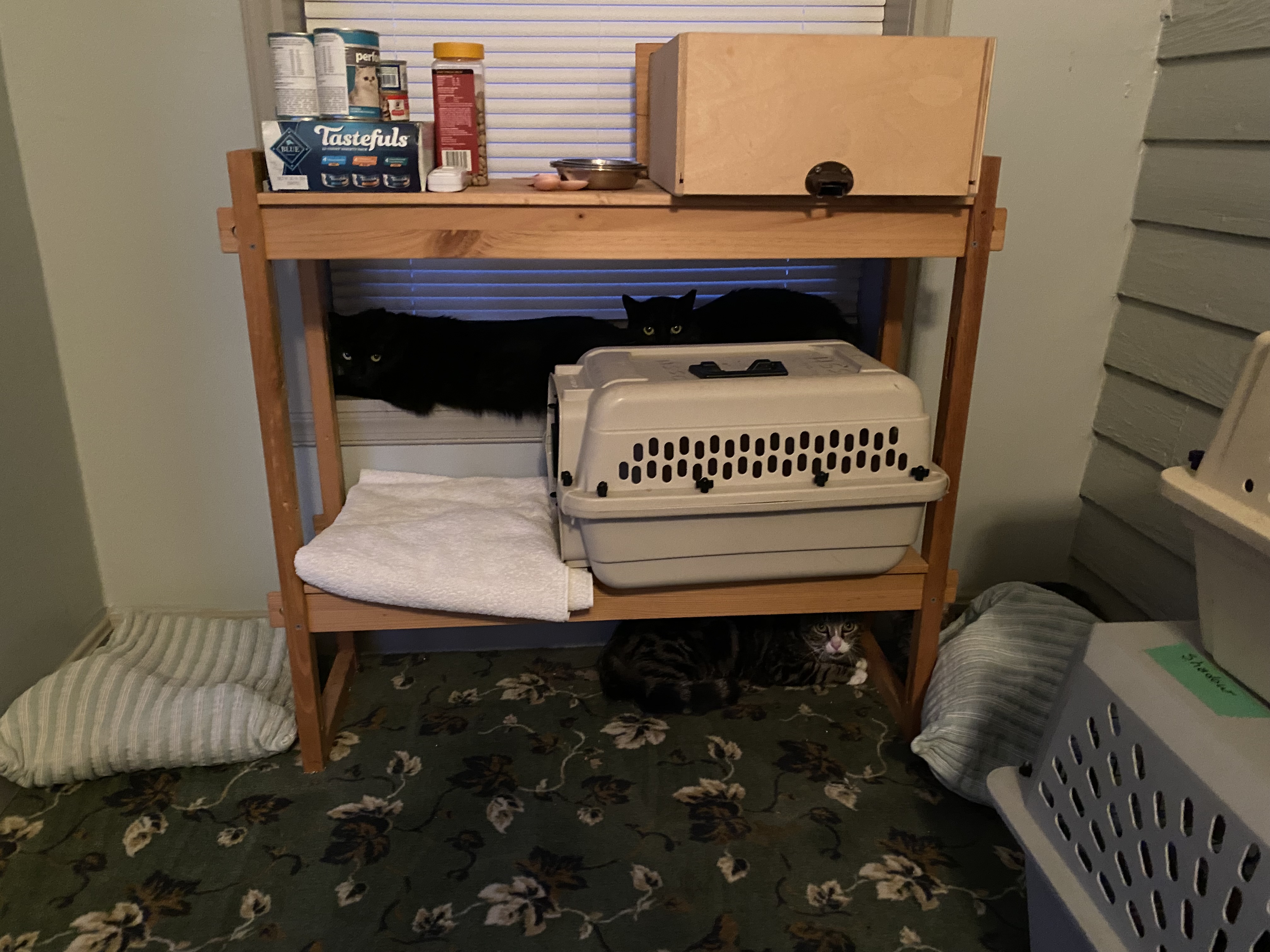 2. Look at you and Nick, becoming cat people (and if getting an a/c unit for the cat room isn’t on the road to Cat Town, I don’t know what is :-D). You gave great and appealing descriptions of the Ladies. Willow will probably come around, but it caught my eye that she wasn’t interacting much with the other cats. Do the other cats groom each other or sleep next to each other? Could she be somewhat bullied by one or more of the other cats? I’m guessing not enough to be avoiding the litterbox (or you would have mentioned something), but in a more subtle way. Cats who don’t grow up together can definitely co-exist peacefully, but they generally need some space, whether horizontally or vertically. I could easily be completely offbase, and Willow is just shy and needs more time than the others to warm up. You’re doing a great job!