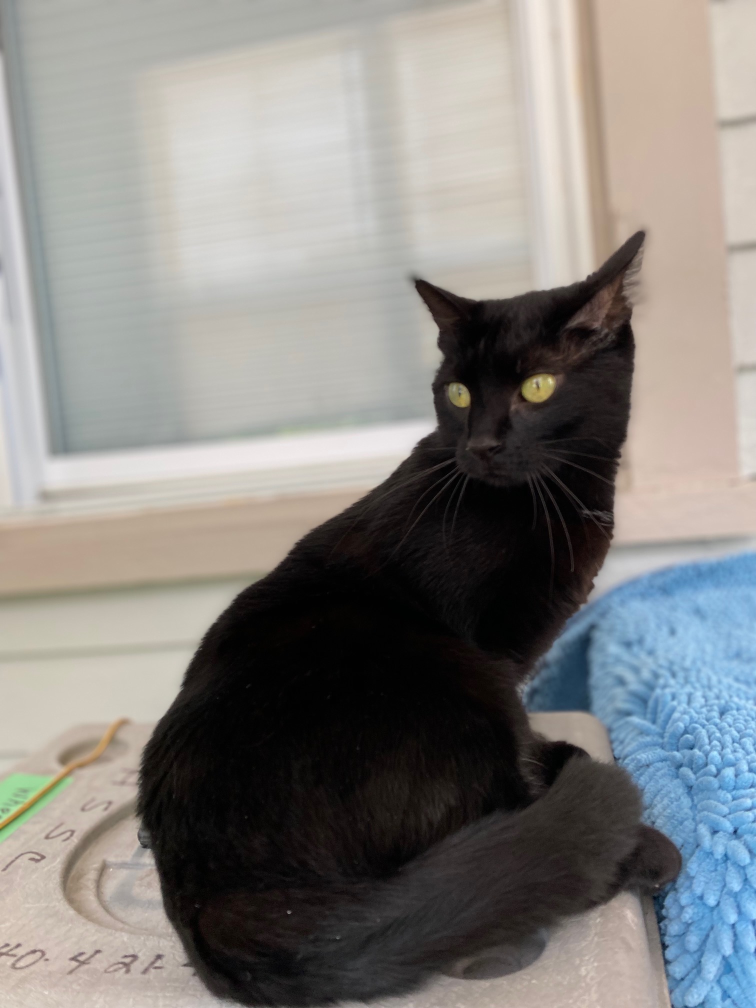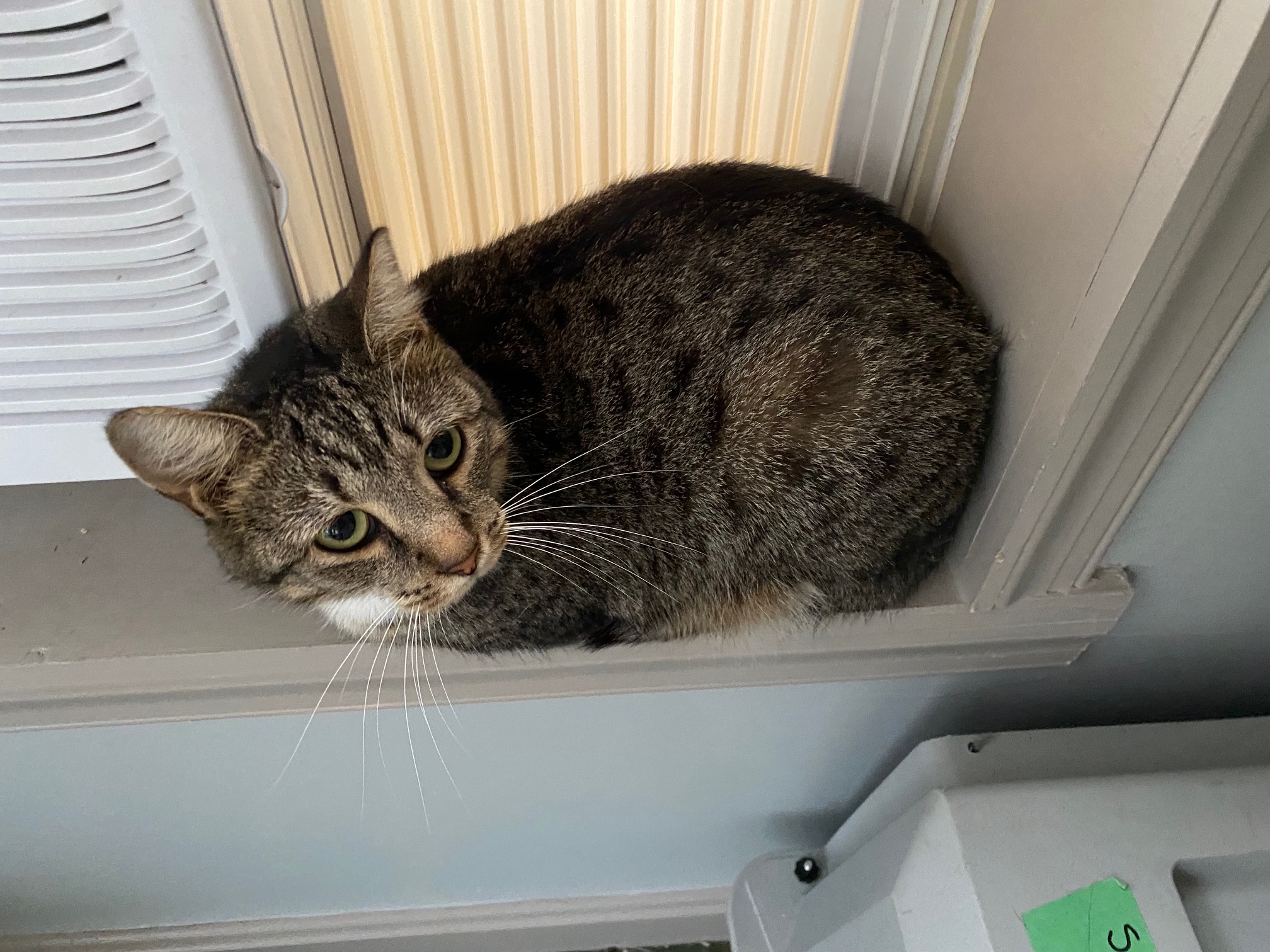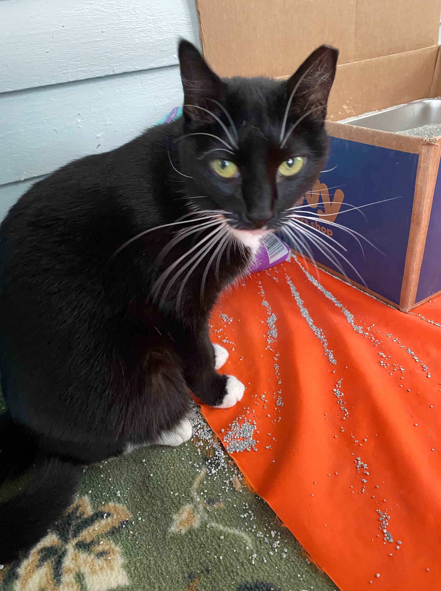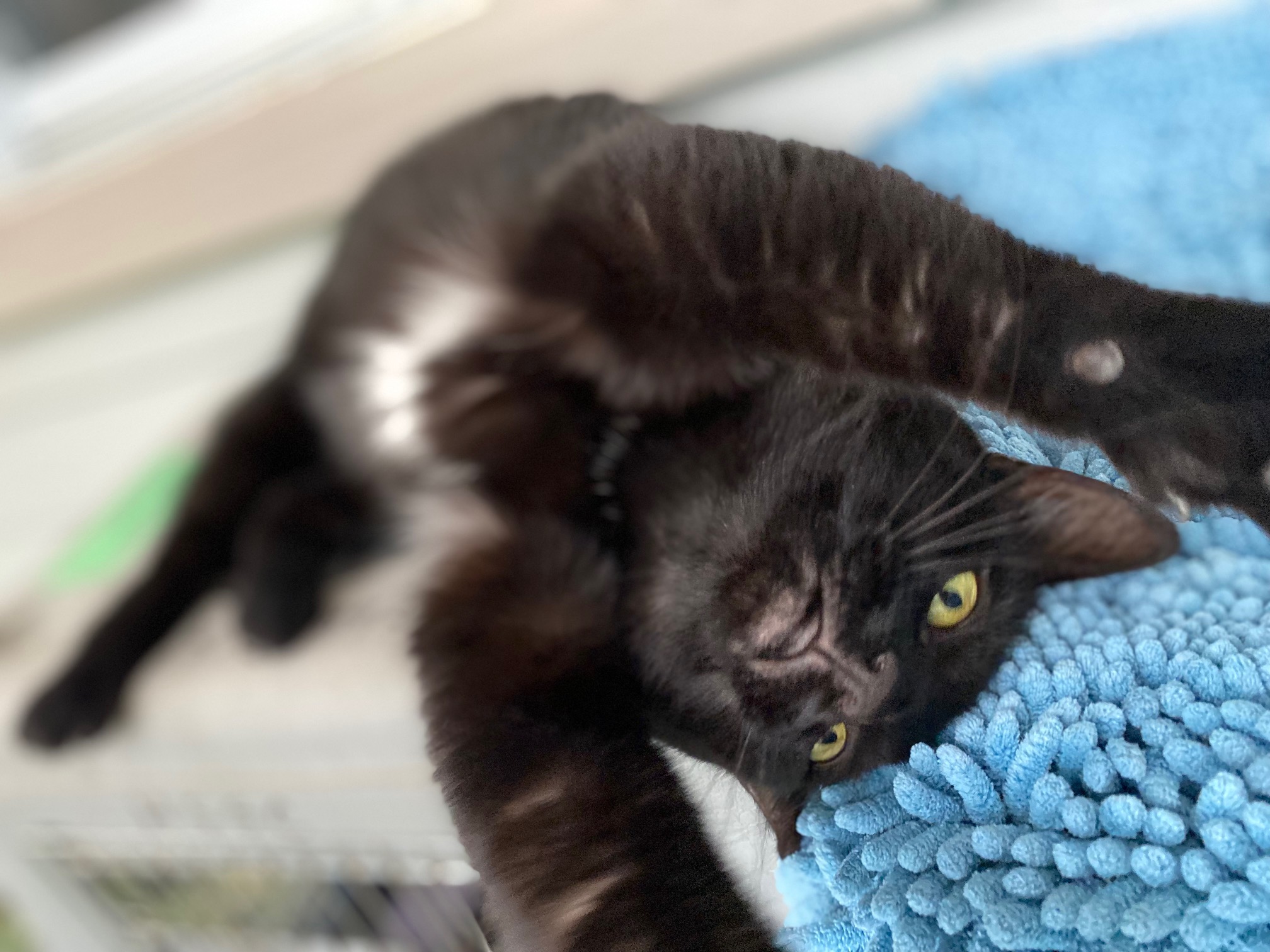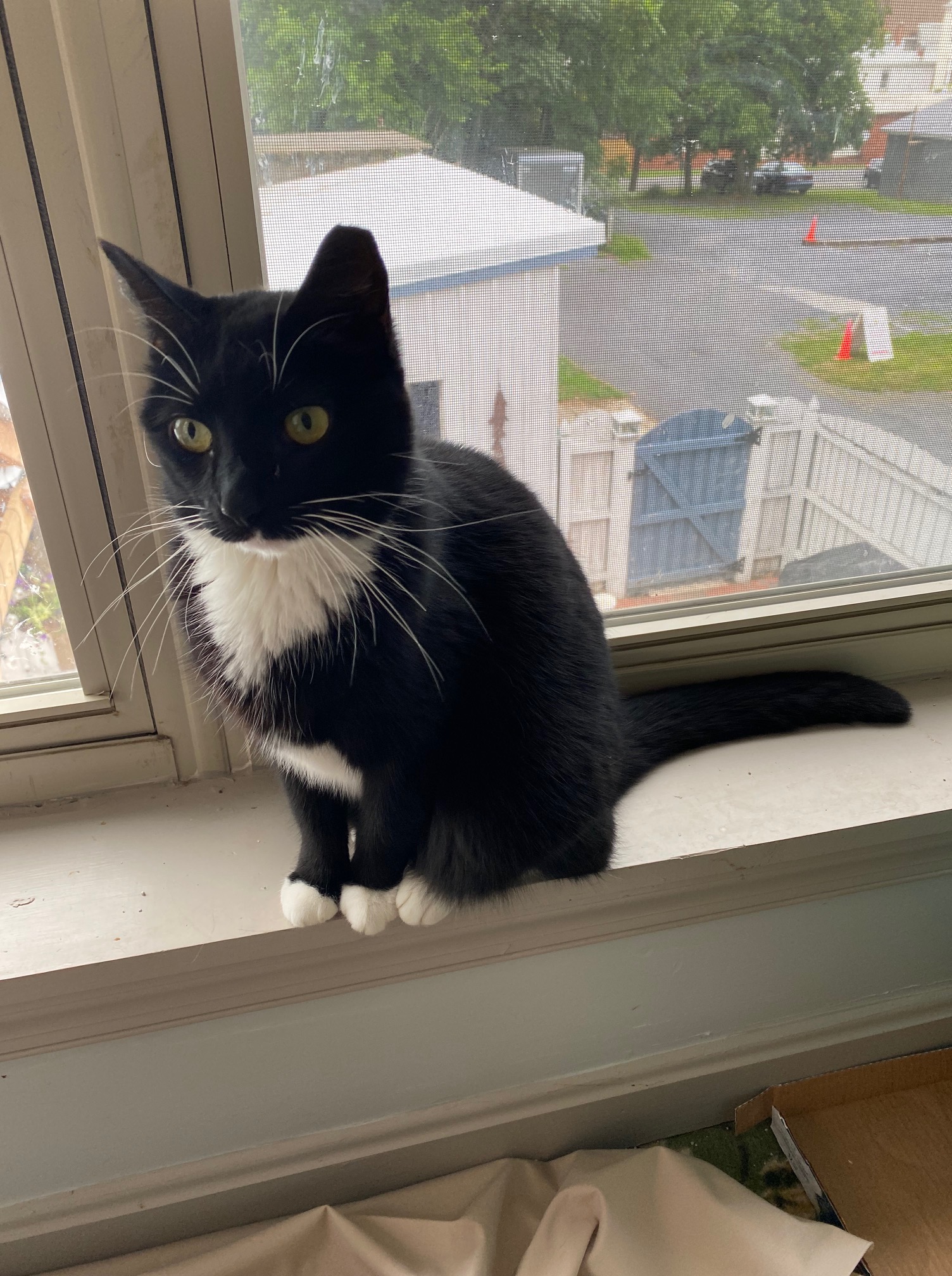 Mittens is gorgeous. I am in love with her white whiskers. She’s maybe a tad shyer than the others, but is definitely coming around. She loves to snuggle more every day. She also loves to play with strings and lounge on the windowsills watching the comings and goings of the ice cream store parking lot.