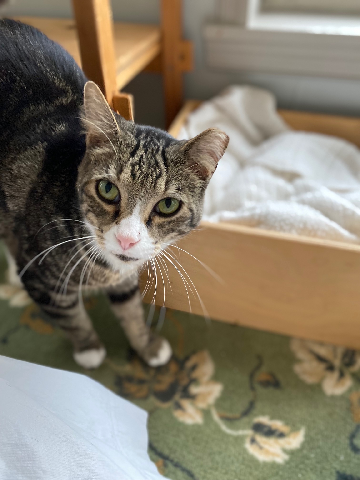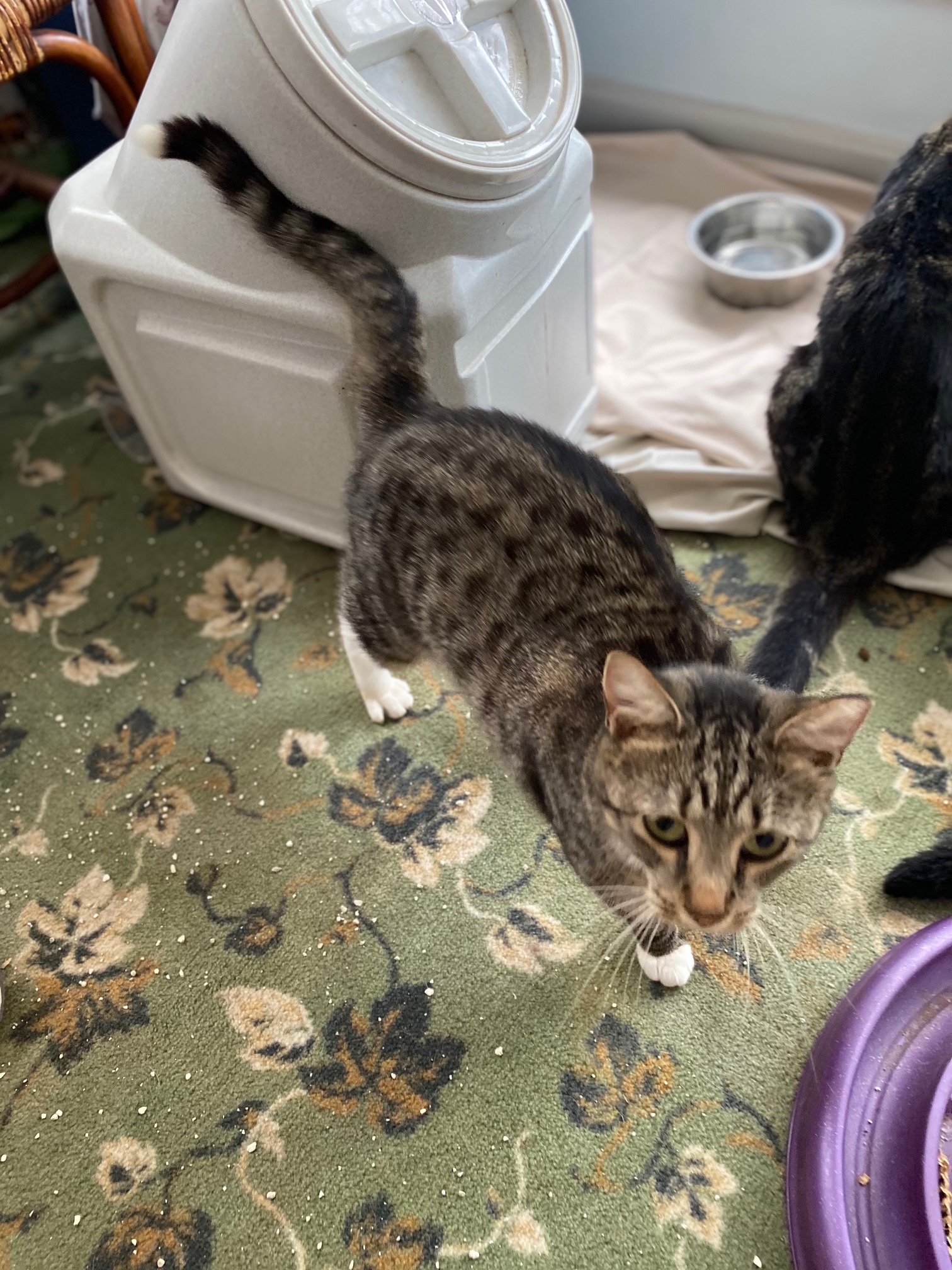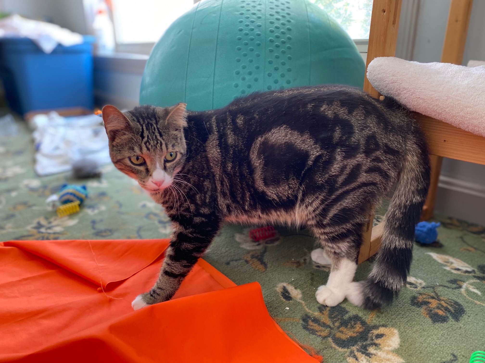 Last is Willow who I don’t know much about because, as I mentioned, she is still warming up to me. She seems to be the one cat truly morning her losses. I rarely see her out interacting with the others and for the first three days she hid completely squished behind some cat carriers. Several times I panicked when I couldn’t find her. If I approach her now, she doesn’t run away, only braces herself for my pets. And once, when I was playing with the others and made the universal cat-calling sound of ‘tsch-tsch-tsch’ she ran towards me as if I was a long-lost friend, allowed a few pets, and then wandered back to her spot, disappointed. She has an awesome coat pattern (spotted tabby!) and sweet white paws and bib.