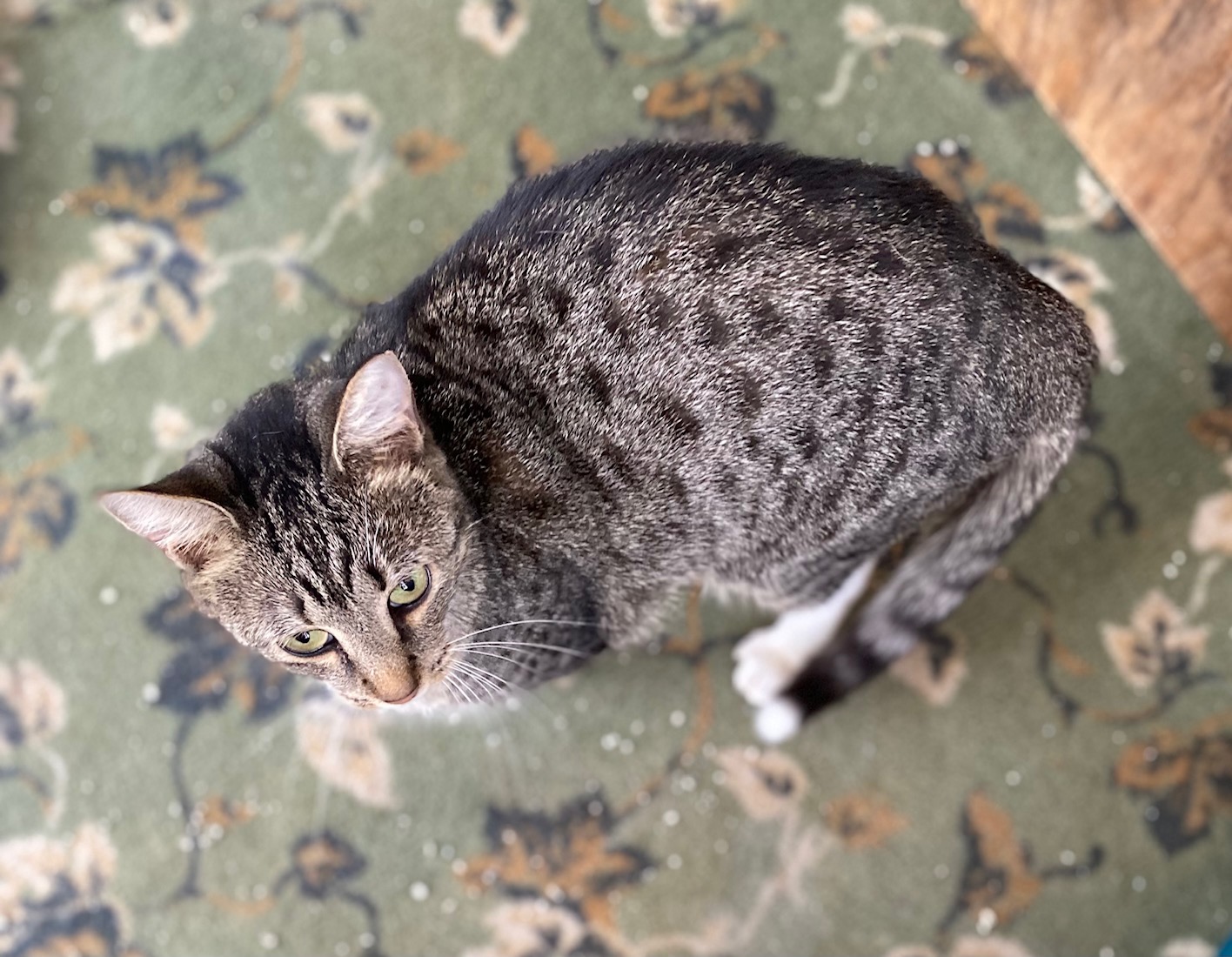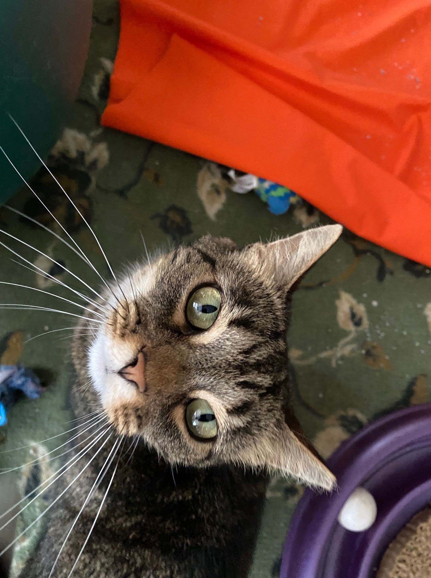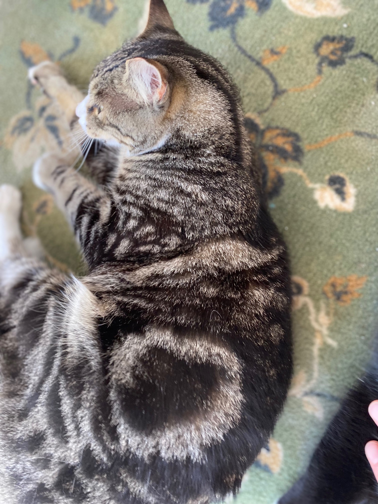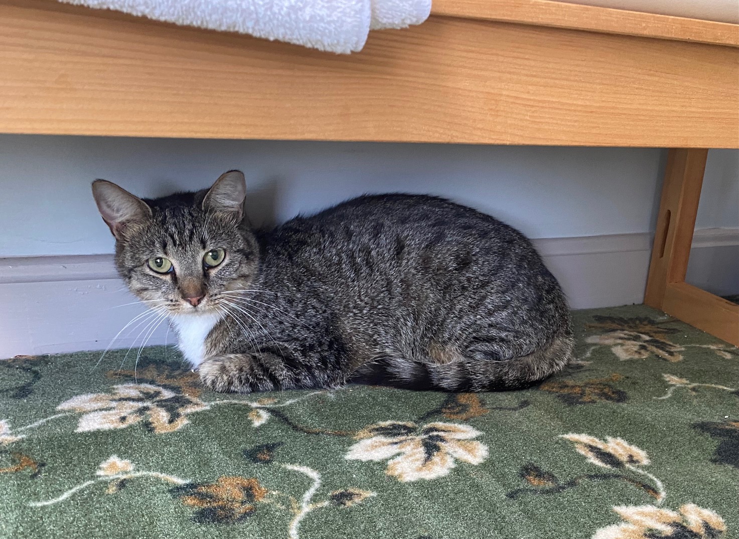 Last is Willow who I don’t know much about because, as I mentioned, she is still warming up to me. She seems to be the one cat truly morning her losses. I rarely see her out interacting with the others and for the first three days she hid completely squished behind some cat carriers. Several times I panicked when I couldn’t find her. If I approach her now, she doesn’t run away, only braces herself for my pets. And once, when I was playing with the others and made the universal cat-calling sound of ‘tsch-tsch-tsch’ she ran towards me as if I was a long-lost friend, allowed a few pets, and then wandered back to her spot, disappointed. She has an awesome coat pattern (spotted tabby!) and sweet white paws and bib.