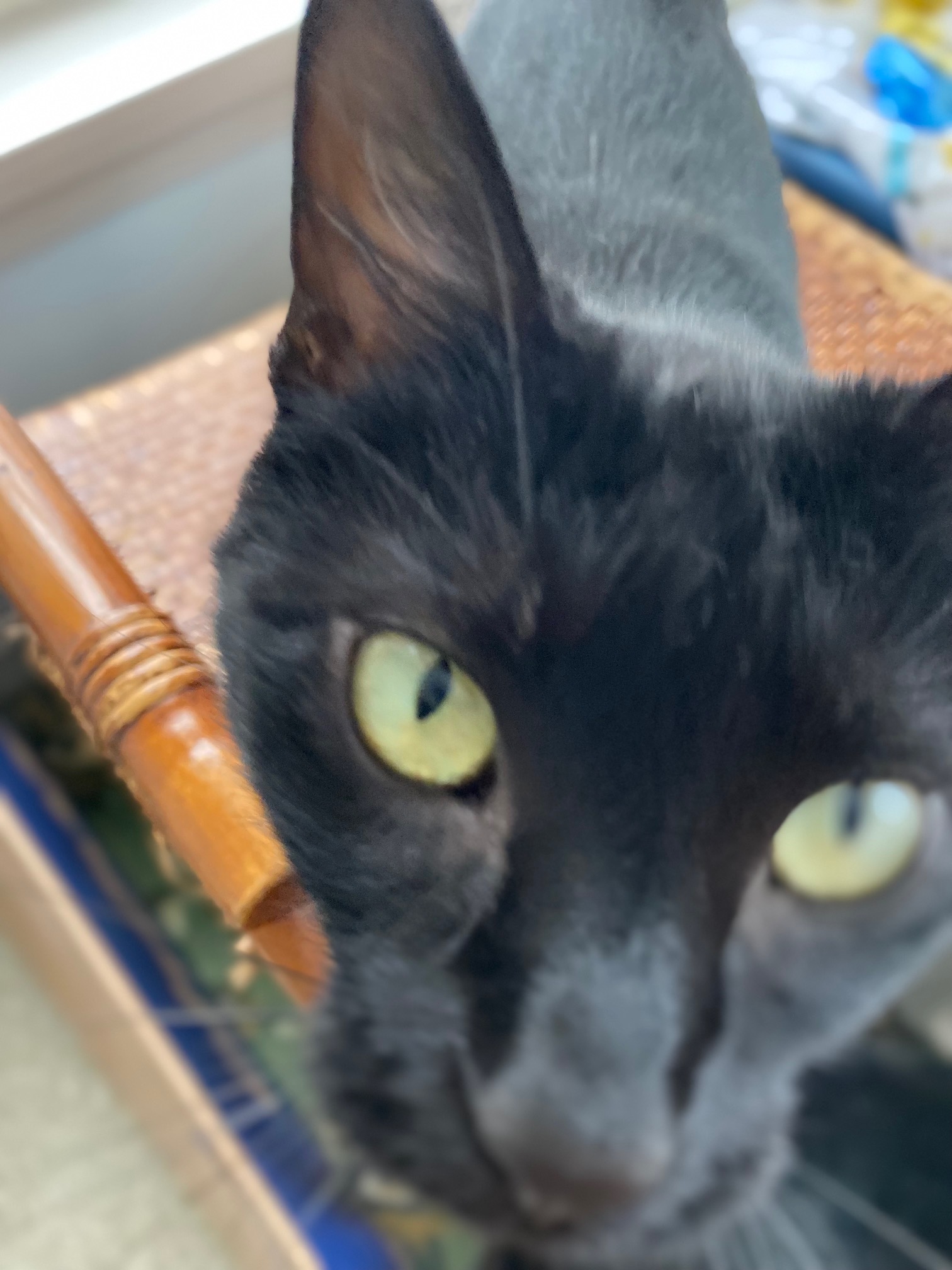 Shadow is the pushiest of the girls, shoving her way to the front of the line for attention and following me like an (ahem) shadow. She is very vocal, demanding my attention. Her eyes are startling and we sometimes have staring contests as I try to figure out what is going through that busy mind. Shadow has a few boo-boos healing on her back. Her previous owner reported that Shadow was an indoor/outdoor cat and an excellent bird hunter. Those cuts are from birds attacking her when she went after their nests. She seems content on our porch, though, just watching the outside action so far.