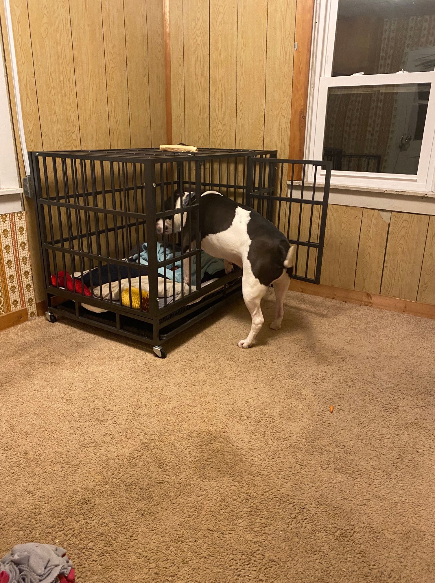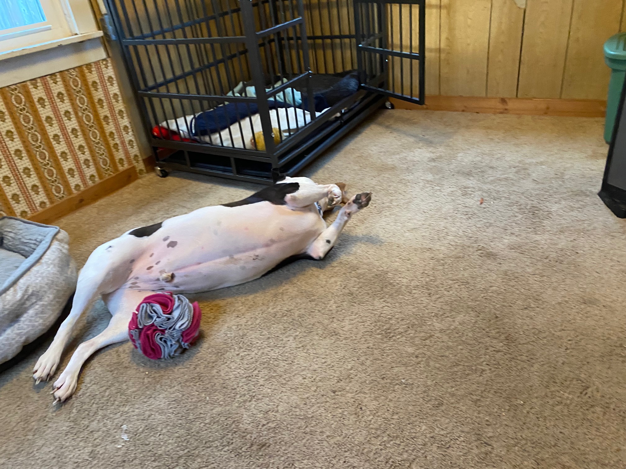 I thought Moose didn’t like his crate because I had to lure him in it the first few days. Unlike some other resistant fosters, with his size, there was no ‘putting’ him in the crate if he didn’t want to go. Once in, I gave him a few small treats and lots of praise and petting, but no matter what after I left, he would sing his sad song. The length of that song has shortened every day, but he still sings.