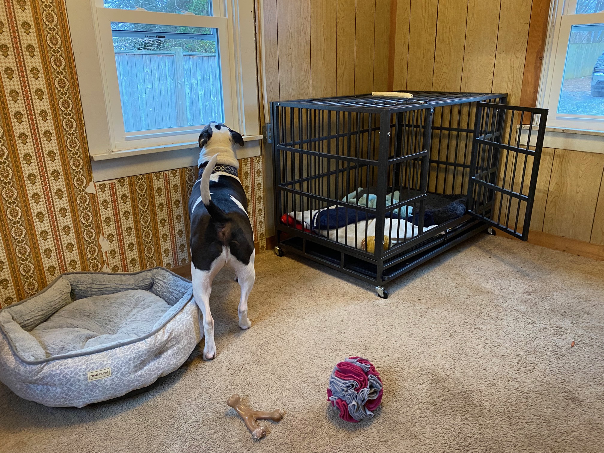 After only two days, he began going into his crate voluntarily to relax. This makes it clear that it’s not the crate, it’s the being left alone. He hates it. And that breaks my heart because this dog has been alone for months.