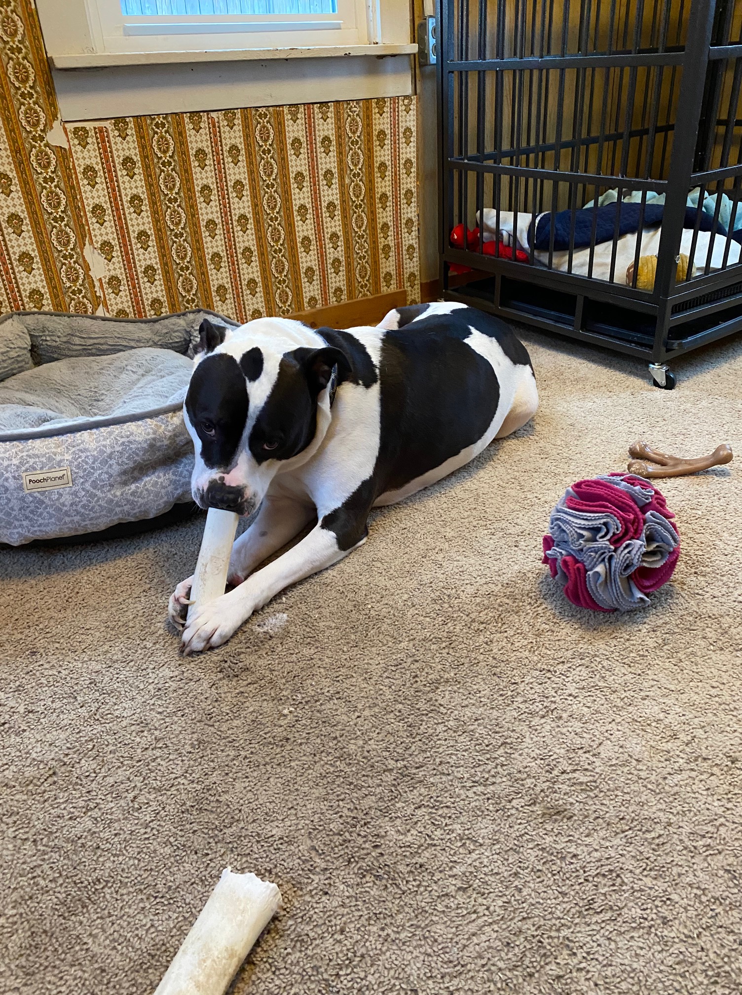 Moose is a project. Sure, I’d love for an adopter to step up, but for now, I will keep helping him learn to feel safe by himself, and to know that his needs will be met. He’ll get attention and affection, chew toys, and opportunities to play in the grass, and sniff to his heart’s content. We will get some excess weight off of him with a healthy diet, vitamins, probiotics, and eventually exercise.