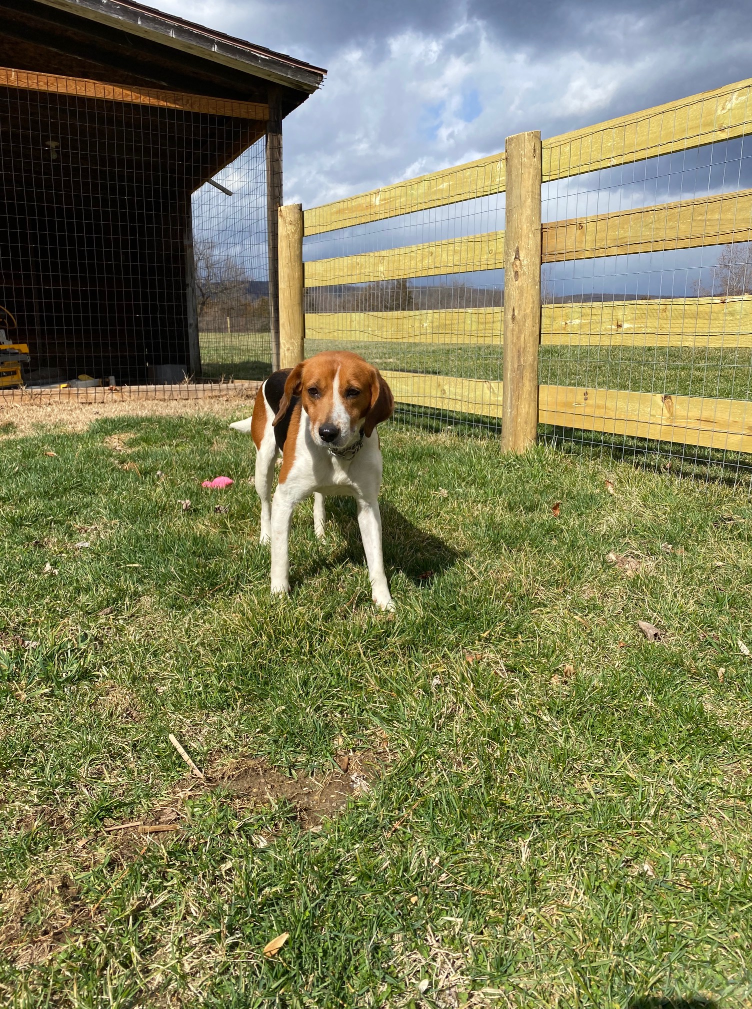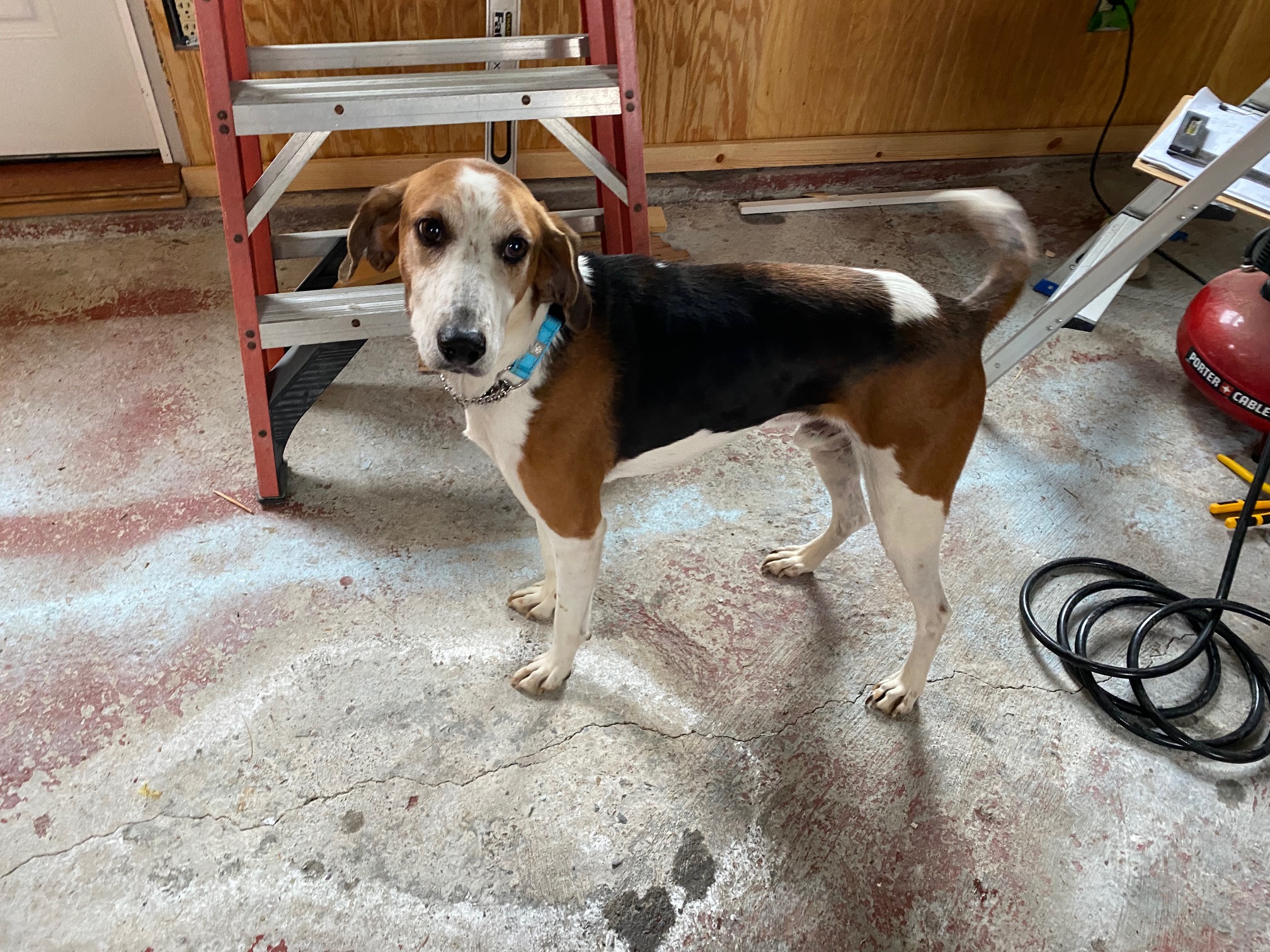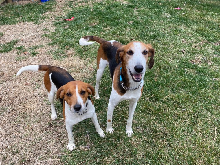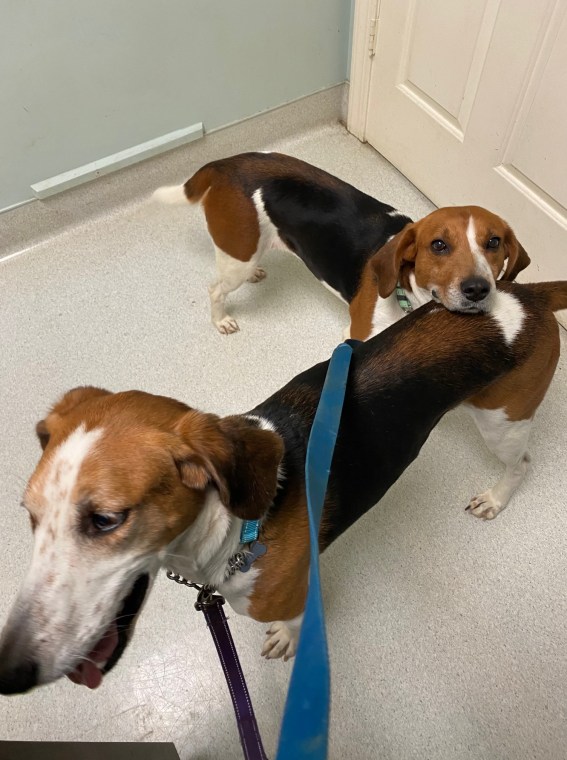 But, considering their plight, these dogs are doing well. They are sweet and funny, quirky like every other hound dog I’ve met. Sam is probably a beagle mix –she’s a little firecracker, curious, impulsive, and busy. Rufus, a leggy foxhound, has a lot of energy for an underweight, older dog. He’s believed to be seven. He is lovely and affectionate, a little wary of noises and sudden movements, but so darn sweet.