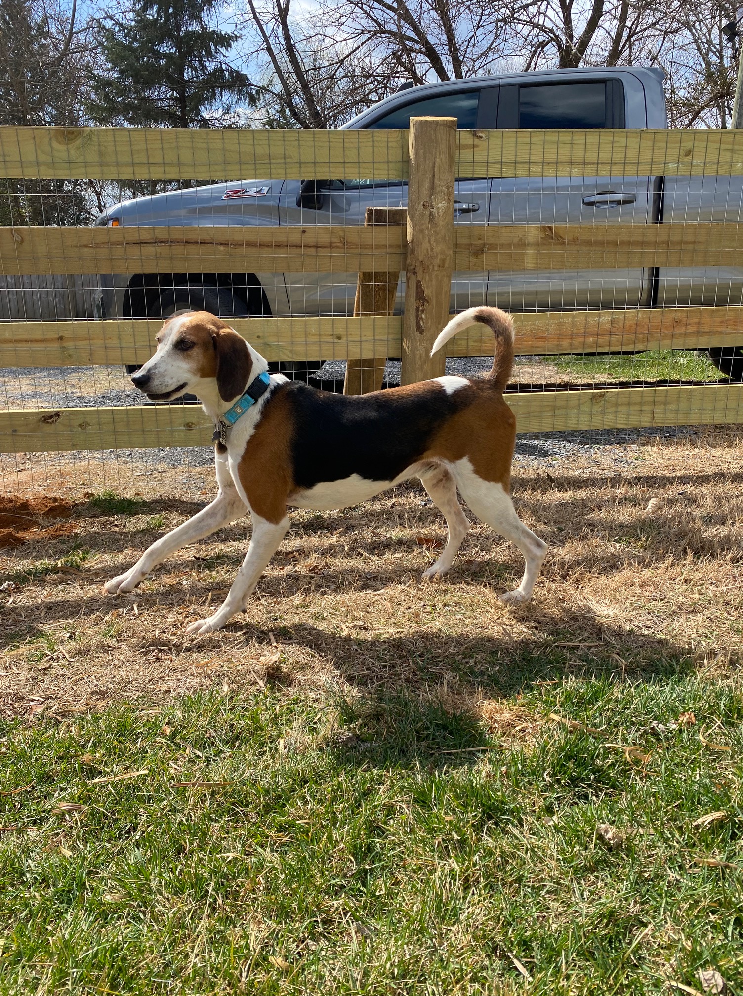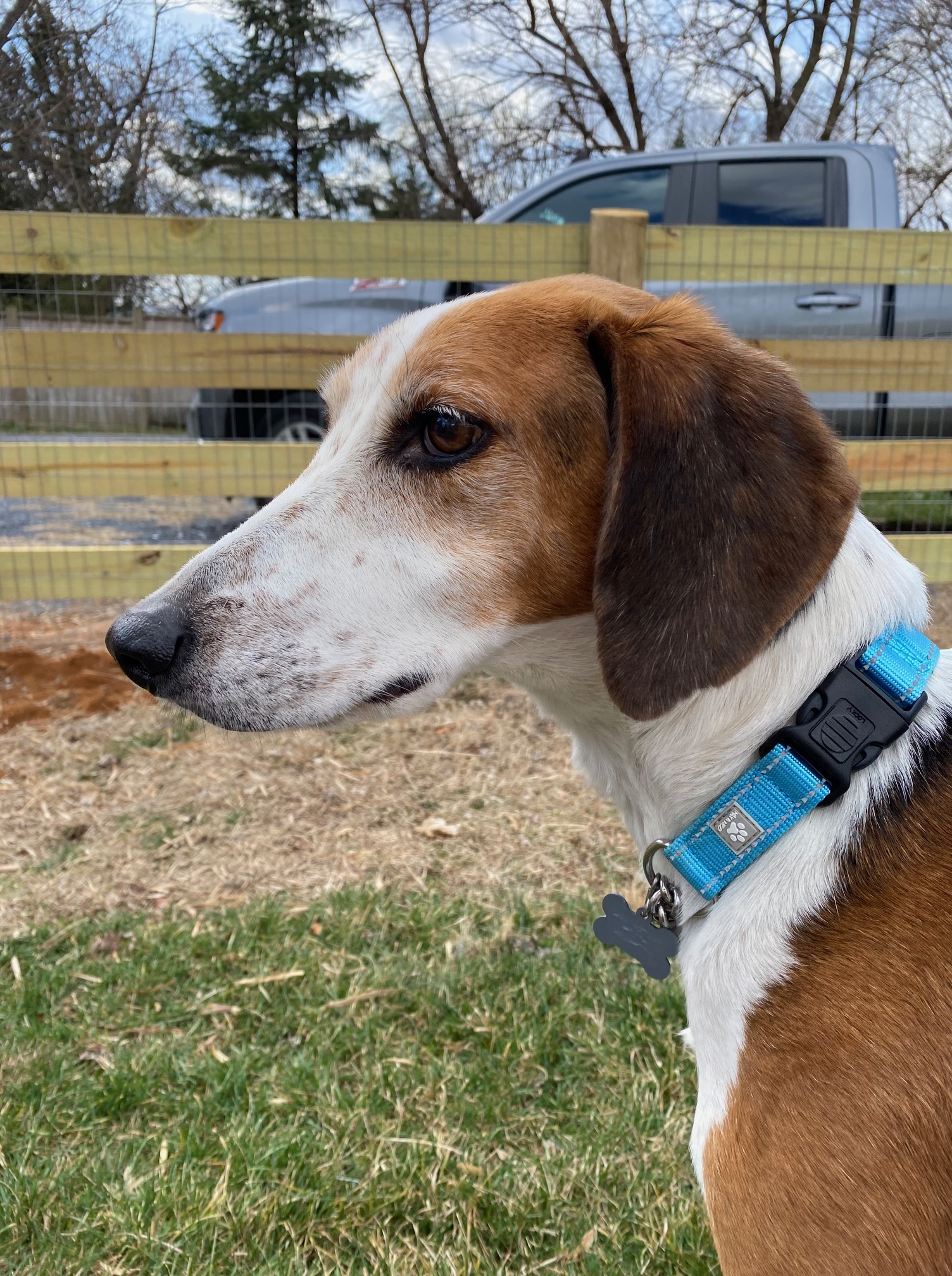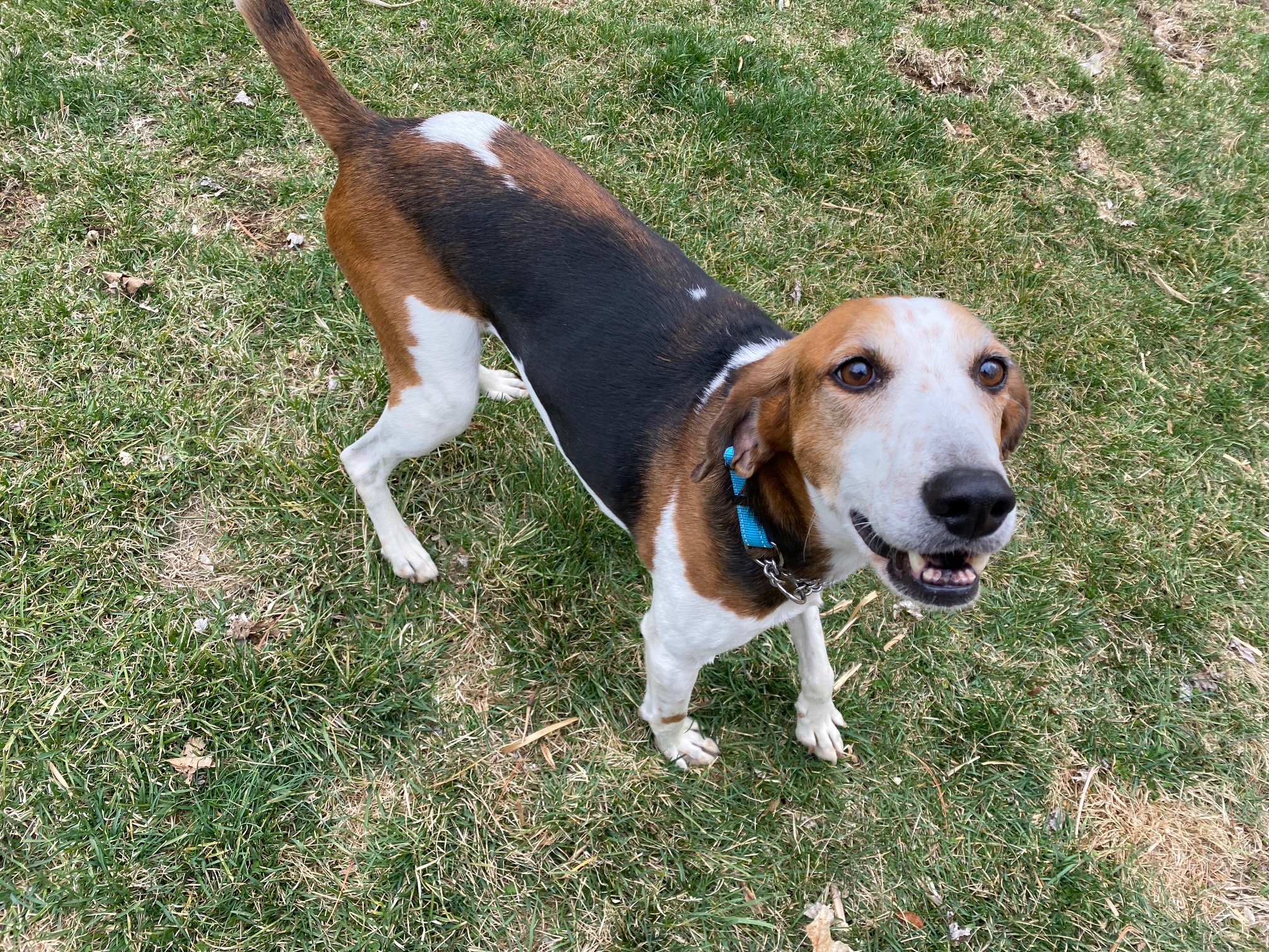 But, considering their plight, these dogs are doing well. They are sweet and funny, quirky like every other hound dog I’ve met. Sam is probably a beagle mix –she’s a little firecracker, curious, impulsive, and busy. Rufus, a leggy foxhound, has a lot of energy for an underweight, older dog. He’s believed to be seven. He is lovely and affectionate, a little wary of noises and sudden movements, but so darn sweet.