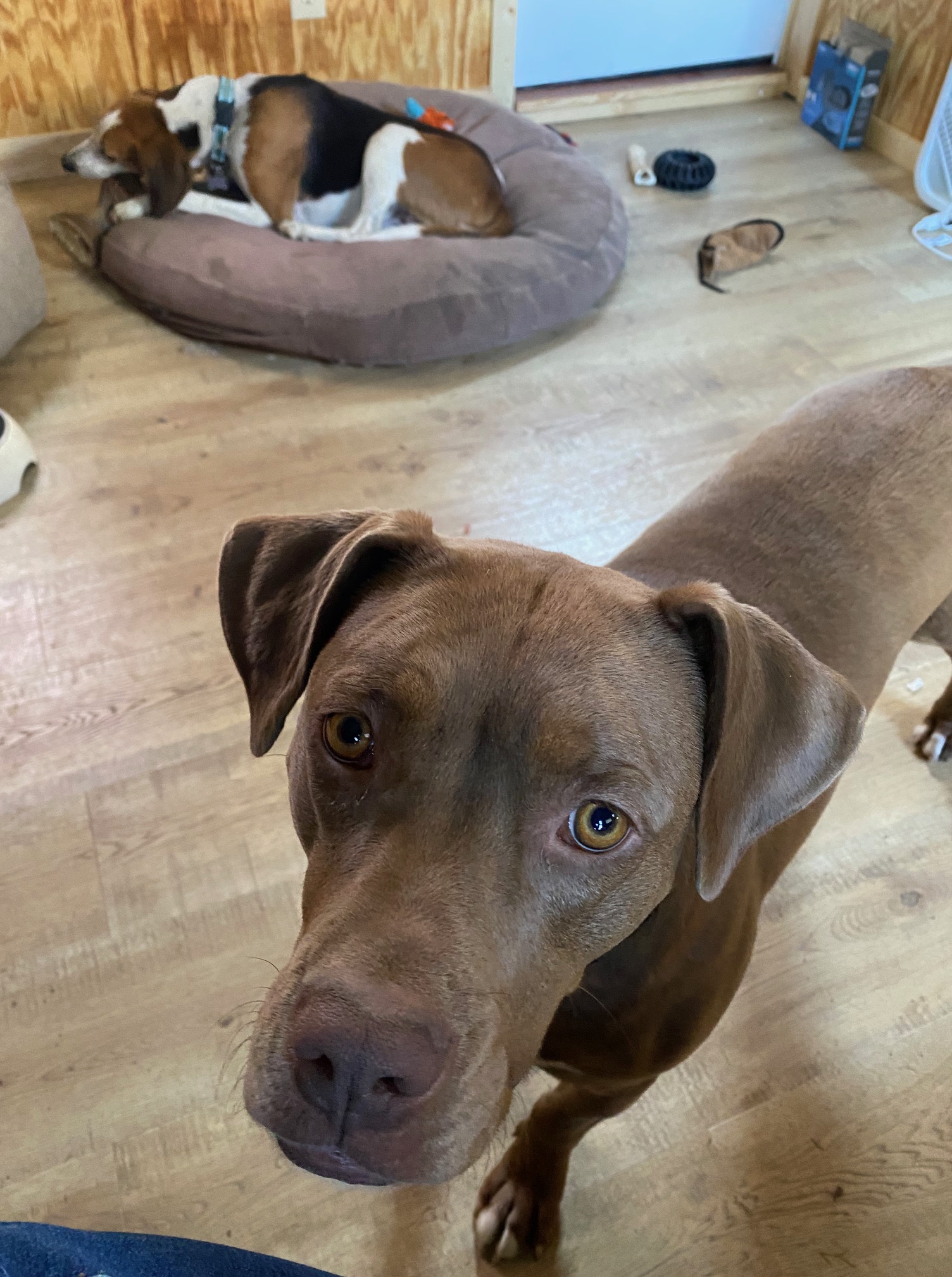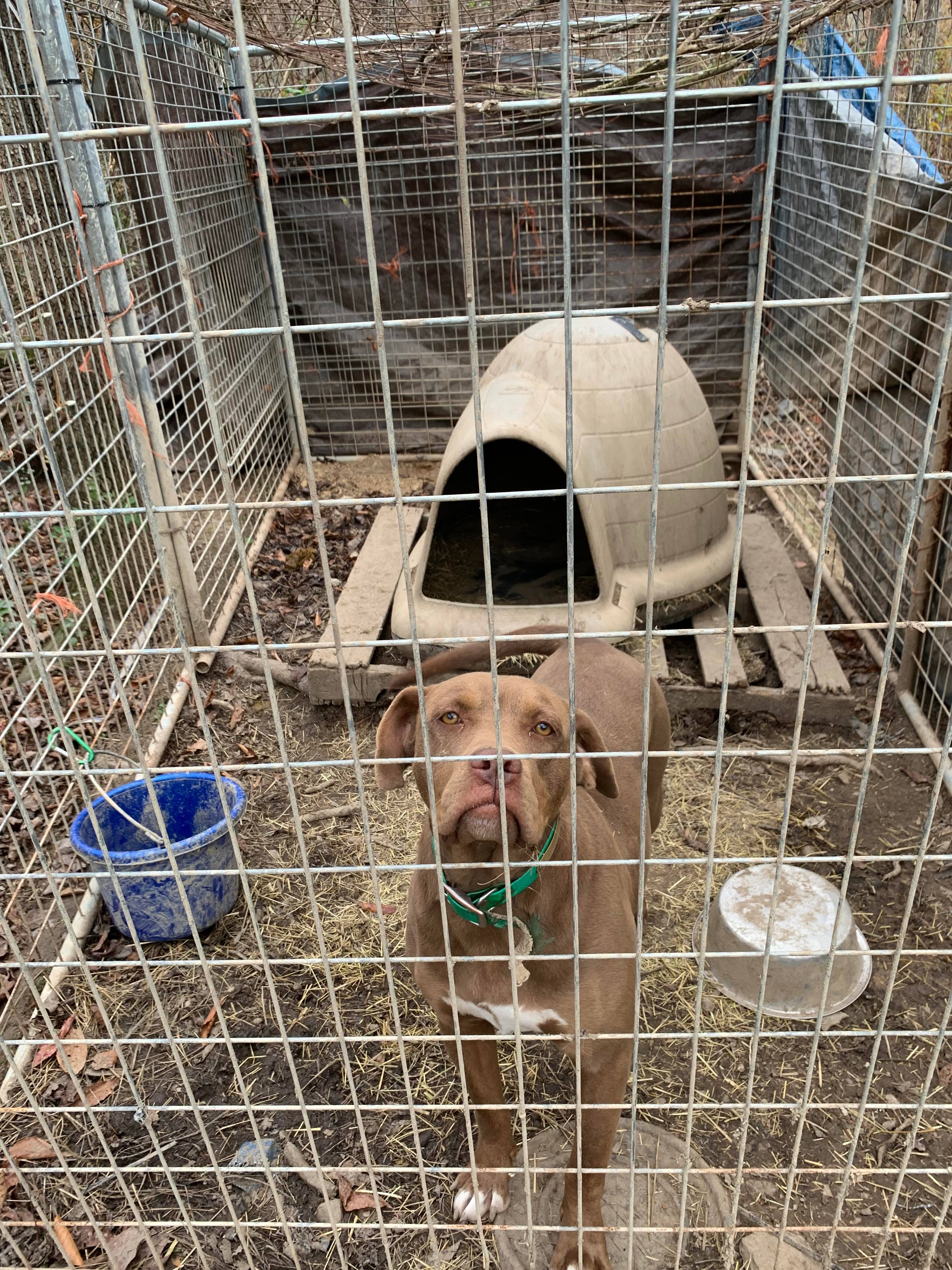 SWD is an outdoor shelter and Gina lived there from November 2021 until December 2022, the better part of her puppyhood. For part of her stay, she was kenneled with a dog named Chip. Their chainlink enclosure was in the woods, had one igloo dog house, and no roof. She was fed/watered once a day by a dedicated woman who is overwhelmed by the immense need in the county and is single-handedly trying to help.