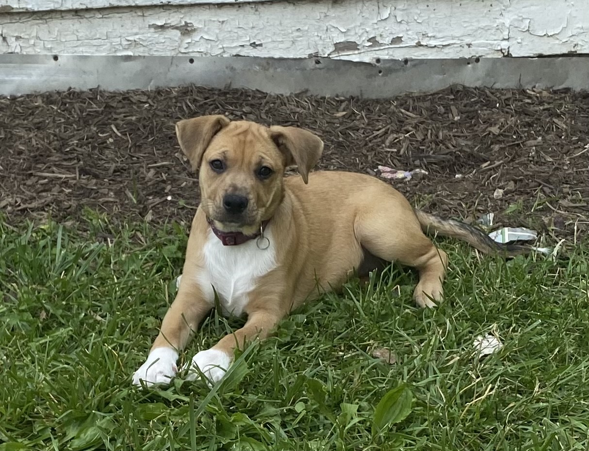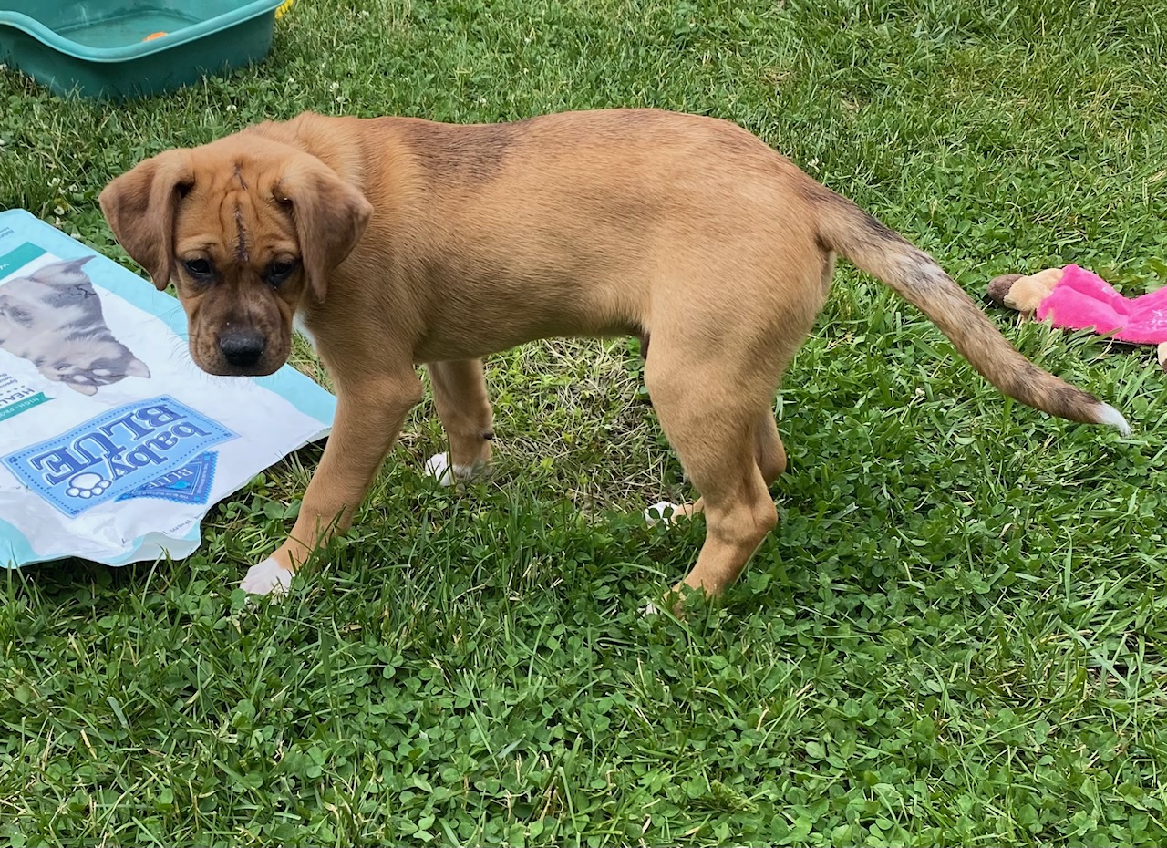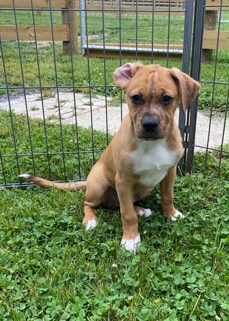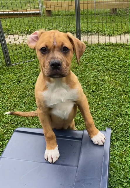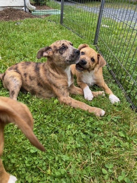 Bubby is the leader. His favorite game is Keepaway. The puppies love to find longer pieces of mulch (sticks to them) and then wrestle over them. Never mind that there are dozens of other sticks to choose from, whichever stick Bubby chooses becomes the one everyone wants. He loves to race around the pen taunting the others. He will need plenty of opportunities to play with other dogs and will probably enjoy going on outings.
