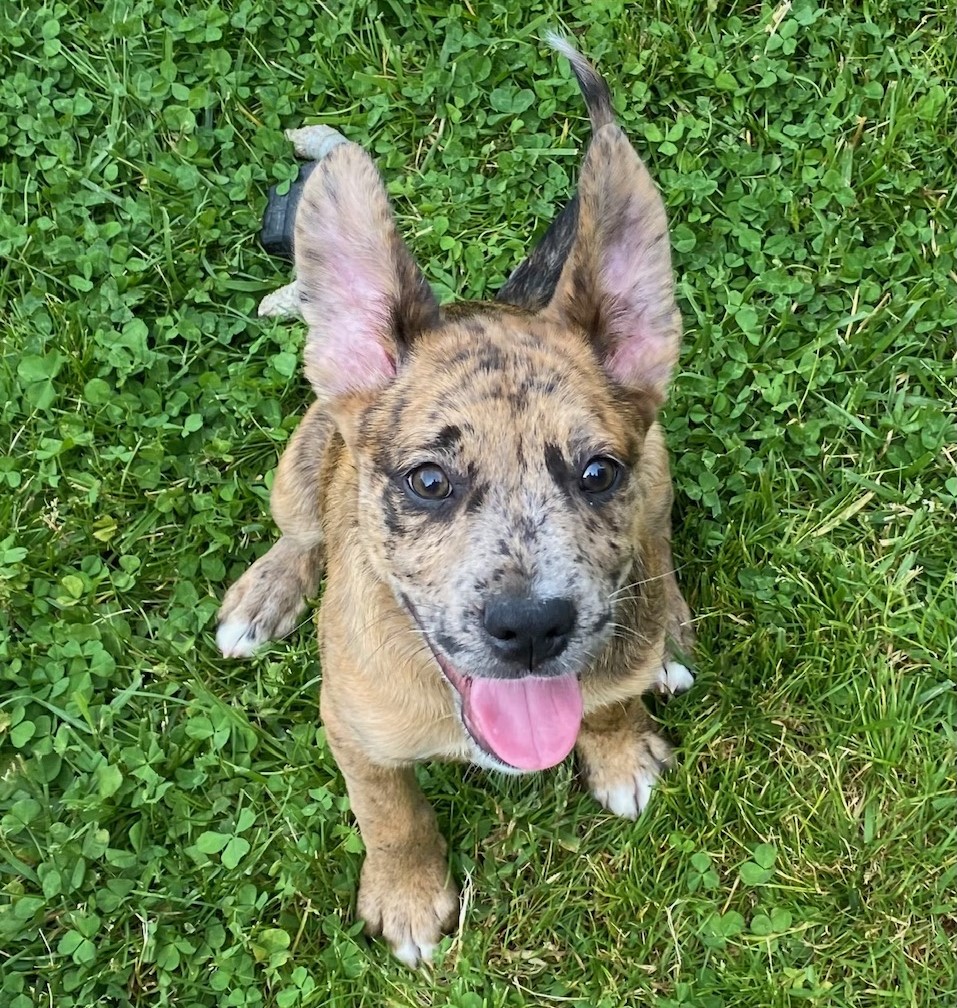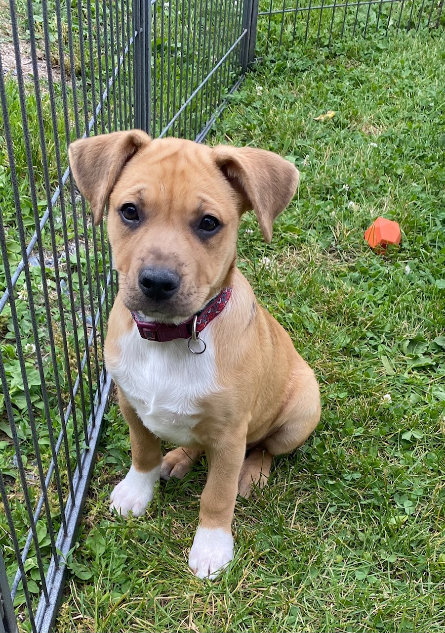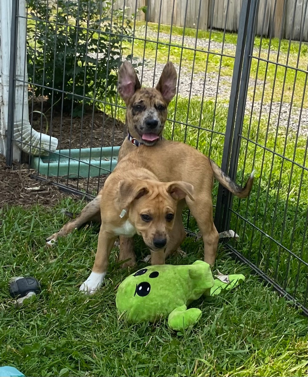 Bubby is the leader. His favorite game is Keepaway. The puppies love to find longer pieces of mulch (sticks to them) and then wrestle over them. Never mind that there are dozens of other sticks to choose from, whichever stick Bubby chooses becomes the one everyone wants. He loves to race around the pen taunting the others. He will need plenty of opportunities to play with other dogs and will probably enjoy going on outings.