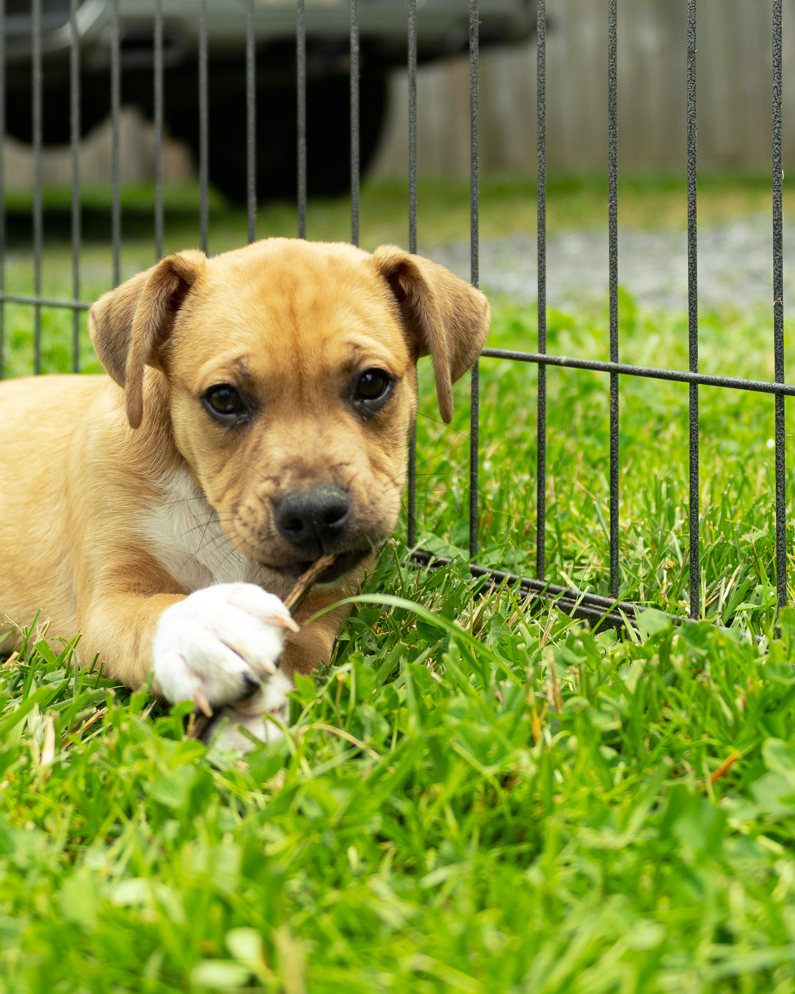 Nubby is persistent. He stays close to Bubby grabbing for the stick occasionally, but mostly just waiting for Bubby to get distracted (which he will). Then he grabs the stick, finds a quiet corner, and hunkers down to chew until one of the other puppies pounces again. He has great focus, and he loves to chew. His adopters will need to provide plenty of long-lasting chew toys to keep him happy.