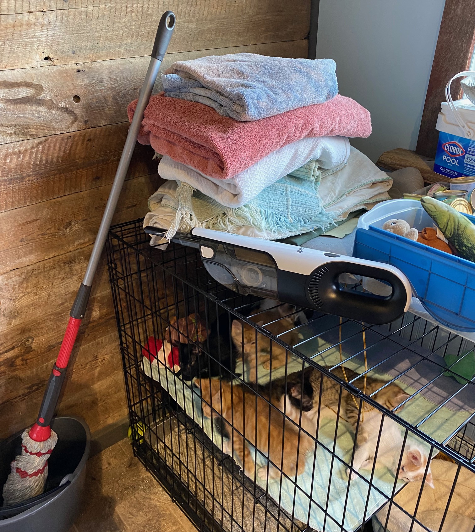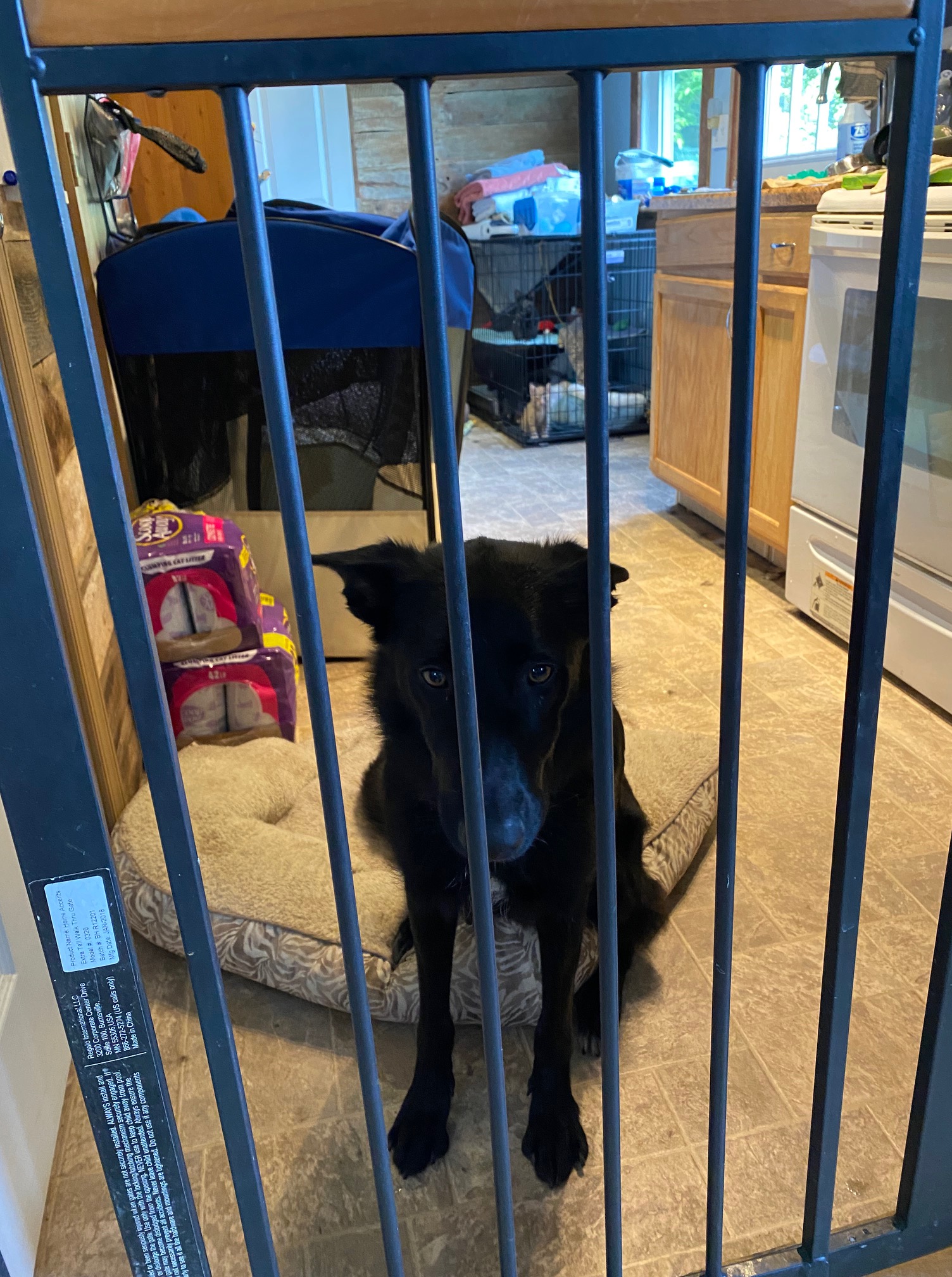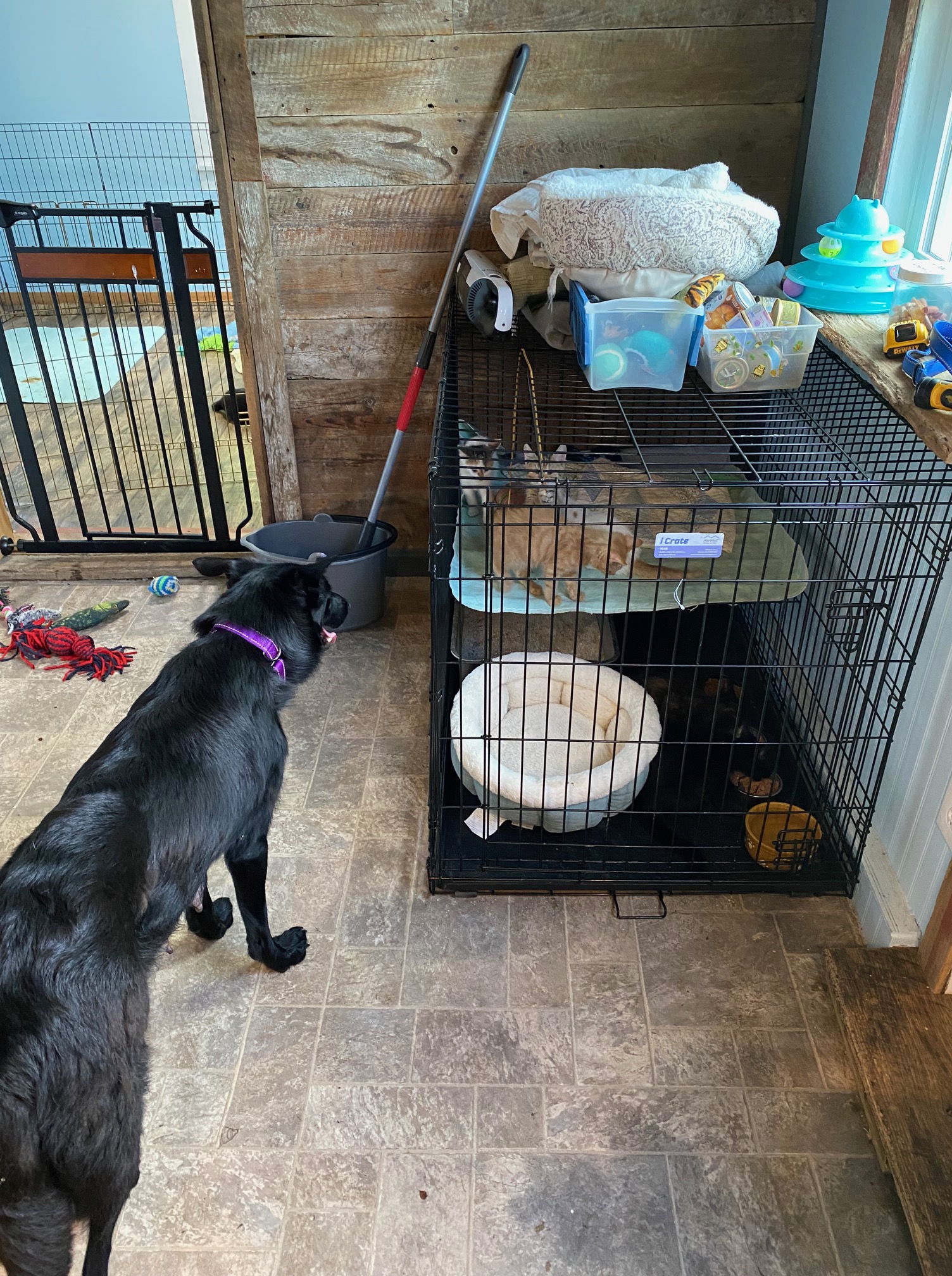 The reason Stela is free-roaming and not crated to prevent misdirected chewing or the overly rowdy kitten play sessions is that there is no crate for Stela because Argus returned from his trial adoption.