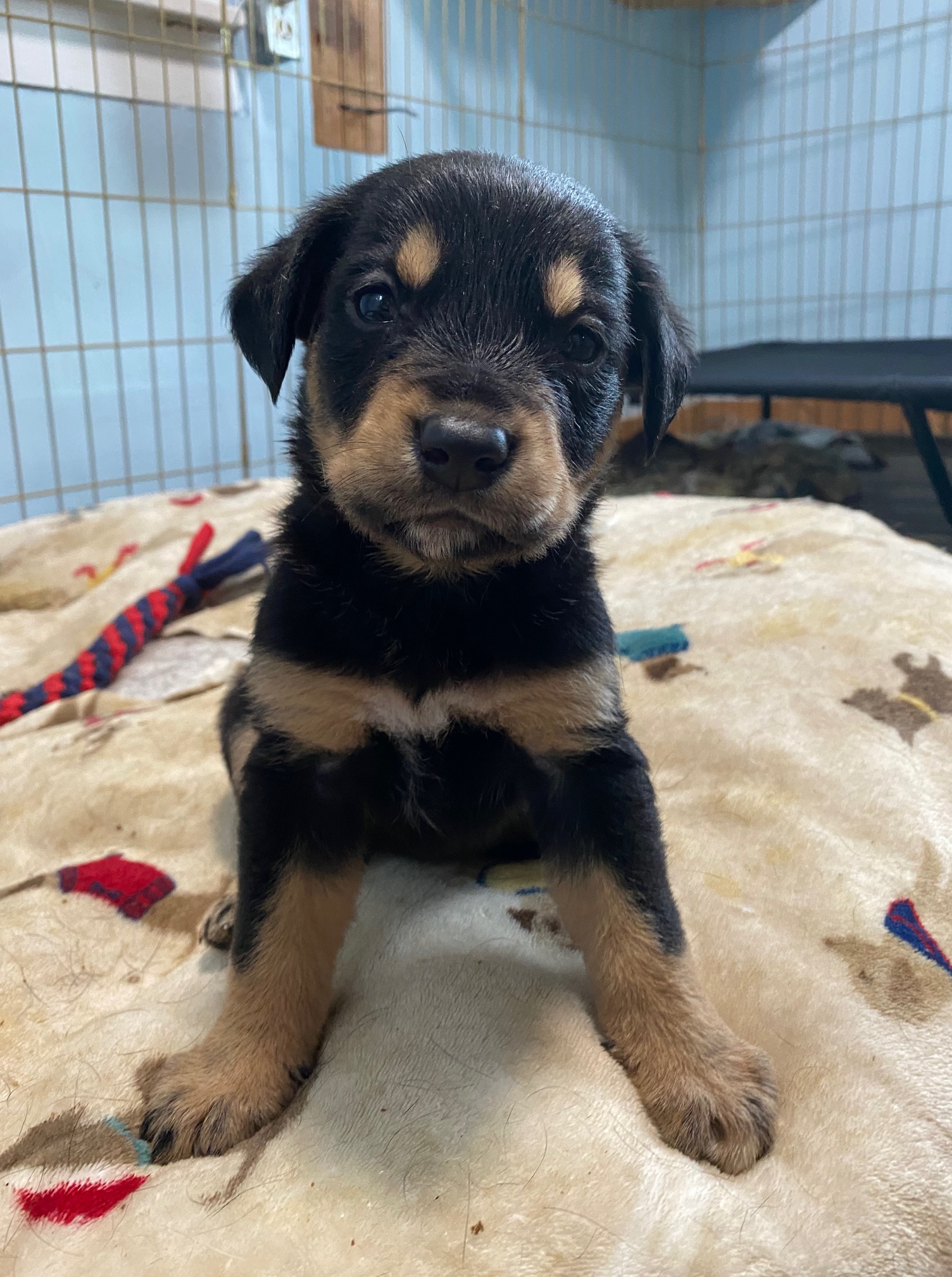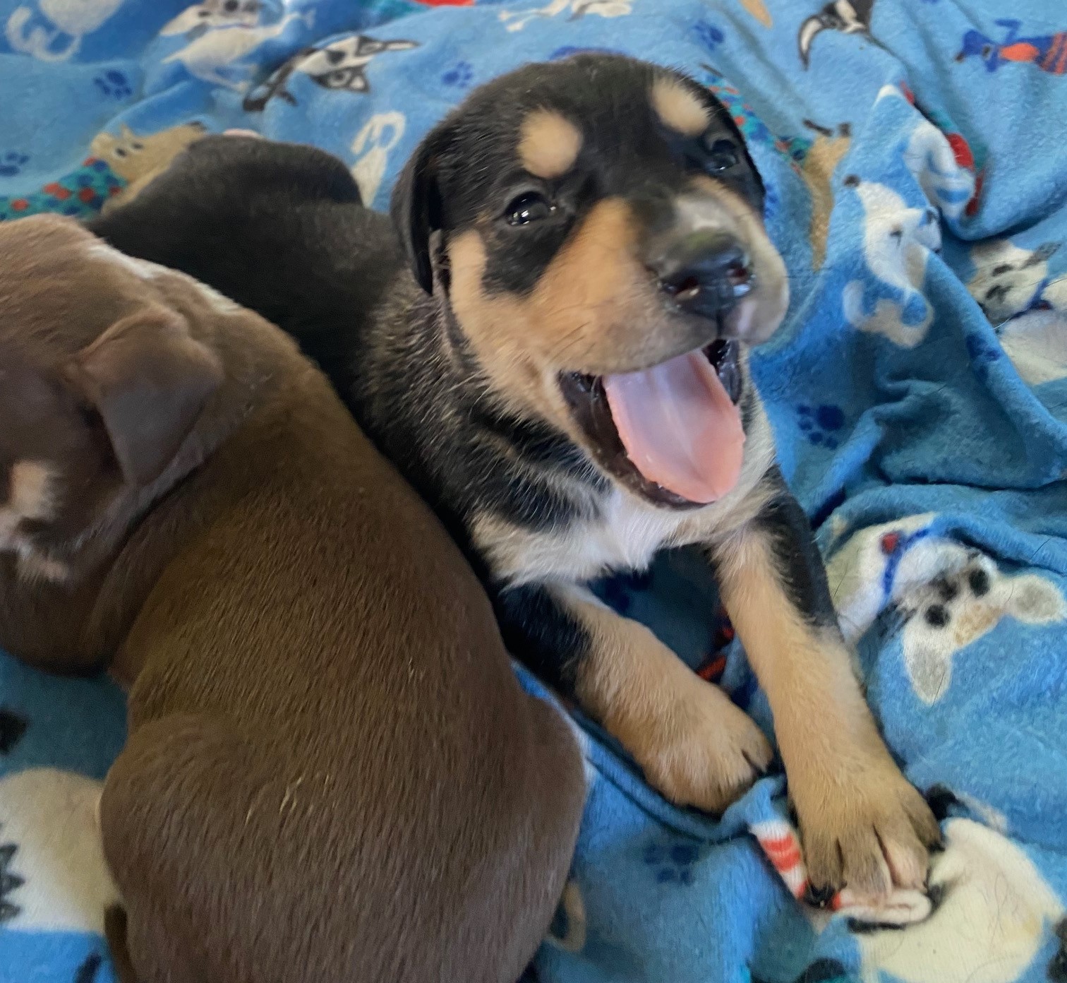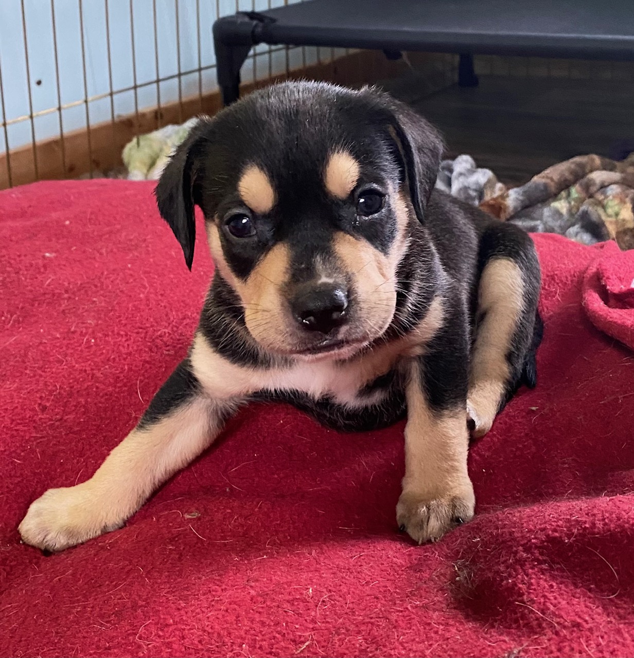 Bing is the black puppy with the defined markings of a rottweiler (in miniature). He is absolutely striking and has a gorgeous coat like a seal that is black with tips of gold. He is an independent guy who is content playing with a toy or chewing on a the zipties that hold the pen together. He is all in when invited to wrestle. He’s a great ‘poser’ (I can set him in a sit and take lots of pictures), so I think he’d make a great Instagram star, especially with those eyebrows and curious face.
