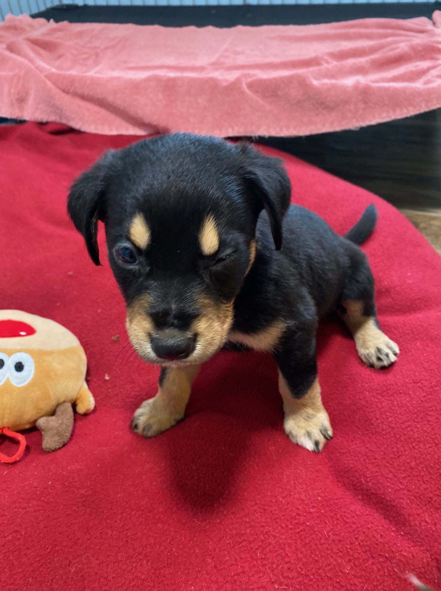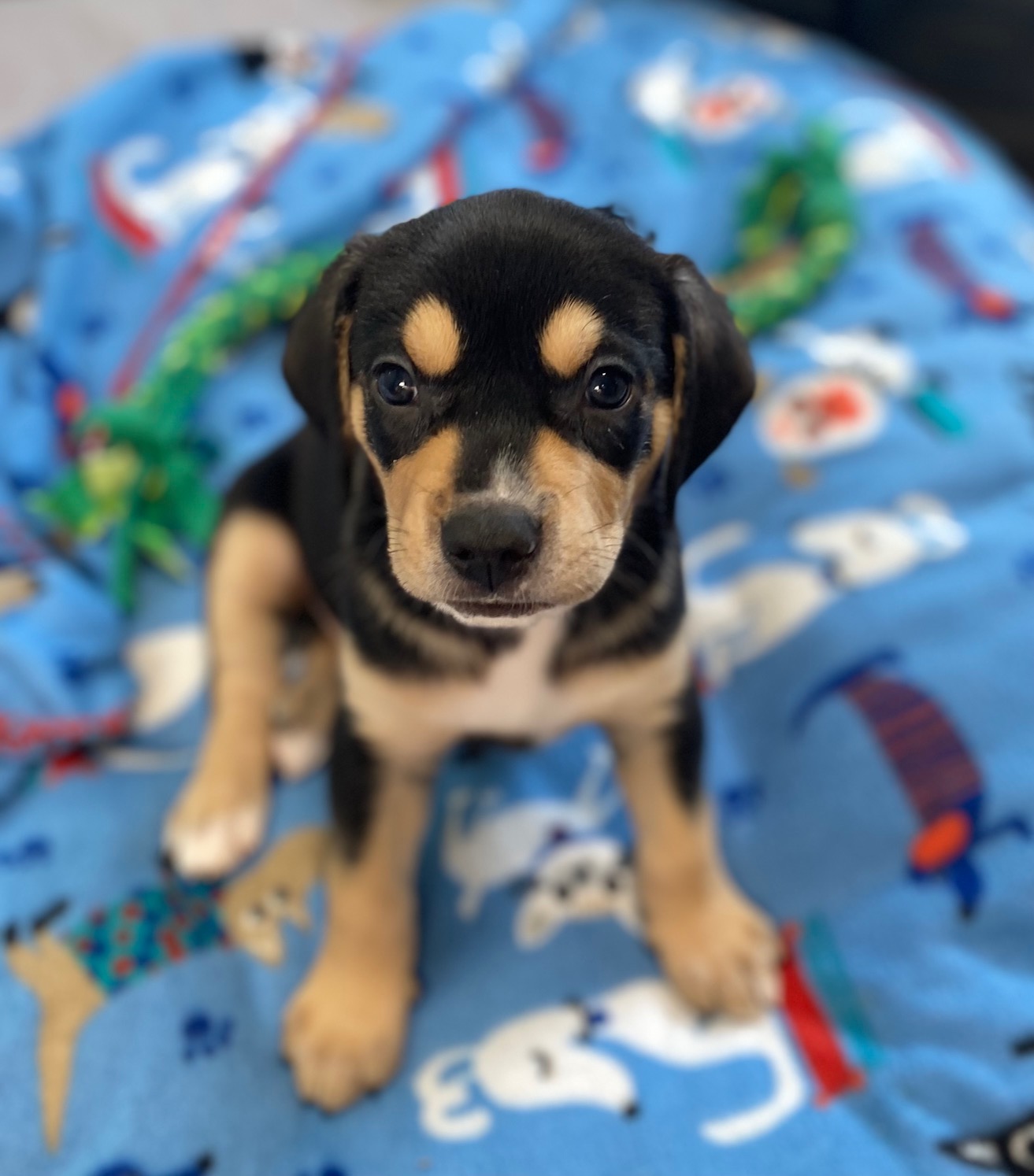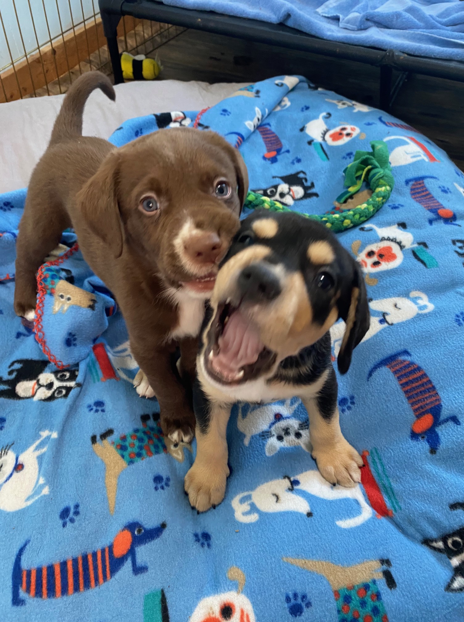 Bing is the black puppy with the defined markings of a rottweiler (in miniature). He is absolutely striking and has a gorgeous coat like a seal that is black with tips of gold. He is an independent guy who is content playing with a toy or chewing on a the zipties that hold the pen together. He is all in when invited to wrestle. He’s a great ‘poser’ (I can set him in a sit and take lots of pictures), so I think he’d make a great Instagram star, especially with those eyebrows and curious face.