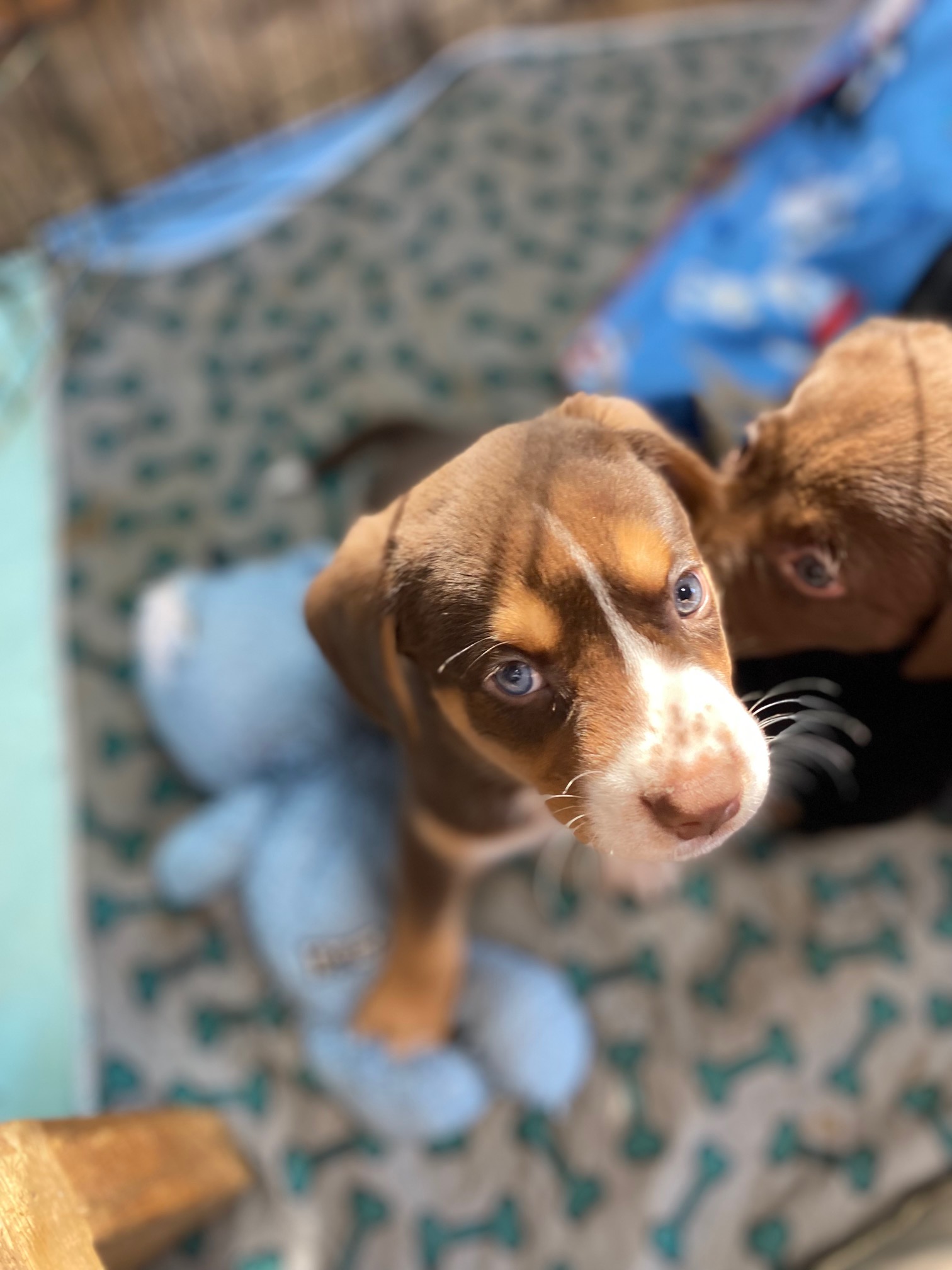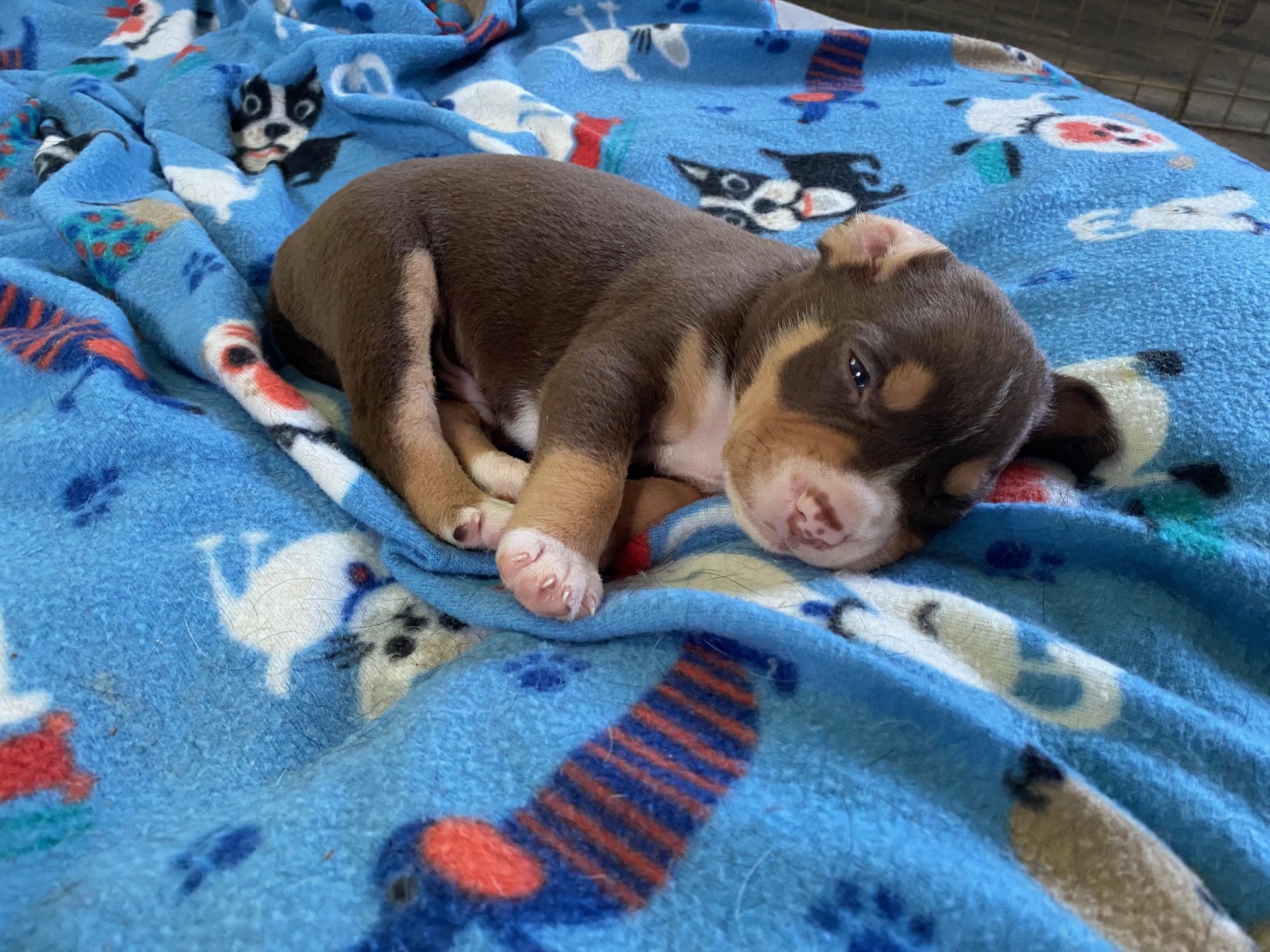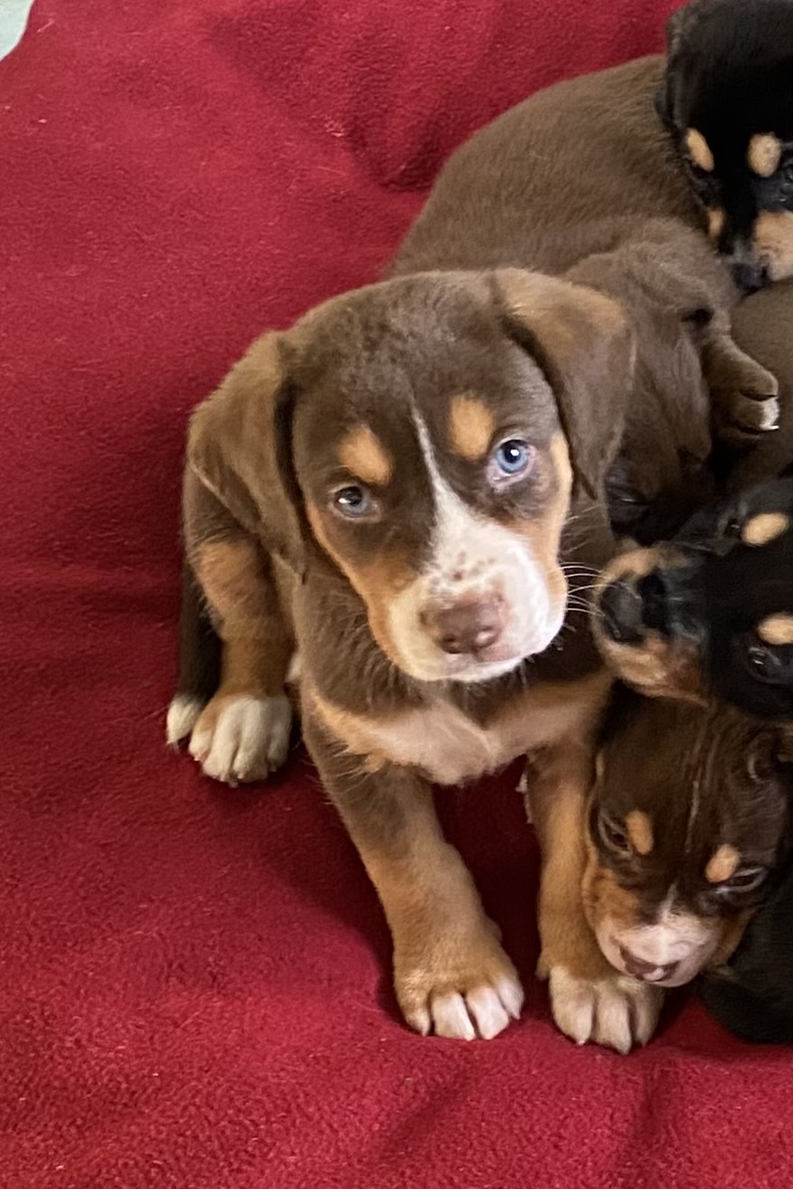Ranier is the smaller version of Maraschino. For a little guy, he is very solid and sturdy. He has a few drips of white fur on the back of his neck and the most interesting nose – partly white, partly brown, partly pink. He is a happy, busy guy who challenges his bigger brothers to wrestle all day long. He’s an excellent sleeper – often the last to wake and the one that disappears under the raised dog bed to nap.