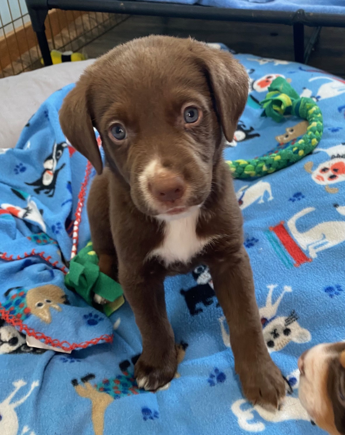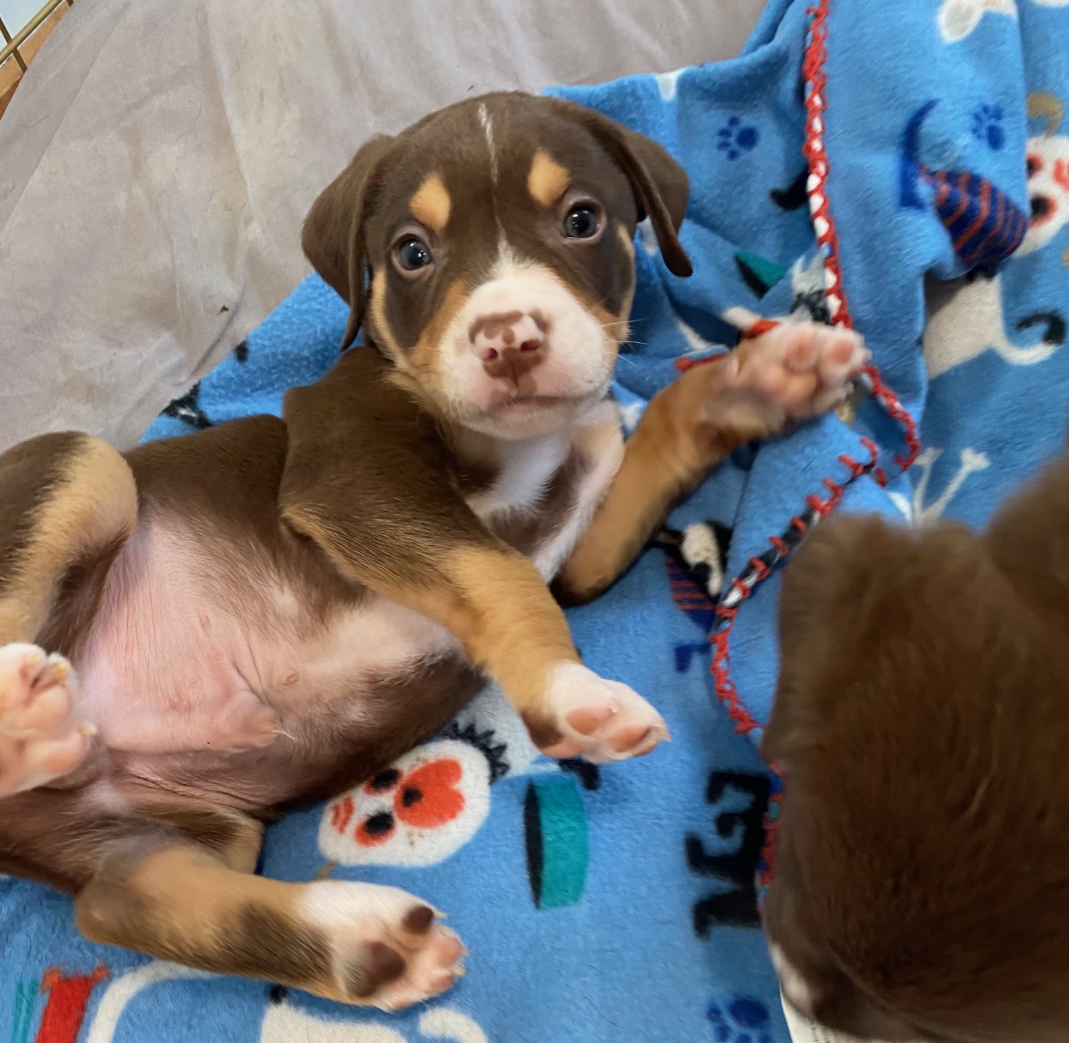 Utah Giant is the biggest of the pups (but not the heaviest – that goes to Bing!). He has the sweetest face with white markings slipping off the side of his nose. He is a sweetheart who loves attention and isn’t afraid to ask for it. He loves playing with his brothers and also wrestling with the Kong food dispenser (he knows there is food in there but hasn’t managed to get any of it out).