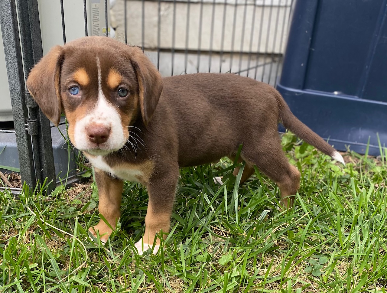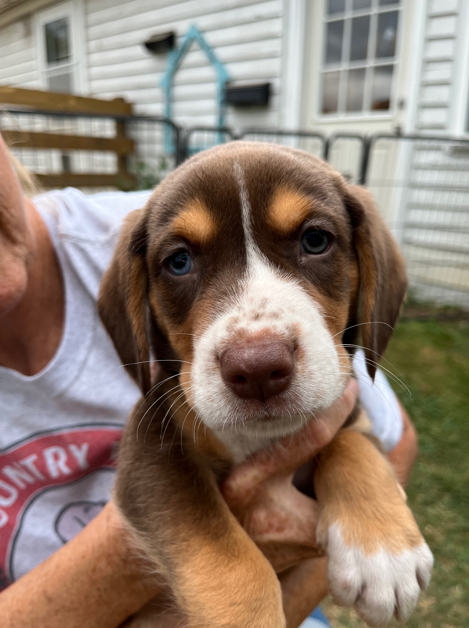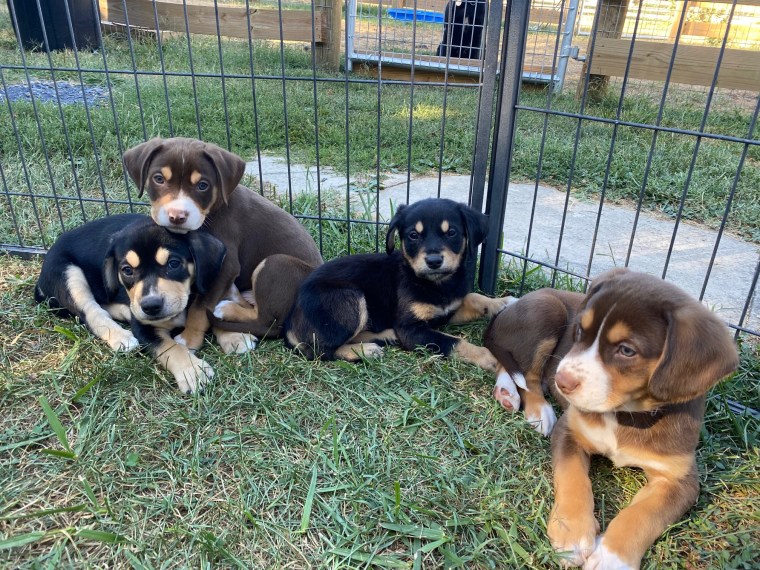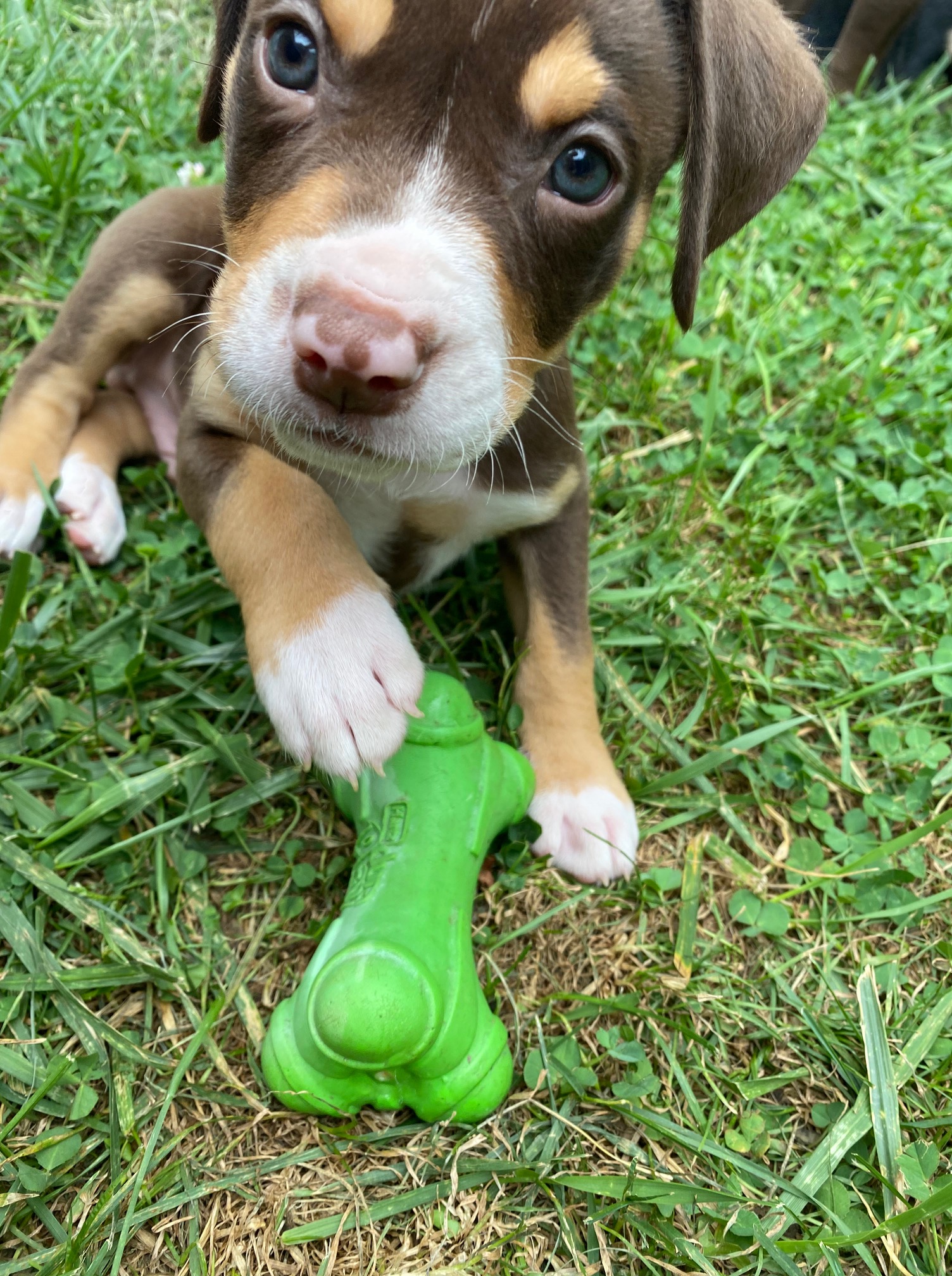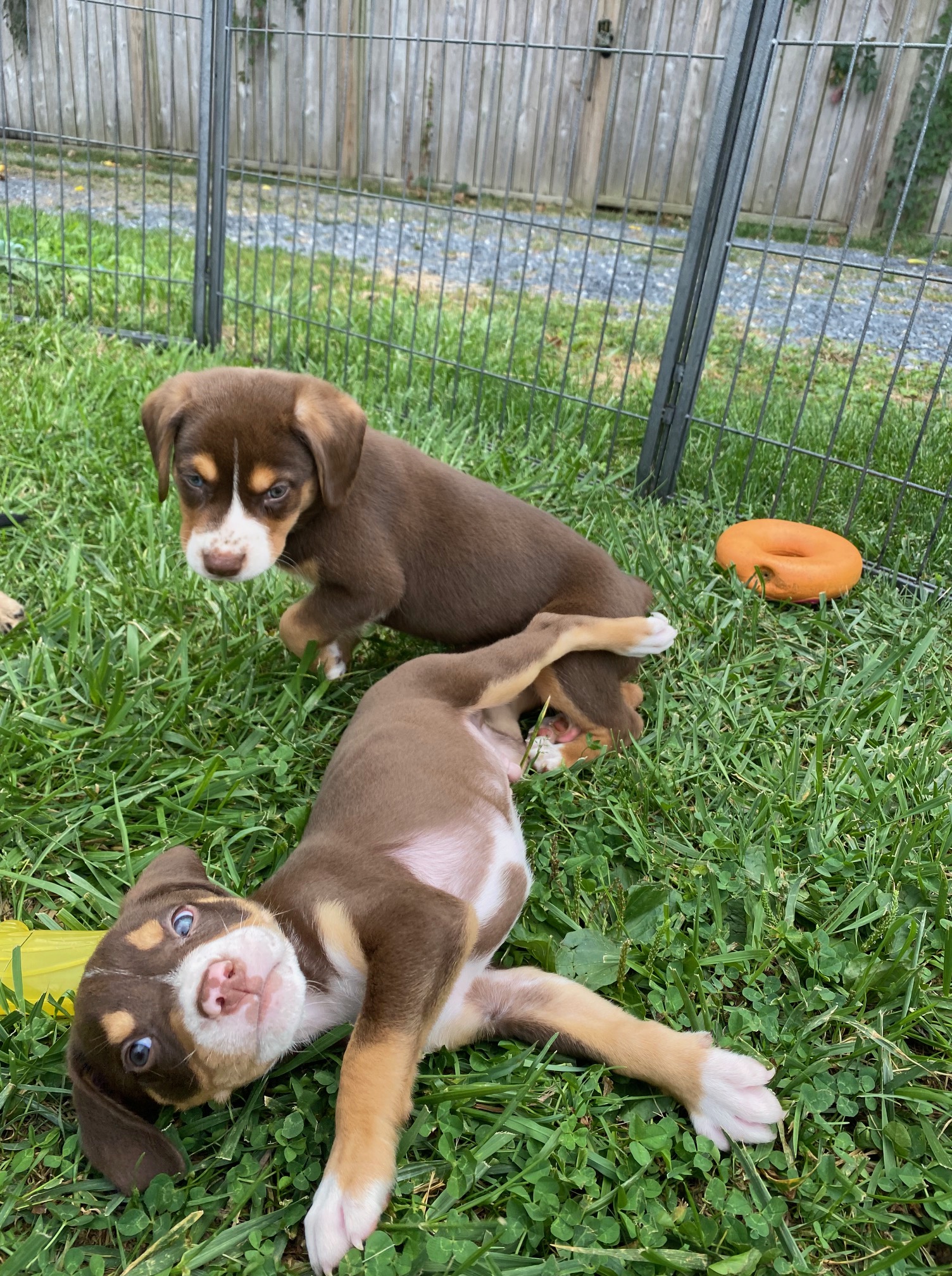 The puppies are one by one getting approved adopters. Being houndish puppies (my best guess, although I’m pretty sure there are probably a dozen different breeds in their DNA), they’ve required a few adjustments. Everyone is eating separately now to reduce the competitive eating urge and attempt to slow them down (adopters: you will want to purchase a slow-down or puzzle feeder!). We are also trying to get outside as much as possible, since clean up inside is a challenge as they grow and get more active.