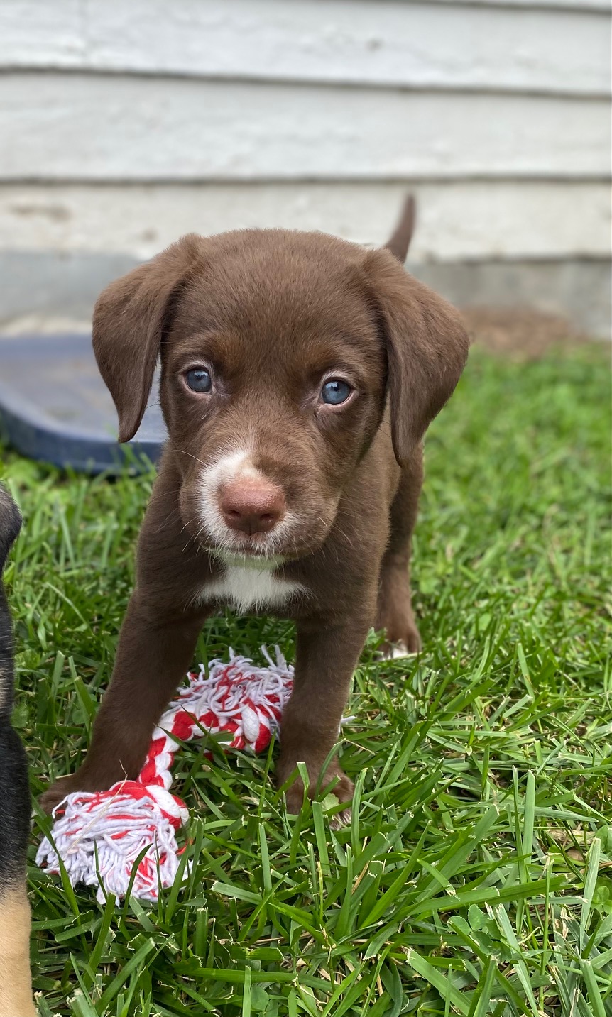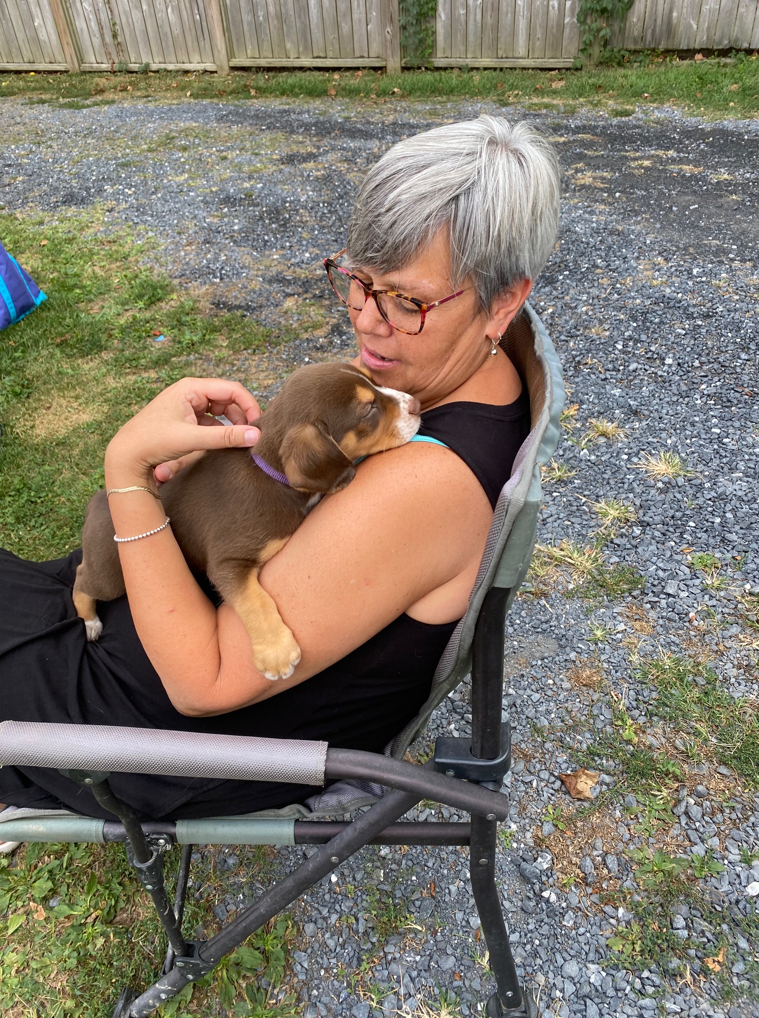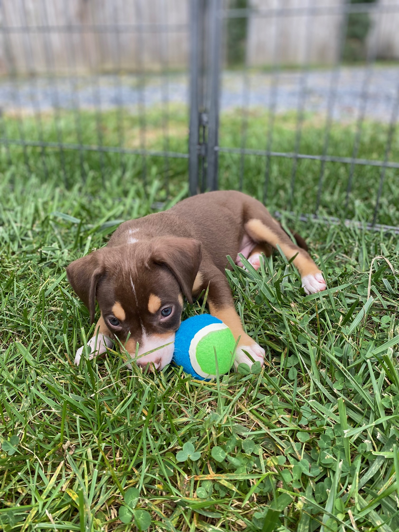 Only one of the puppies is still adoptable (but things change quickly when it comes to puppies!), and he’s my favorite! Tart is the smallest of this litter. He is a total doll baby that only wants to be in my lap. His eyes never leave me while I’m working in the pen or outside with the puppies or even at my desk. I can feel his silent, constant adoration at all times.