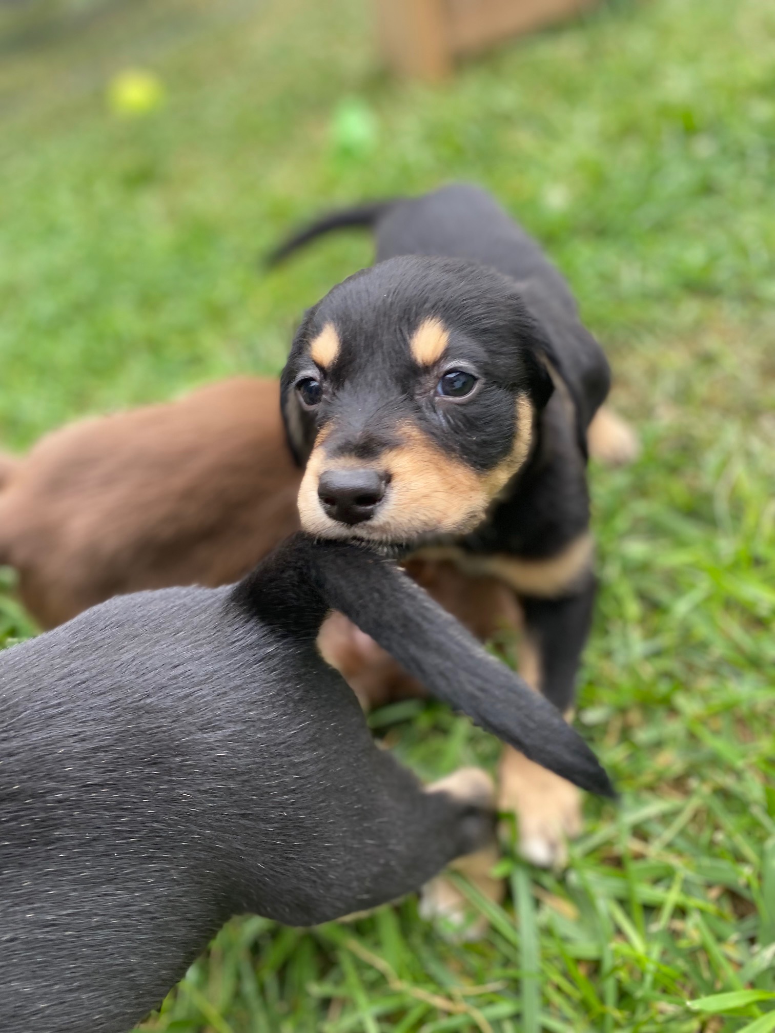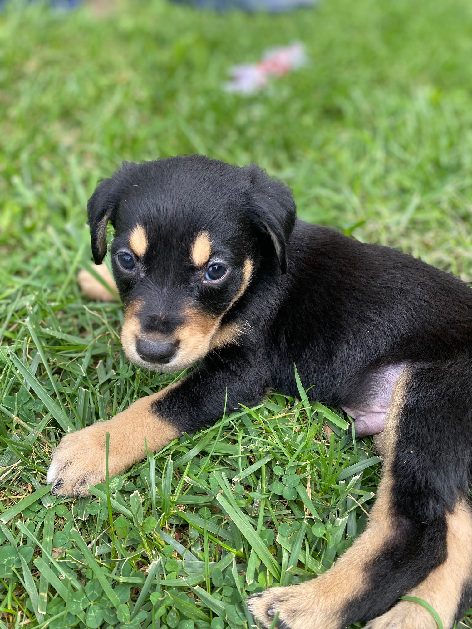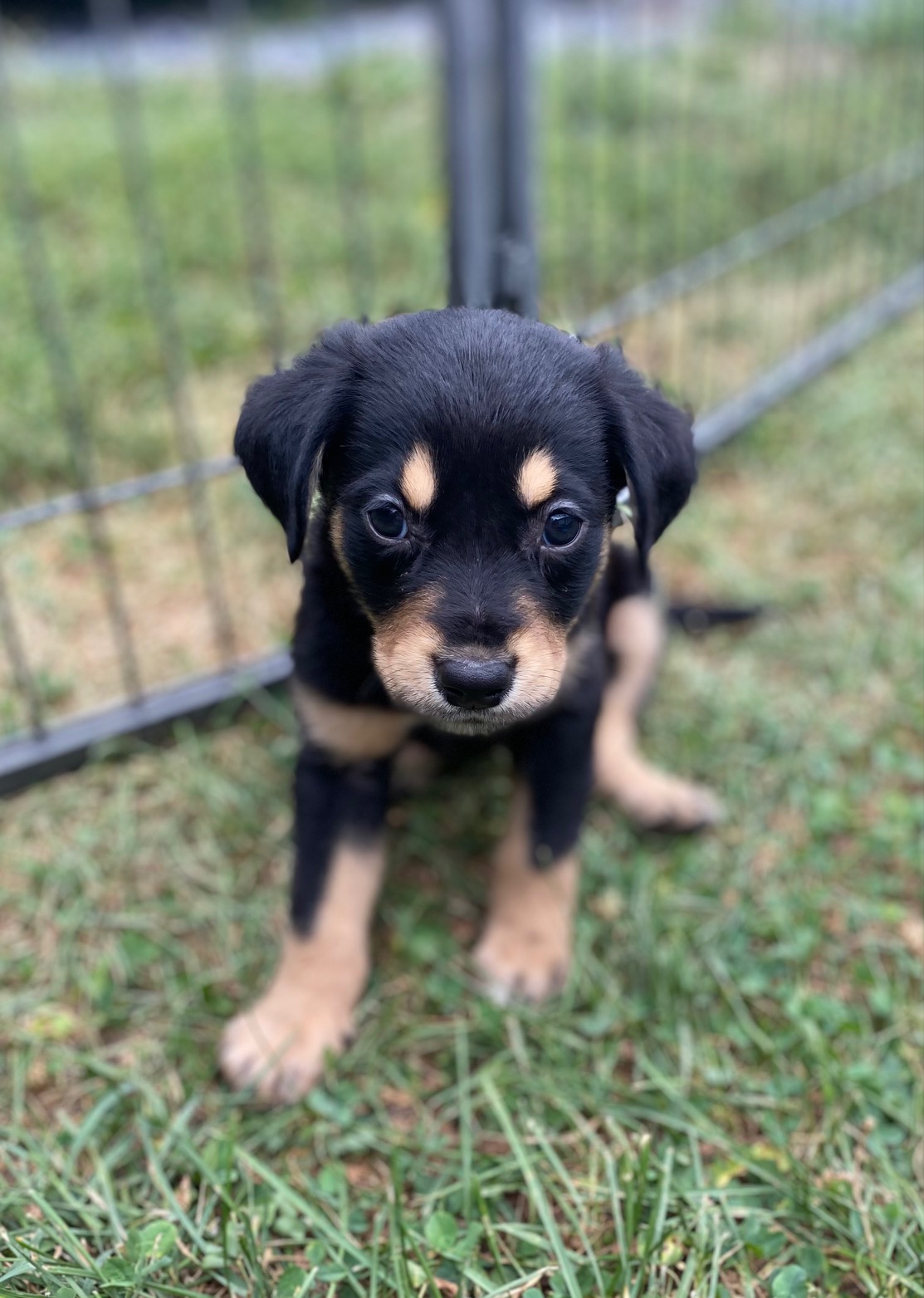 Tart is in the middle in terms of energy for this bunch, but often gets run right over by his larger siblings. He has beautiful markings, much like a rottweiler, but he won’t be a big dog (my guess) as he is just over five pounds at seven weeks of age. His fur is softer and slightly longer than his siblings and he is lighter-boned with a more compact build, as opposed to their elongated builds. It’s always interesting to see the wide variety within one litter of puppies, particularly scrumptious puppies like these! If you’d like to apply to adopt Tart, click here.